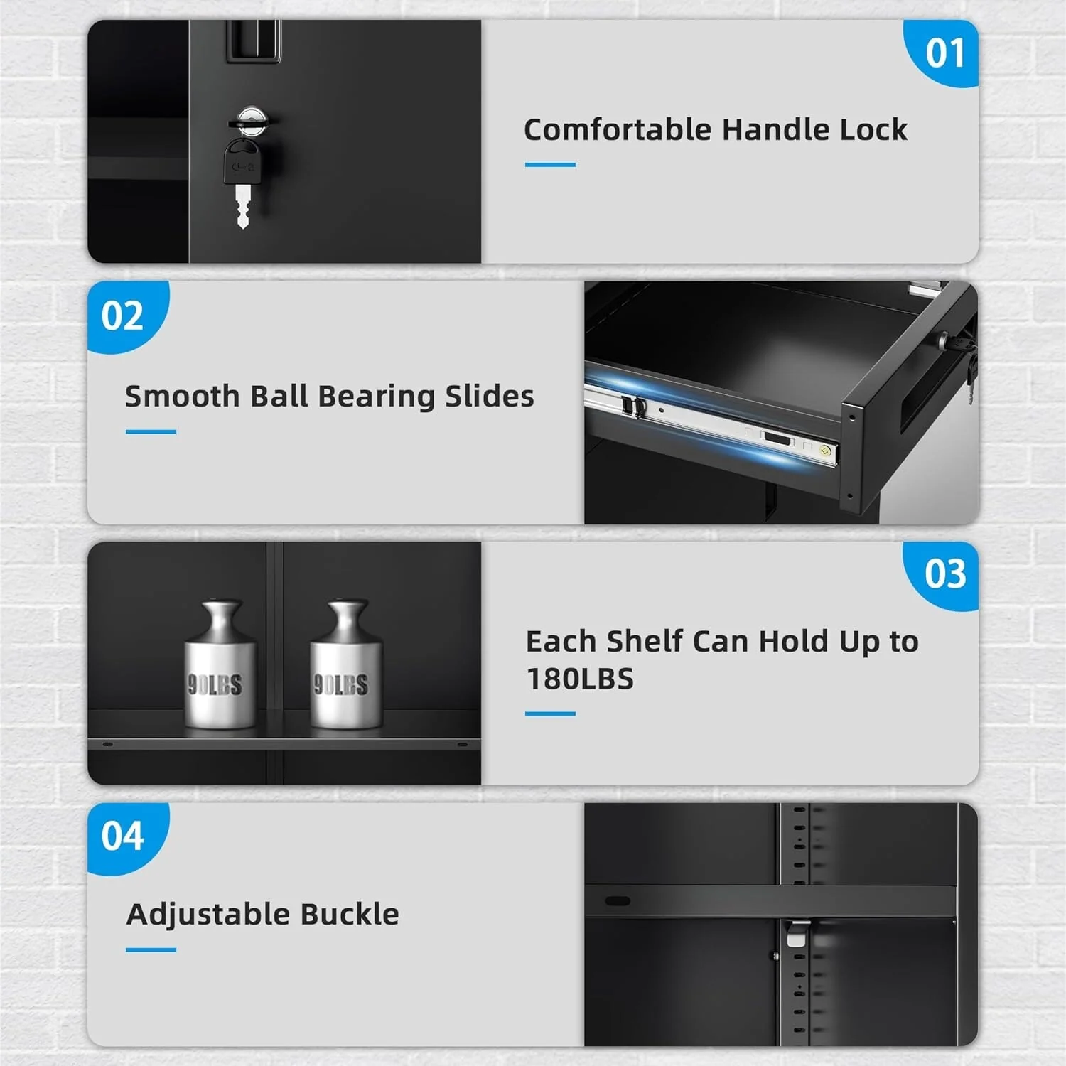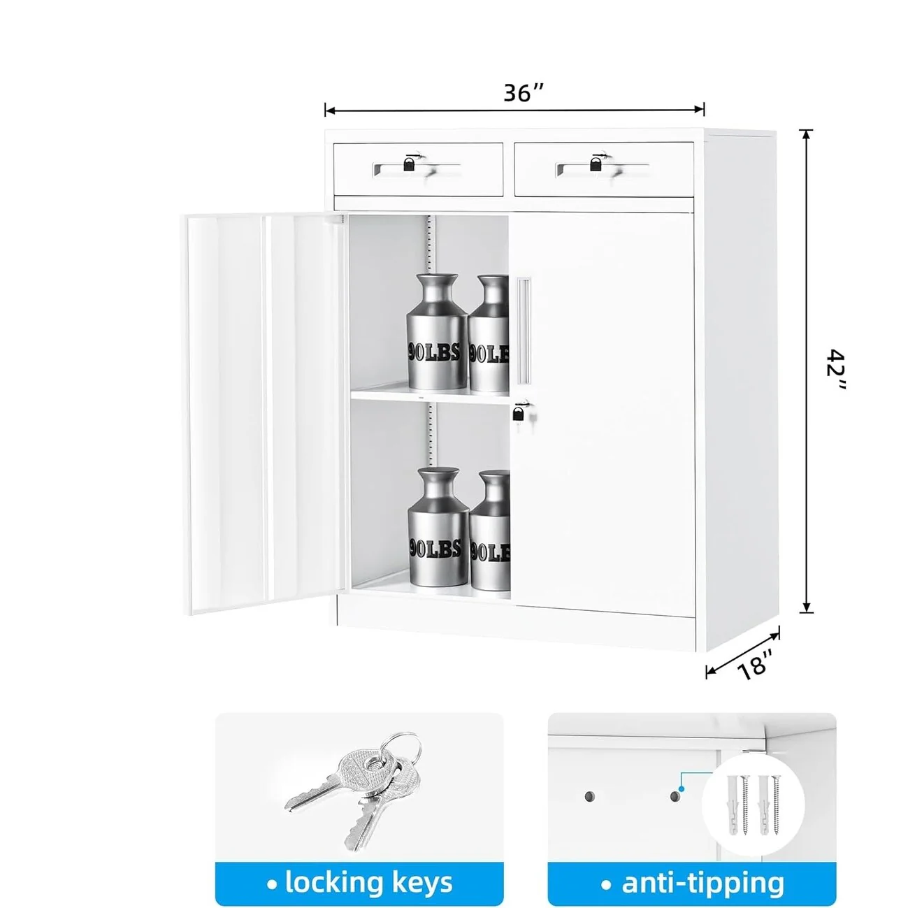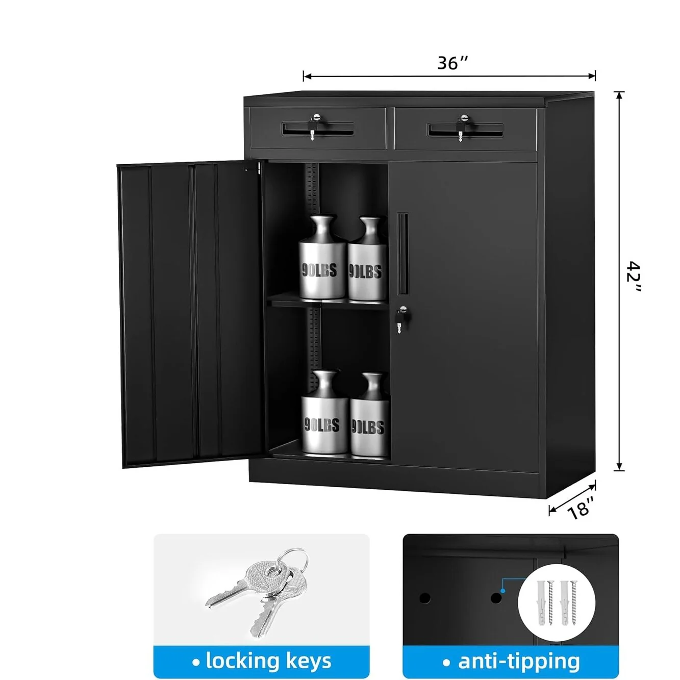 The lockable garage storage cabinet with 2 drawers and 2 doors can store different types of documents and items in different areas. The lower layer of a metal storage cabinet with drawers can store various sizes of documents, books, or other office and household tools. The shelves of the office storage cabinet can withstand a weight of 180 LBS, which is suitable for storing some heavy household tools. The size of the tool cabinet is 42"H* 36"W* 18"D, which is suitable no matter where it is placed. Lockable storage cabinet has been updated with a new secure 3 point lock system, and each storage area can be locked. The file cabinet can effectively protect various personal items, documents, and valuable items, making it very suitable for use at home, office, garage, and school.