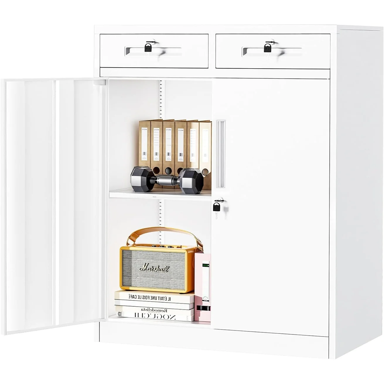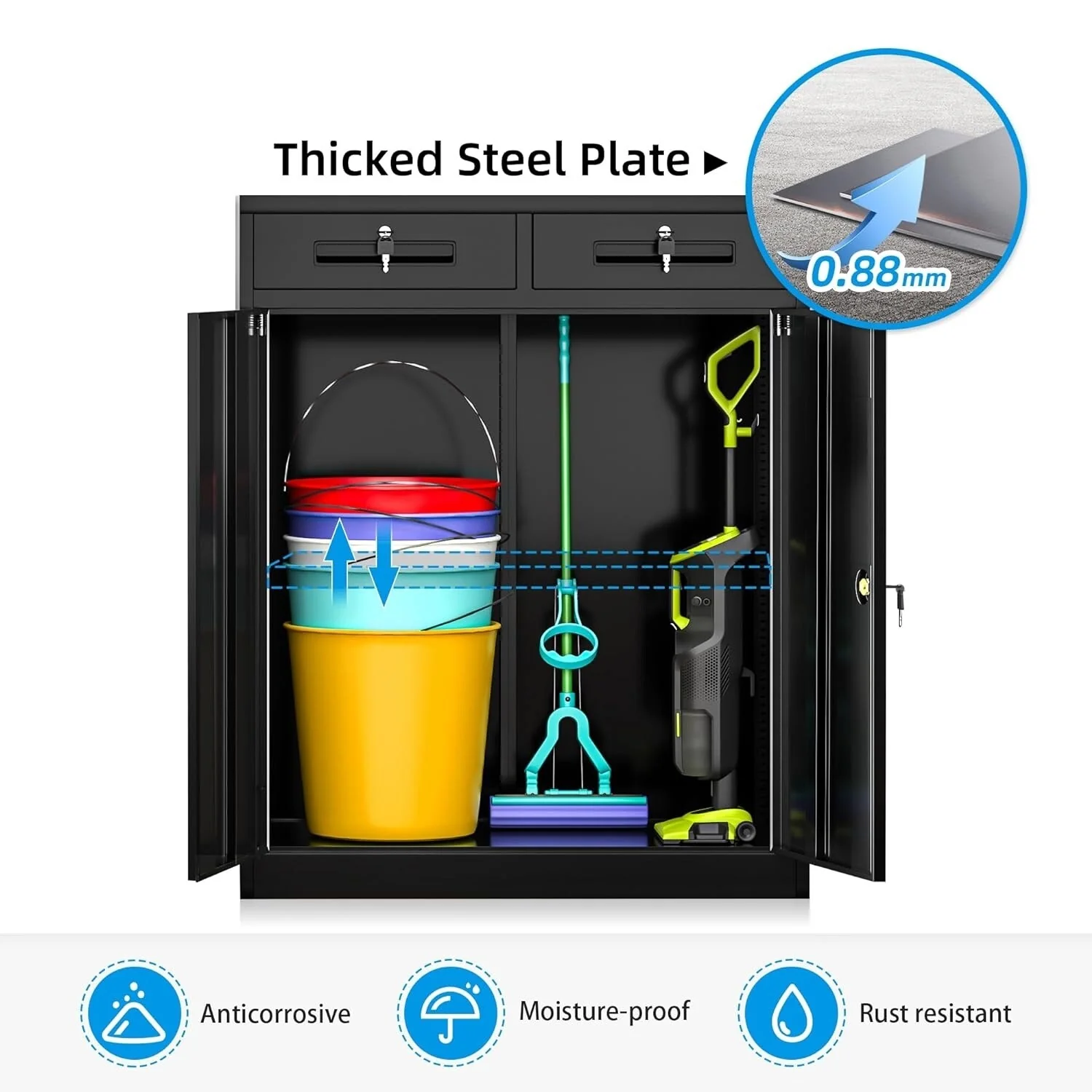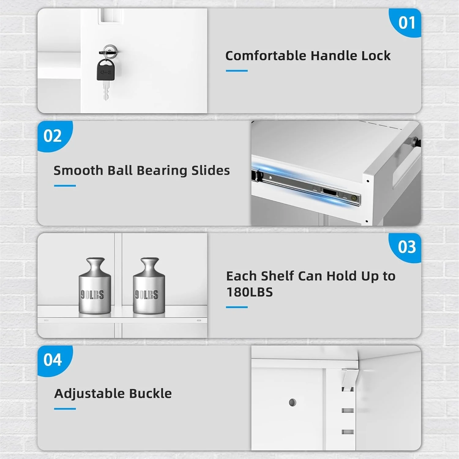 The lockable garage storage cabinet with 2 drawers and 2 doors can store different types of documents and items in different areas. The lower layer of a metal storage cabinet with drawers can store various sizes of documents, books, or other office and household tools. The shelves of the office storage cabinet can withstand a weight of 180 LBS, which is suitable for storing some heavy household tools. The size of the tool cabinet is 42"H* 36"W* 18"D, which is suitable no matter where it is placed. Lockable storage cabinet has been updated with a new secure 3 point lock system, and each storage area can be locked. The file cabinet can effectively protect various personal items, documents, and valuable items, making it very suitable for use at home, office, garage, and school.