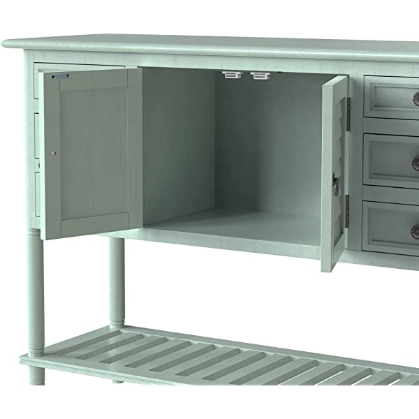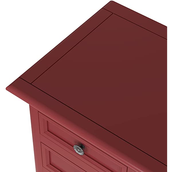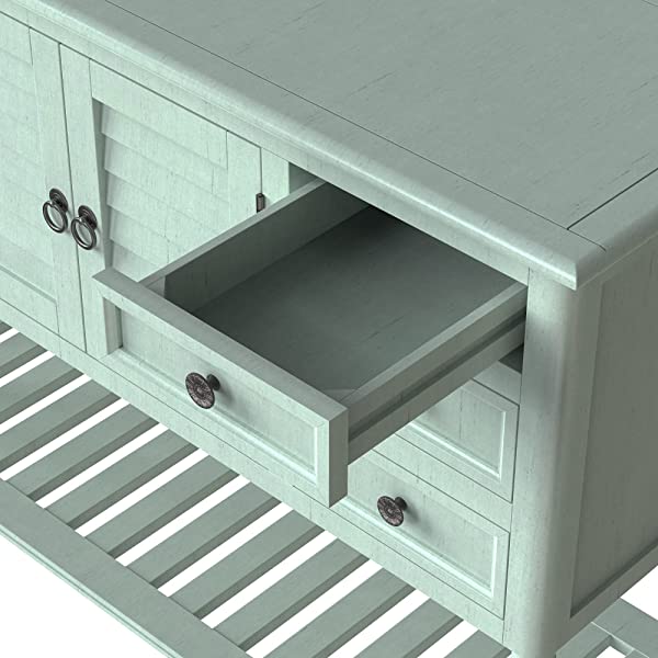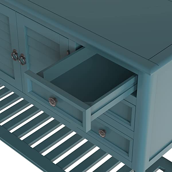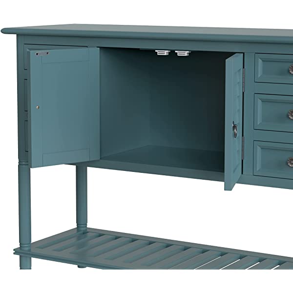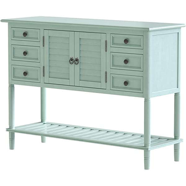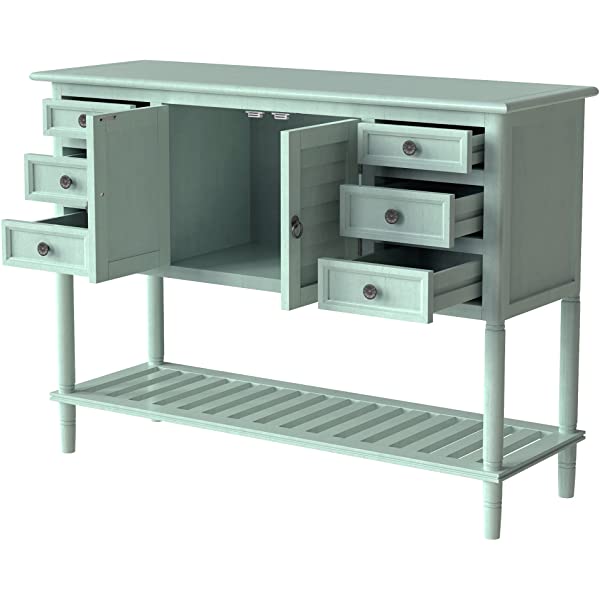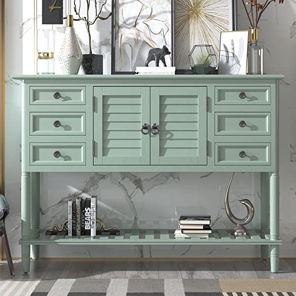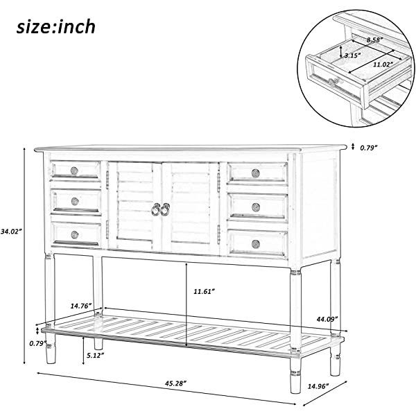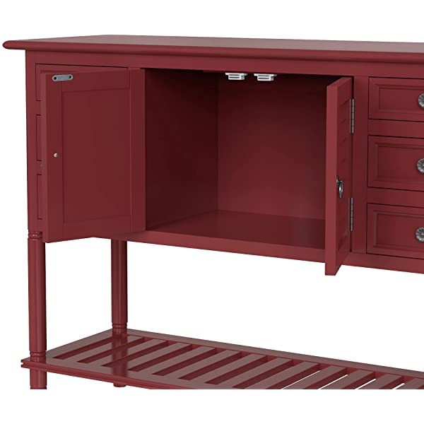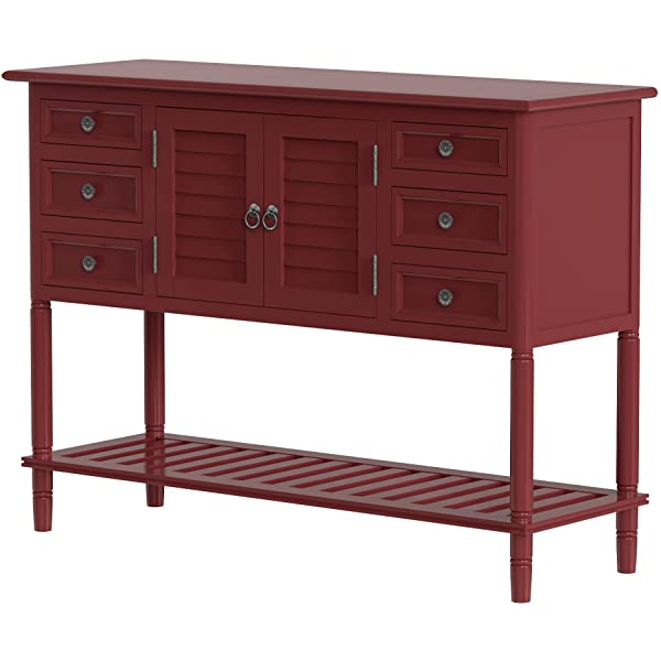 【Easy Assembly】Manufactured for easy assembly, a single person can quickly put this console table with the straight forward step by step instructions with tools included. Large cabinet weight capacity: 27 lbs, table surface weight capacity: 99lbs, Accent drawer weight capacity: 18lbs. 【Eye-catching Versatility】Crafted for versatility, this piece can enhance a variety of spaces and surrounding decors acting as the perfect piece to bring life into any area of your home that needs it most. Great for entry hallways, dining rooms, bedrooms and more. 【Manufactured for Quality】Thick slabs of Pine and MDF wood are expertly crafted for a quality build with solid base legs. Features a veneer reinforced upper surface to prevent wear after prolonged usage. 【Mixture of Modern & Vintage Elements】Aspects of both modern and vintage come together to create this unique piece, featuring farmhouse inspired wood frame detailing on the outer drawers with contrast from the iron handles for heightened appeal. 【Large Storage Space】With built in shelving ranging from the front double doors to the 6 drawers, users will have plenty of space to store their belongings and avoid letting clutter accumulate on the console table. Color:Red Weights & Dimensions Overall:45.28''Wx14.96''Dx34.02''H Desktop Thickness:0.79’’ Shelf:44.09''Wx14.76''Dx5.91''H Shelf Thickness:0.79’’ Clearance to Floor:5.12’’ Internal dimensions of drawer:11.02’W’x8.58’D’x3.15’’H11.02’’Wx8.58’’Dx2.56’’H Internal dimensions of cabinet:19.29’’Wx13.78’’Dx13.39’’H Overall Weight:55.12 lbs Specifications Table Material:Solid + Manufactured Wood Table Base Material:Solid Wood Base Material Details:Pine Drawers Included:Yes Number of Drawers:6 Cabinets Included:Yes Number of Cabinets:1 Shelves Included:Yes Number of Shelves:1 Weight Capacity:99 Pounds The Connection Method Between Boards:DovetailMortise and TenonBasic Butt Supplier Intended and Approved Use:Residential Use Country of Origin:Viet Nam Notice:Real Product’s Color may be a little different from the image due to the lighting or monitor’s display