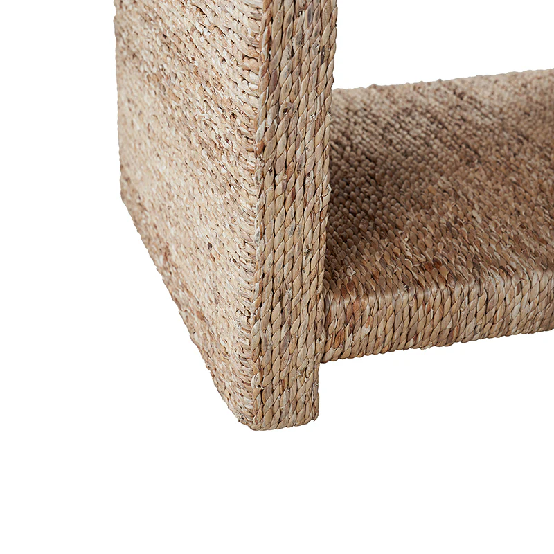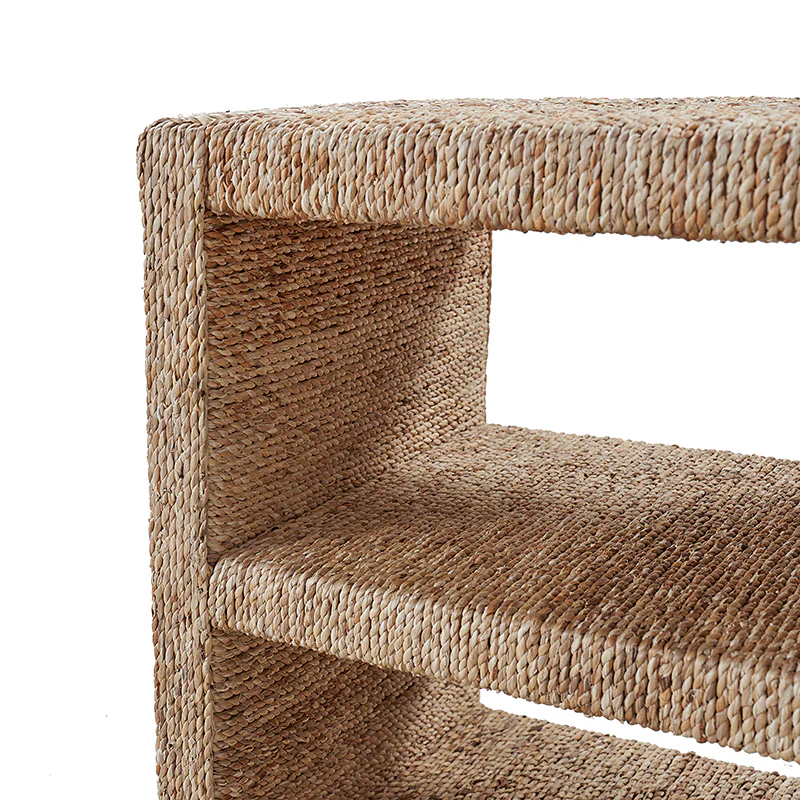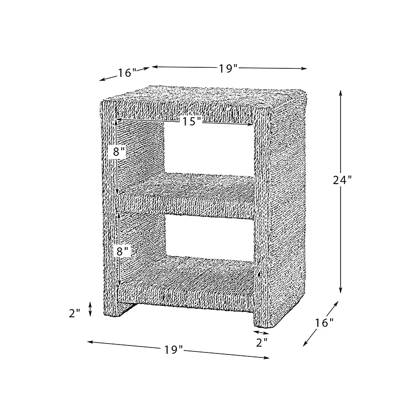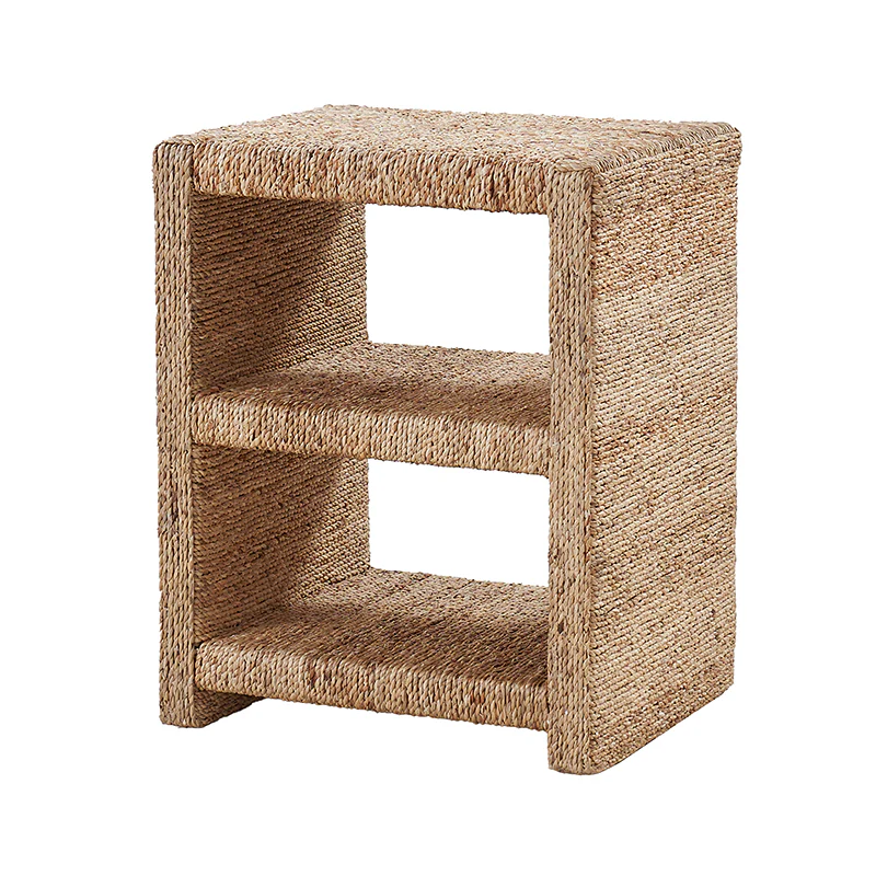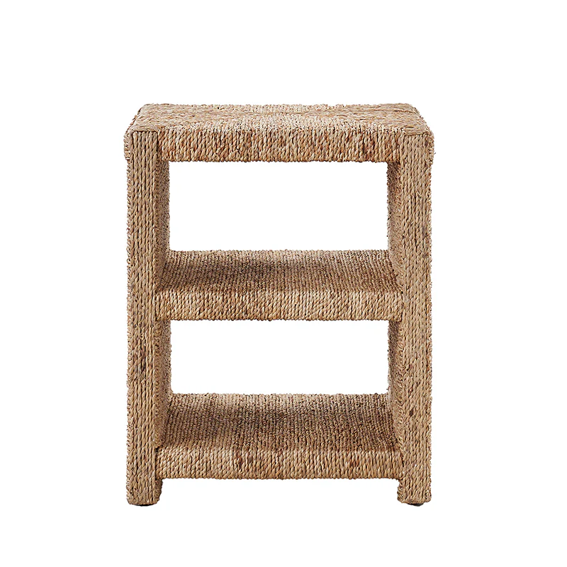 This side table embodies the coastal style, adding a touch of seaside charm to any interior space. Crafted with meticulous attention to detail, it features a delightful grass rope design, evoking the natural textures of coastal landscapes. The table boasts two open shelves, providing ample storage or display space for your favorite decor items, books, or essentials. Its versatile design is perfect for various places, making it suitable as a living room side table or a stylish nightstand. Whether you're looking to create a coastal retreat in your home or simply infuse a dash of beachy elegance into your decor, this grass rope side table is the perfect choice to achieve that relaxed, coastal ambiance.