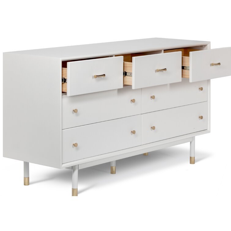This dresser features clean lines and gold-capped feet for glam and modern look in your bedroom. It's crafted from wood with a chic, neutral finish, and it's built on five slender legs. The drawers feature gold handles for an extra layer of chic, and they each open up on ball-bearing glides to reveal room for clothes, extra bedding, and delicates. This dresser also has a spacious 60" wide surface that easily displays framed photos or a table lamp. Plus, it includes a tip-over restraint device for added safety.