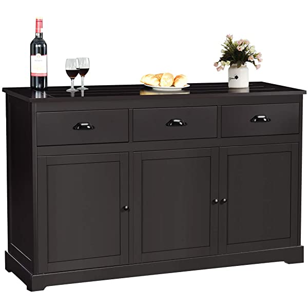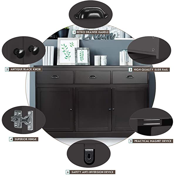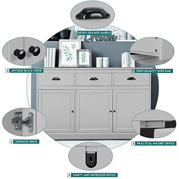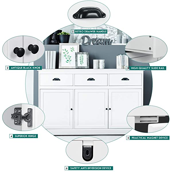 〖Easy to Keep Clean and Assemble〗: The drawers and cabinets with handles are comfortable grip and easier pullout. Besides, this table need simple assembly and the instructed included. You can use it after simple installation. 〖Spacious Tabletop & Ample Stprage Space〗: This table desktop is made of MDF with melamine cover , large and smooth top surface not only allows placing more items and perfect to touch but easy to clean and maintain . 〖Versatile Usage Meet Your Demands〗: Because it is stylish and practical, so it doesn't matter where you put it. This table can be put in the entryway to be used to shoe cabinet ,the drawers can storage the key and small items ,the chest can storage the shoes. Besides, it can be used as cupboard for storage kitchen accessories. Of course, it can also be used as a display table to place crafts and plants. 〖Long-Lasting Cabinet Frame〗: This console table is made of solid MDF material with melamine cover which is sturdy and durable. In addition, the design shape of the foot increases stability. 〖Modern Buffet Sideboard & Storage Cabinet〗: This sideboard table features 3 drawers and 3 doors with white finish create instant charm in your home. The lovely white finish and stylish design add a sense of elegance. And, it is perfectly decor your house. Color:White DescriptionDo you want to add extra storage space to your kitchen? Do you like to add a unique charm to your living room? Want to add a practical and elegant shoe cabinet to hallway? Well, it's right to opt for this chic, versatile cabinet. Buffet cabinet using thick MDF and particleboard, the overall structure is firm and not easy to shake. In addition, use of P2 grade plate, environmentally friendly and harmless. The unique buffet has three spacious drawers to facilitate your items, such as napkins, keys and other small items. Two cabinets with adjustable shelves are perfect for storing items of different heights. The simple and elegant style adorns the house while providing ample storage space. This beckoning storage cabinet is never let you down!Features:Sideboard with drawers and cabinets which made of solid MDF and particleboard with high-quality paintThis buffet combines aesthetics and practicality, ample storage space while add charm to your roomClassic white finish adds to the elegant flavor of the product, adding a unique charm to the homeSpacious sideboard top great for home items storage and display.With adjustable shelves to meet your needsThe exquisite drawer handles is easy to useHigh-quality hinge do not rustSolid construction plus thick and eco-friendly P2 grade board, featuring high capacityIdeal for kitchen, dining room, living room and hallwaySimple installation and easy maintenanceSpecification:Color: WhiteMaterial: MDF &Particle BoardDimension: W53.5"xD17"xH34"Drawer dimension: W14.5"xD13.5"xH4.5"Shelf adjustable height:1.5"Item weight:50.5lbsBoard capacity:22lbsDrawer capacity:7lbsPackage Include:1x Sideboard1x ManualNote: This cabinet you received is in two boxes.