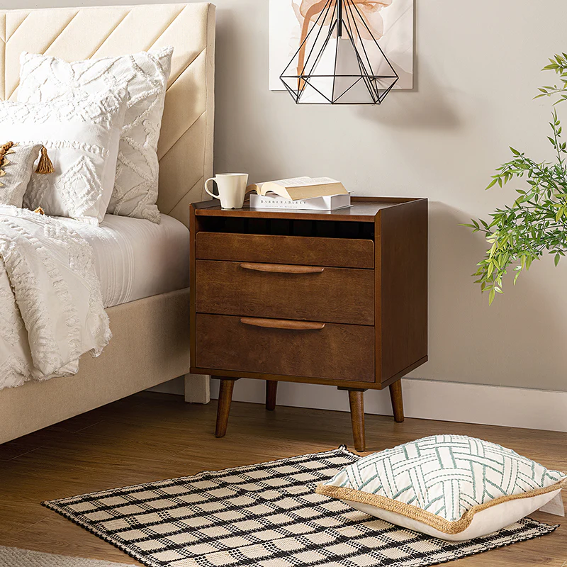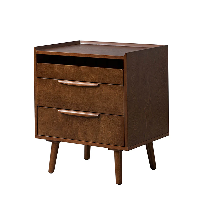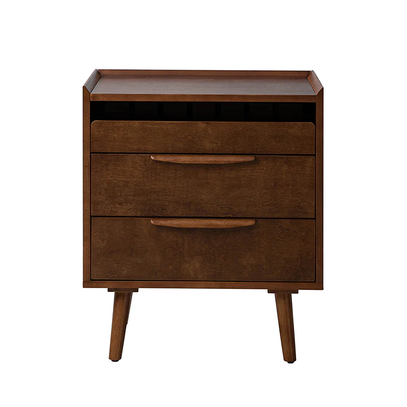 This is a sleek and functional 3-drawer mid-century nightstand with a charging station. It features a half-covered drawer with a wire management system and charging station on the back of the pull-out shelf, and two regular drawers with wood handles and metal slide rails that smoothly glide open and closed. The quality of the paint surface is guaranteed which is not easy to fall off after a long time. The surface of nightstand is waterproof, and the stains are easy to wipe. The nightstand sits on four wood tapered legs, giving it a mid-century modern look, and the top surface has a raised design for extra security. With ample storage space and a stylish appearance while also keeping your electronic devices organized and charged.