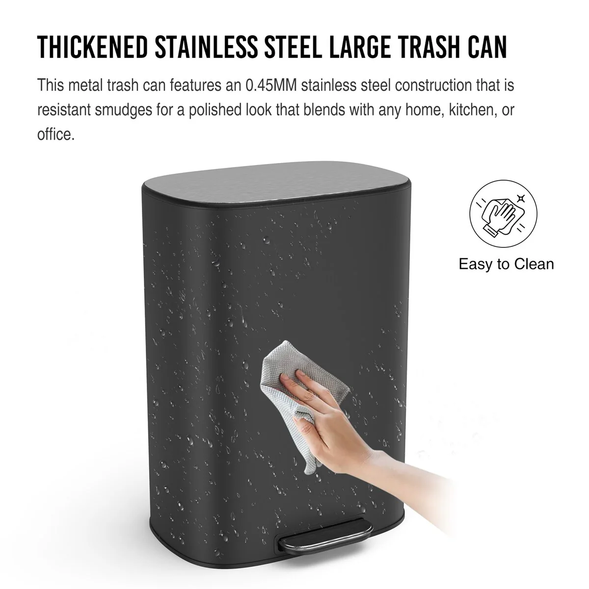 High quality all stainless-steel thickened trash can body by 0.45MM stainless steel material production. Compared to most 0.3MM materials trash can on the market, our stainless steel trash can are less prone to deformation and are stronger in use! High-quality410 stainless steel and ABS construted, our trashcan is build to last!