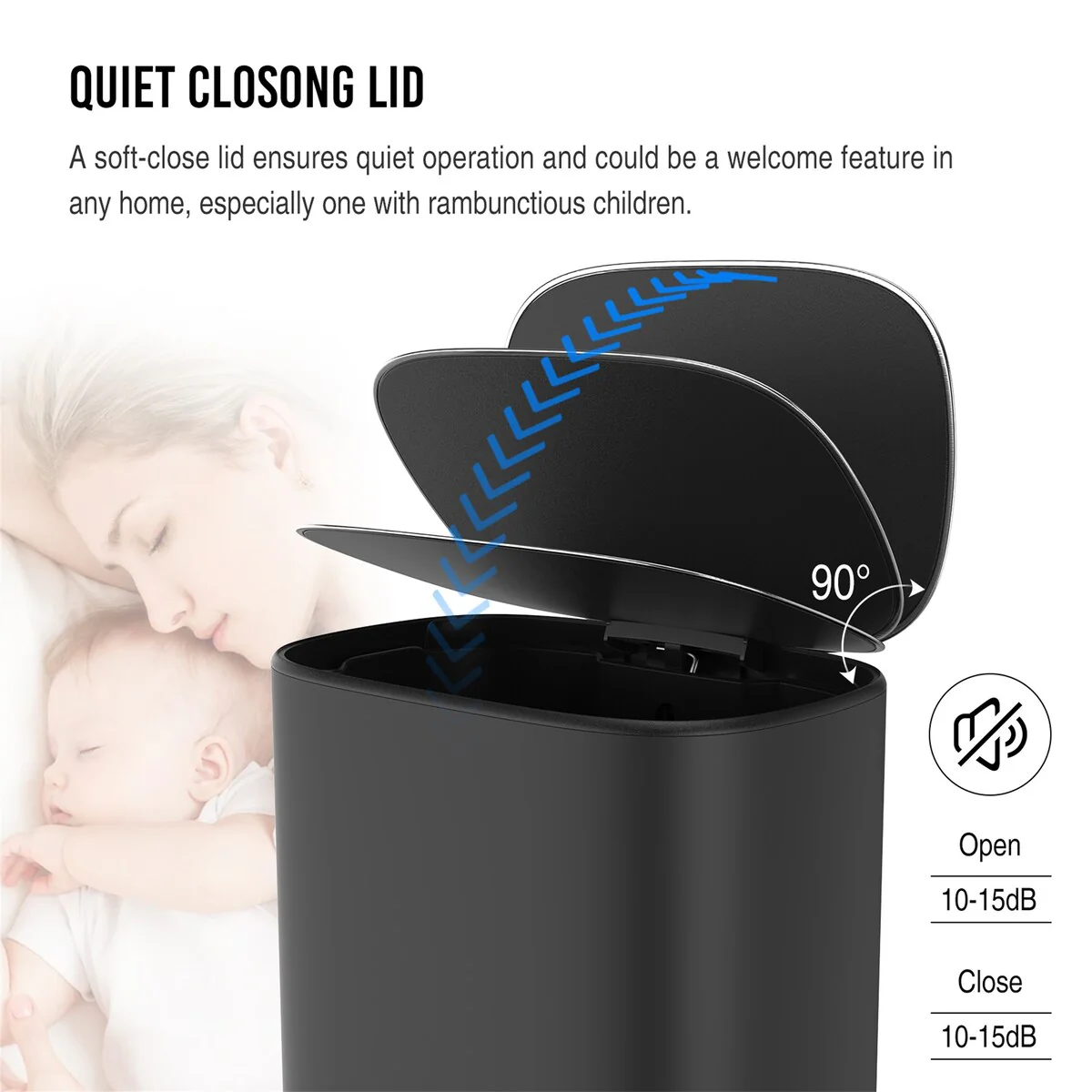 Lid features a stay-open mode to easily remove and replace garbage bags and dispose waste. Soft-close lid reduces noise from opening/closing and extends product life span. The lid closes with hardly any sound, if the person next to you is taking a nap,there is no need to worry about disturbing them with this bin.