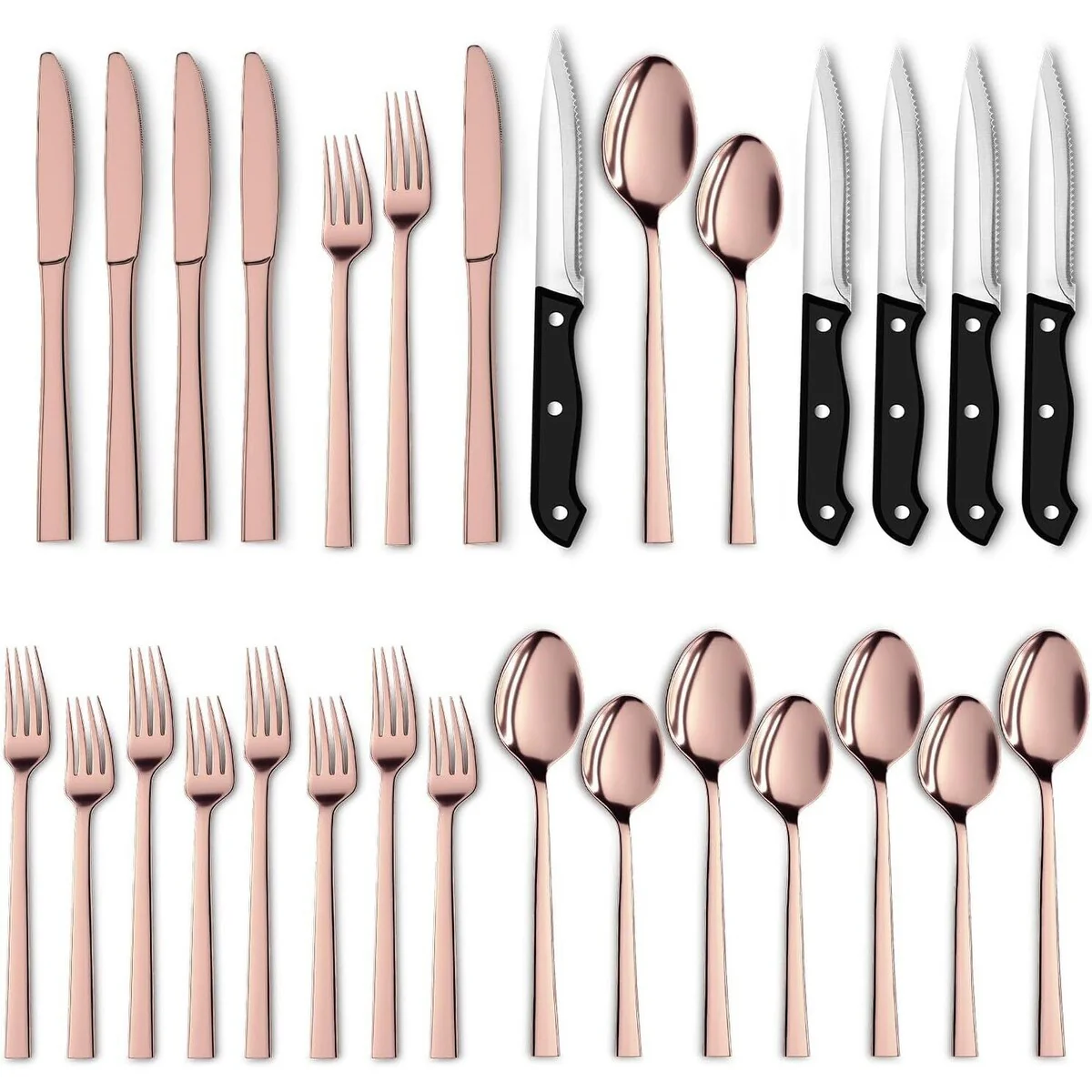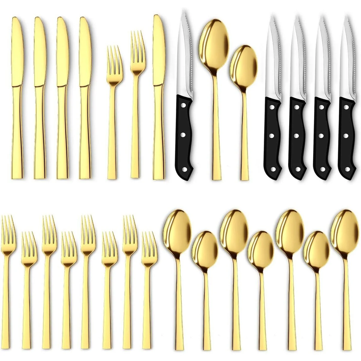 30 PCS SILVERWARE SET FOR 5 - Our complete Flatware Set includes 5 units of Dinner and Steak Knives, Dinner Spoons and Forks (L and S), and Tea/Dessert Spoons. The Kitchen Sets for Home are an indispensable dining accessory that adds value to any dining experience.