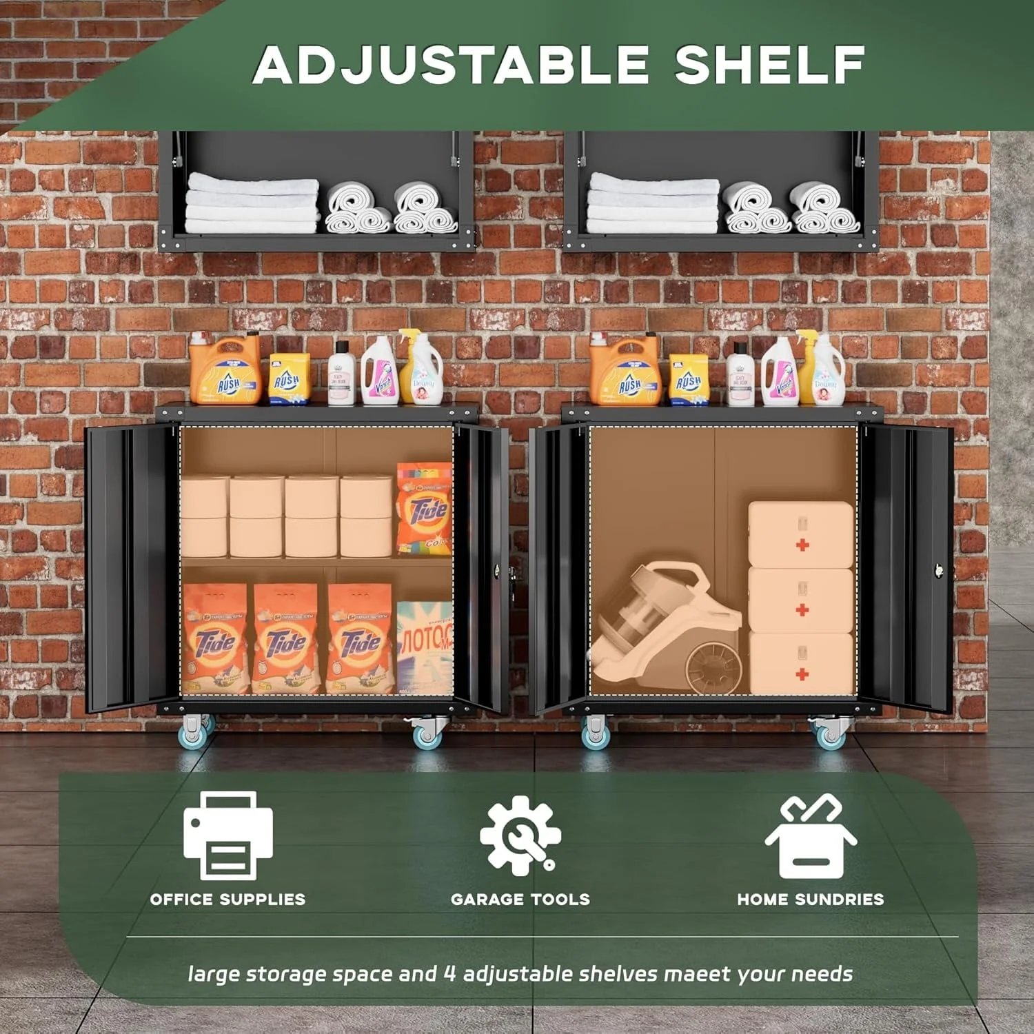 75" metal storage rolling cabinet has a large capacity to store your belongings. Equipped with 2 locking hinged doors and 4 Adjustable Shelves. Garage steel cabinet the best choice to keep your personal items and documents safe in any garage, home, office, utility room, laundry room.