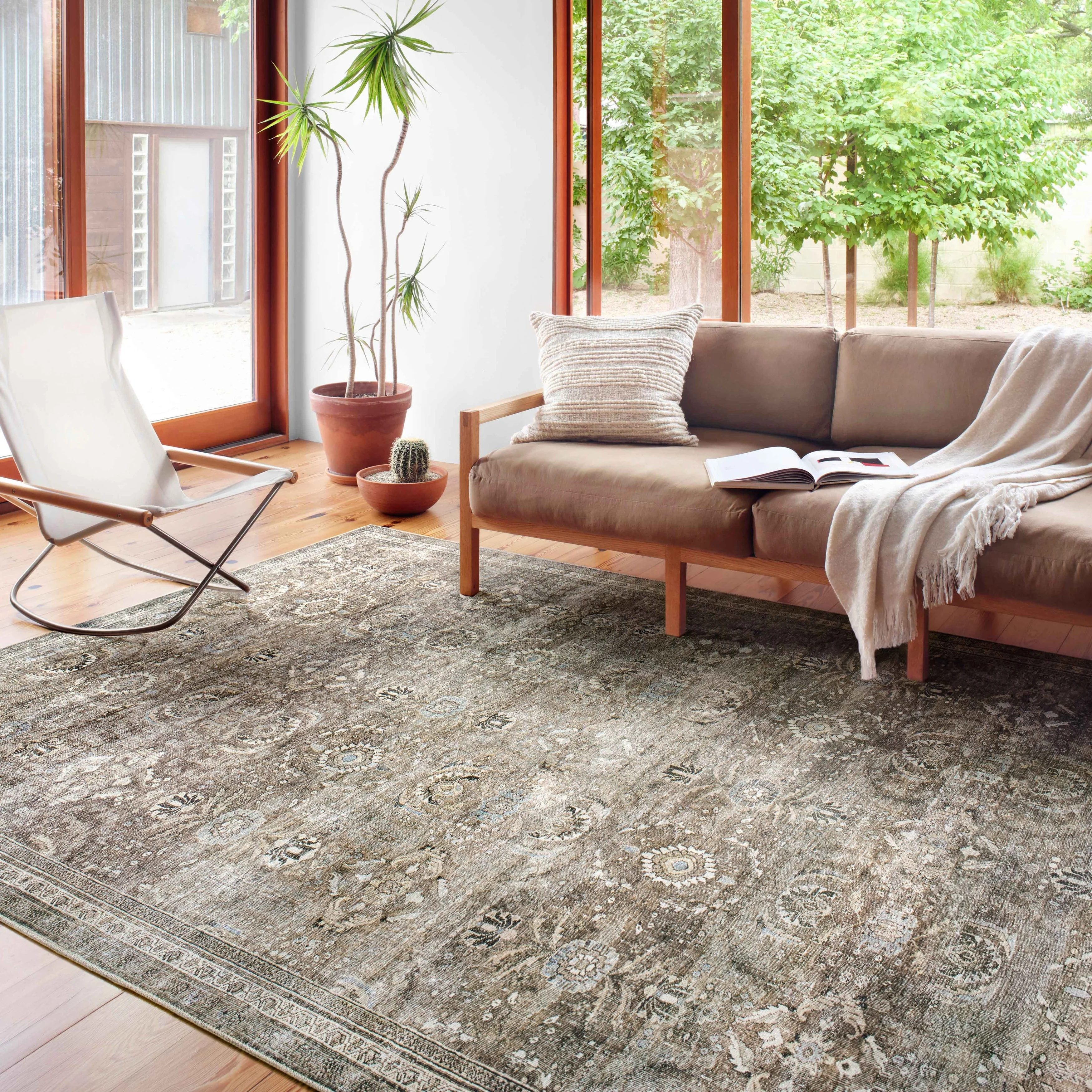 • Moss-green, beige, and brown hues