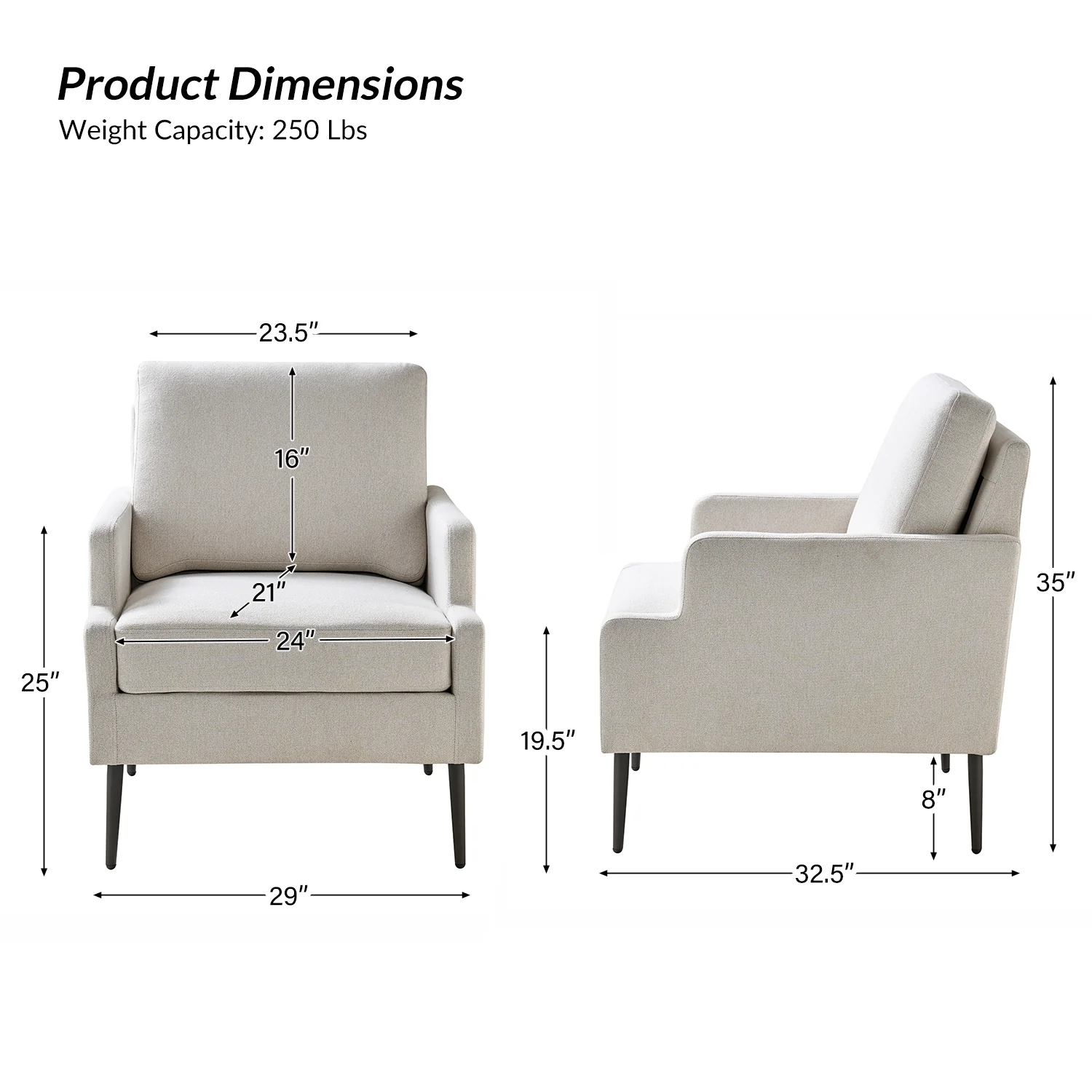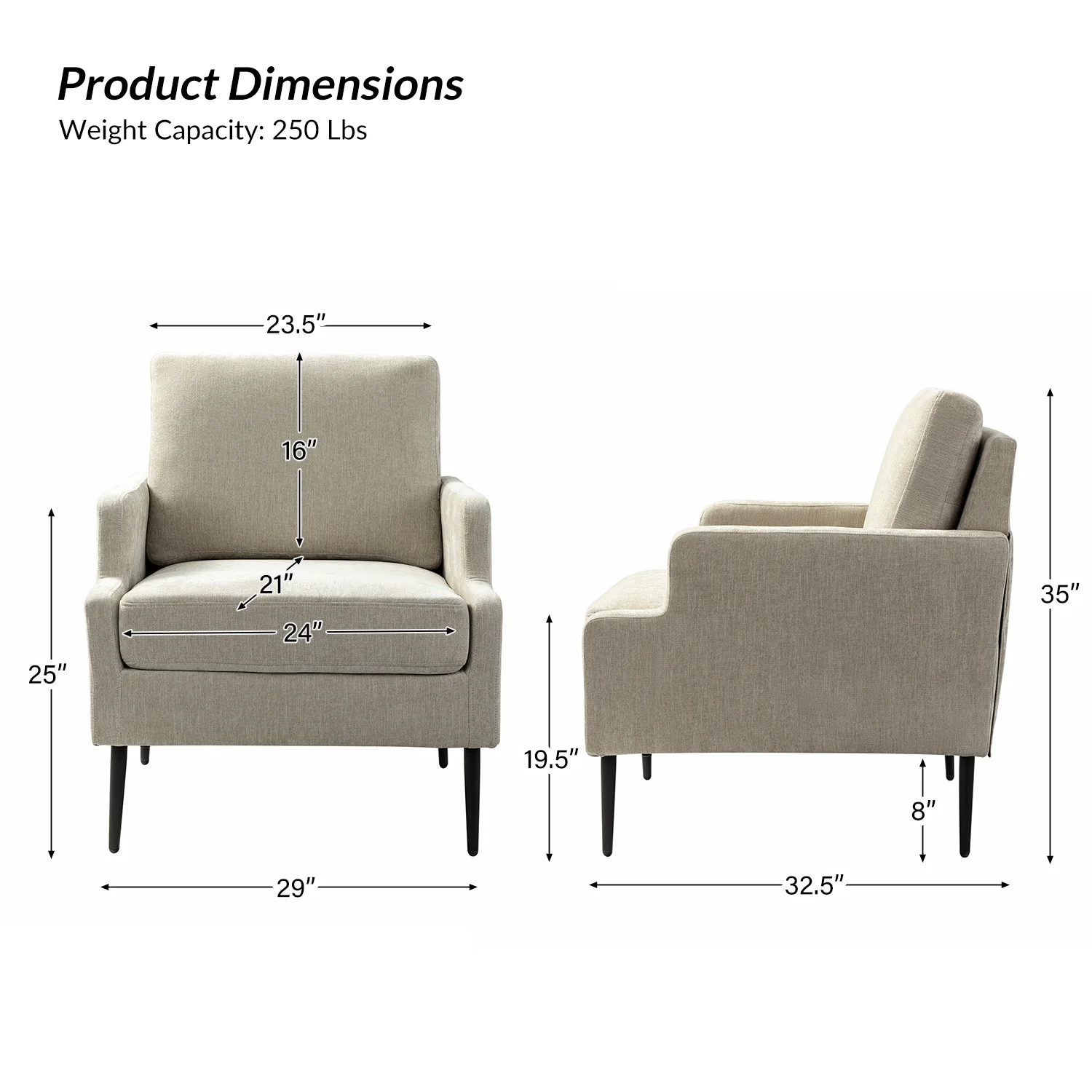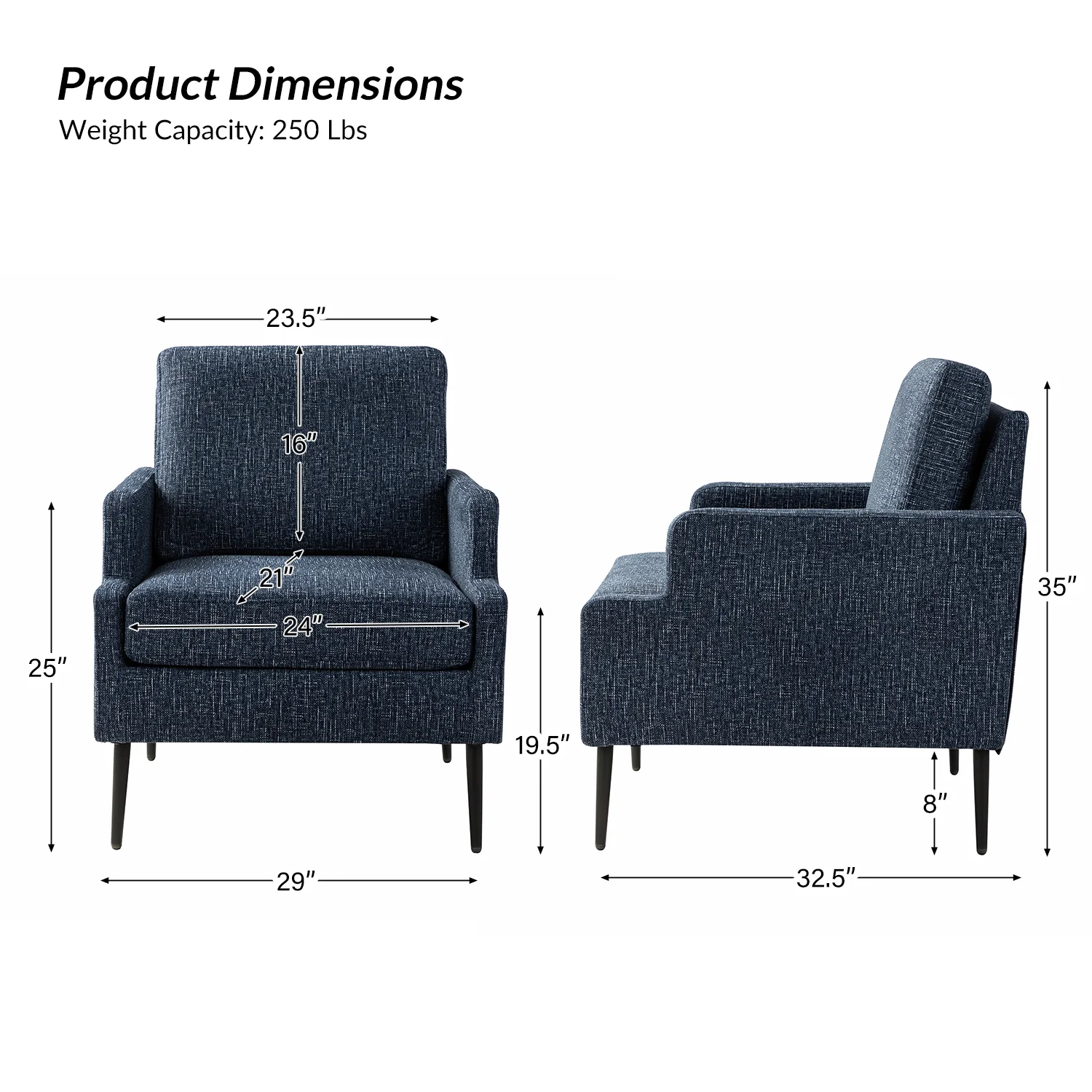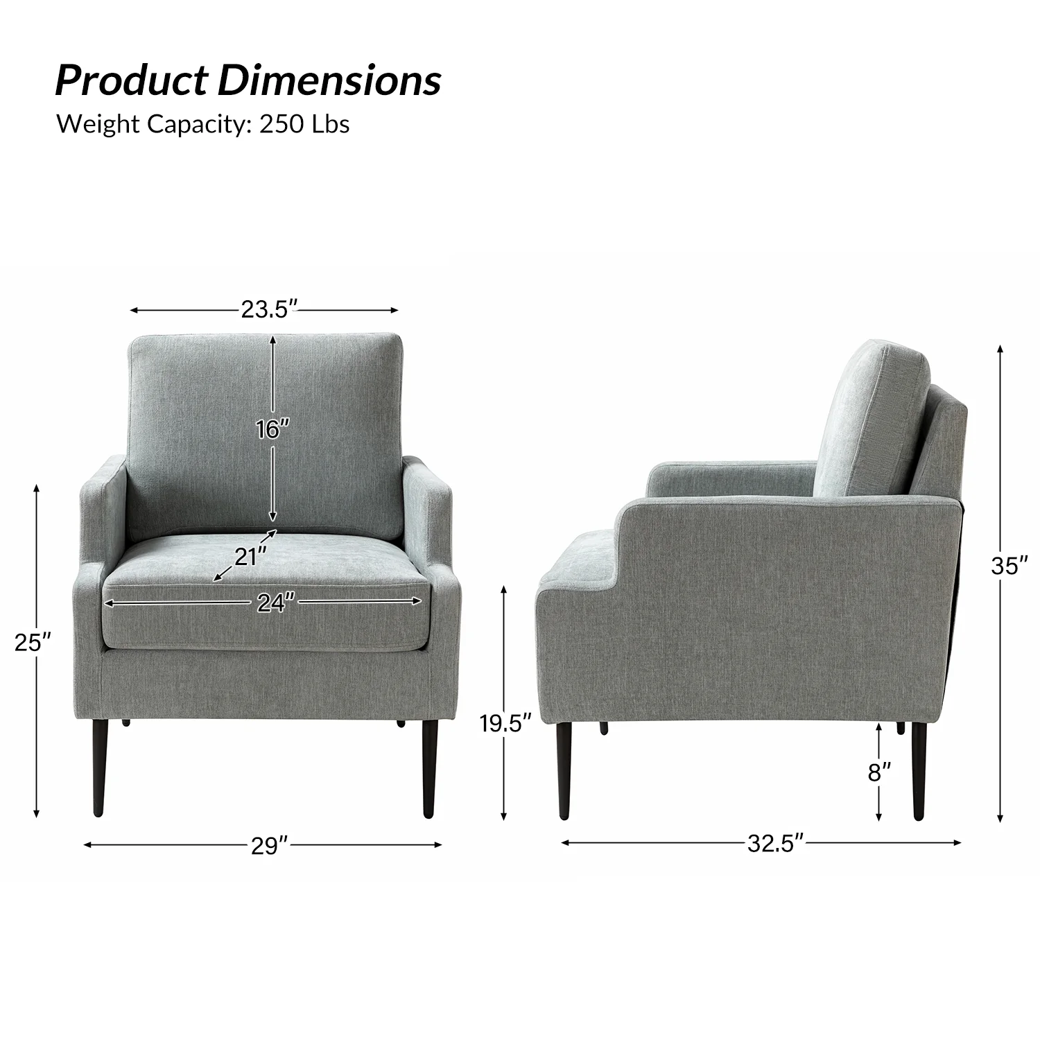This accent chair boasts a mid-century modern design with thin, notched armrests that offer sturdy support and balance. The plush chenille fabric upholstery is both soft to the touch and durable. Featuring a sleek silhouette, the accent chair's tapered metal legs provide support and a simple, modern look. With its slightly larger seat dimensions, this chair offers more freedom and flexibility of movement, allowing you to find the perfect position that suits your comfort preferences. Equipped with a comfy seat and backrest, it's perfect for long periods of sitting. Easy to assemble, the exquisite contemporary accent chair is a perfect addition to the living room, bedroom, or office, offering a unique design to round out various home decor.