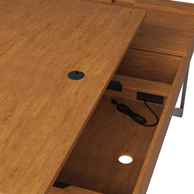 Upgrade your workspace with the ergonomic industrial and mid-century L-shaped desk. This premium alternative to a desk riser features an innovative sit-stand return that provides all the health benefits of a standing desk, with a more advanced height adjustment option. The built-in mechanical system allows the tabletop to hold in place at a vertical height of 41 inches and return easily to a sitting position.The desk includes a file drawer with a stylish rattan finish and full-extension ball-bearing slides for easy access to legal and letter-sized documents. Additionally, it features a drawer for supplies and utensils, equipped with wire management grommets to keep wires and cables safe and out of sight. This desk seamlessly combines functionality, aesthetics, and ergonomic benefits to create a versatile and stylish addition to any workspace.