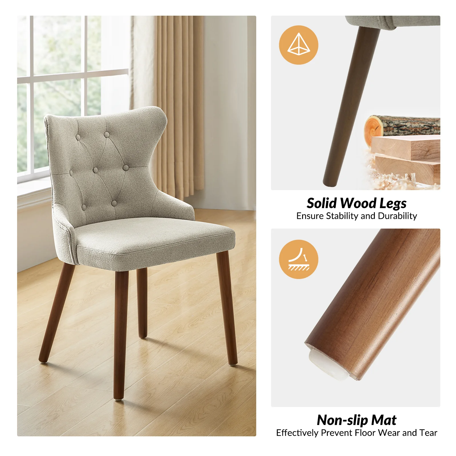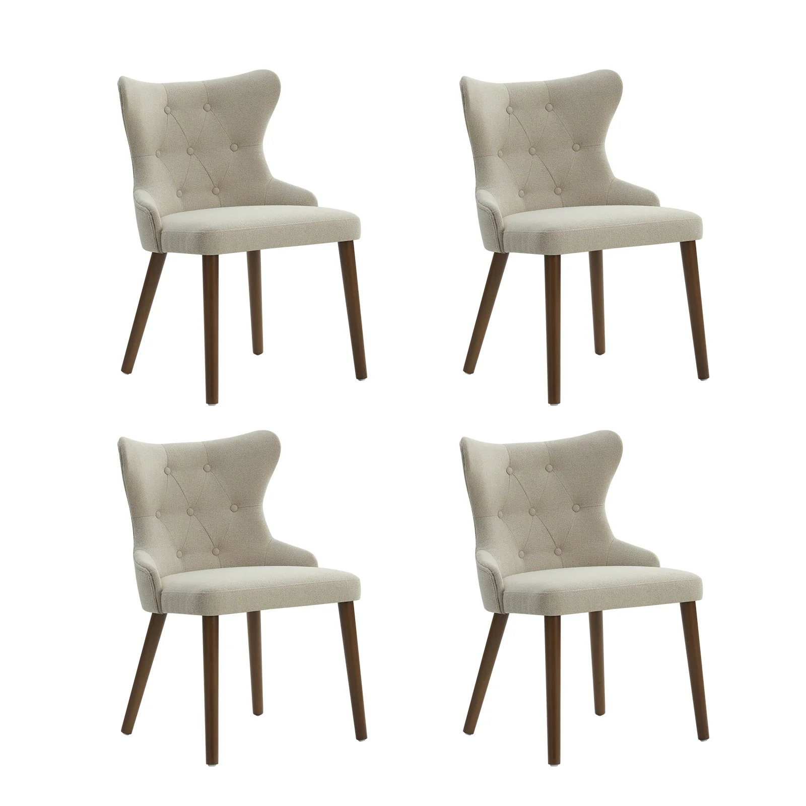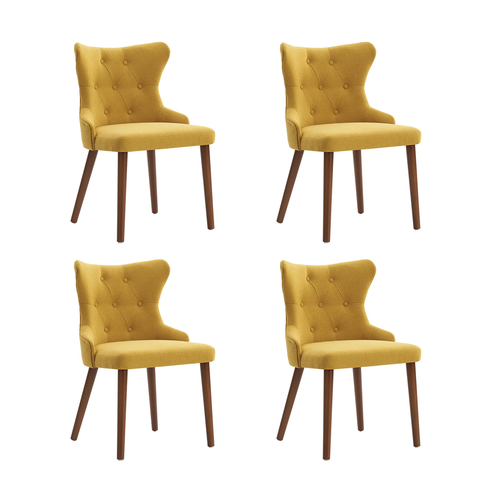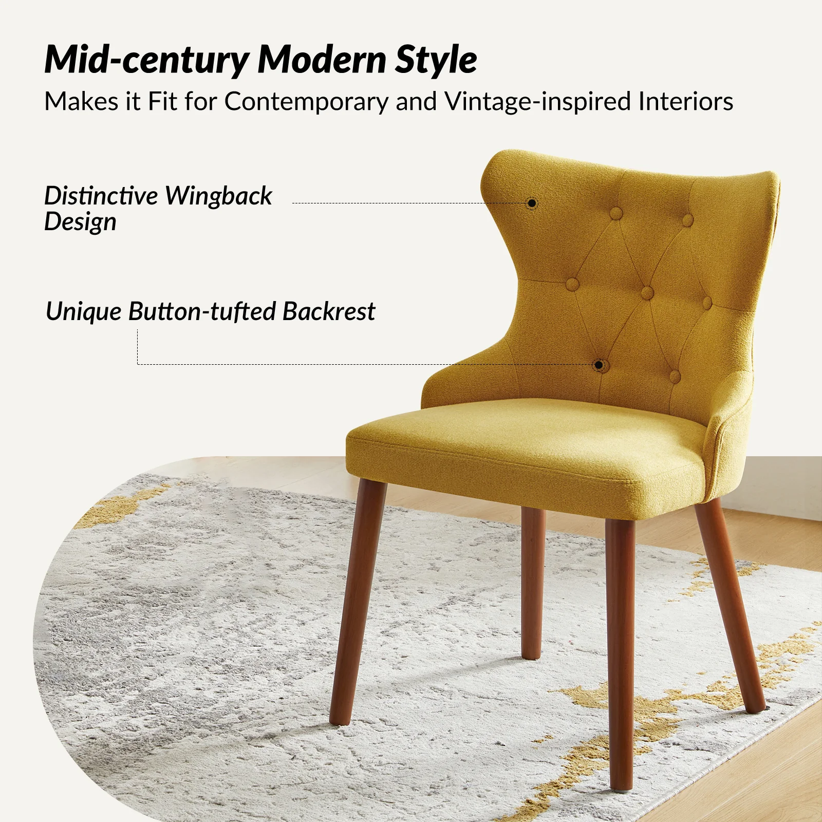 This mid-century modern dining chair set brings sophistication and comfort to your dining area. The set includes elegant wingback chairs, each designed with solid wood legs for a sturdy and classic foundation. The backrests feature a button-tufted design, adding a touch of vintage charm and visual interest to the chairs. Upholstered in waterproof fabric, these chairs are easy to maintain and keep clean, making them suitable for households with children or frequent guests. Crafted from high-density foam-filled seats that offer support, you can sit comfortably for extended periods. This dining chair set is easy to install with threaded legs, no tools required. The ergonomic design ensures you and your guests can enjoy dinners or social gatherings without discomfort. Whether placed in a dining room, kitchen, or even as accent chairs in other living spaces, this dining chair set enhances any decor with its stylish mid-century modern design.