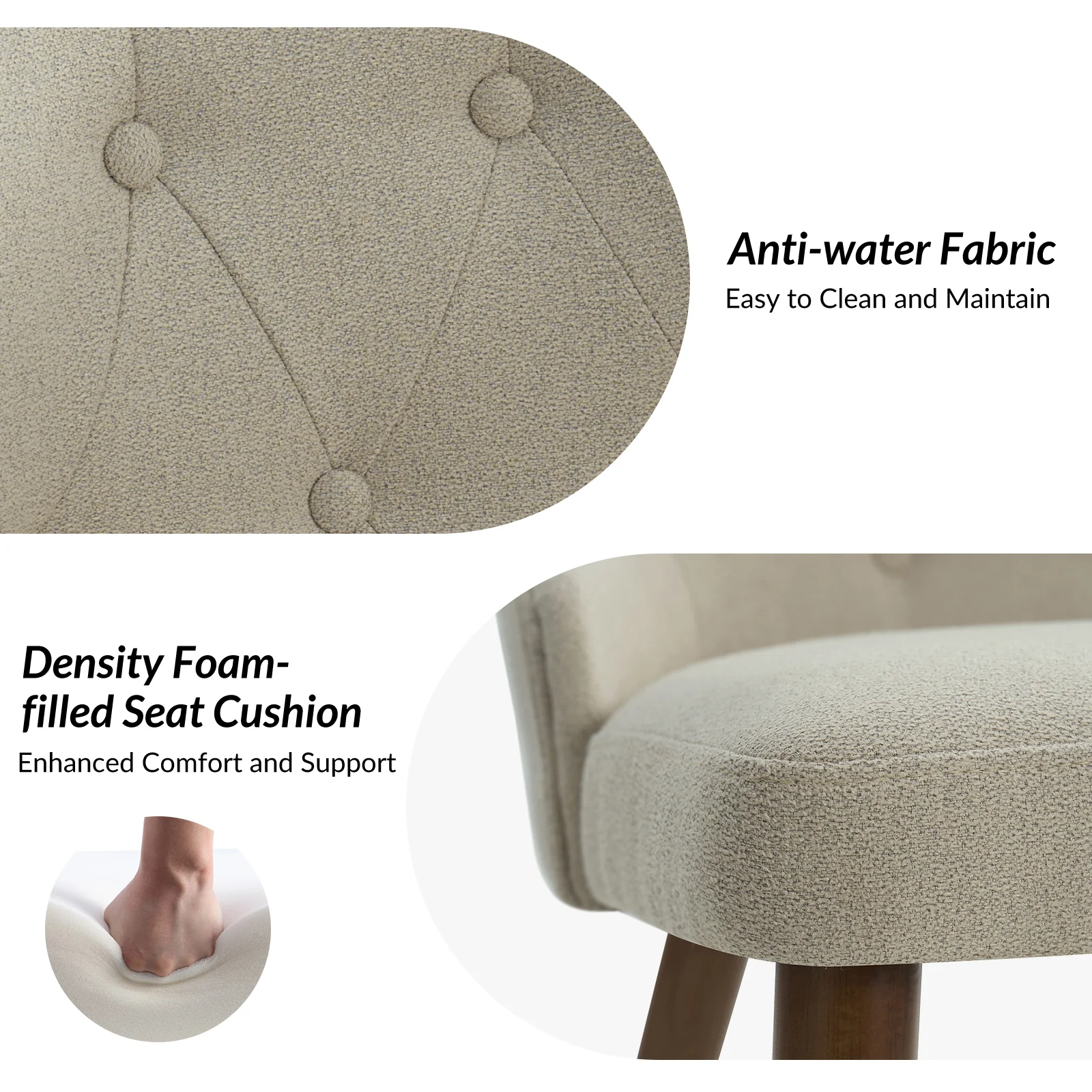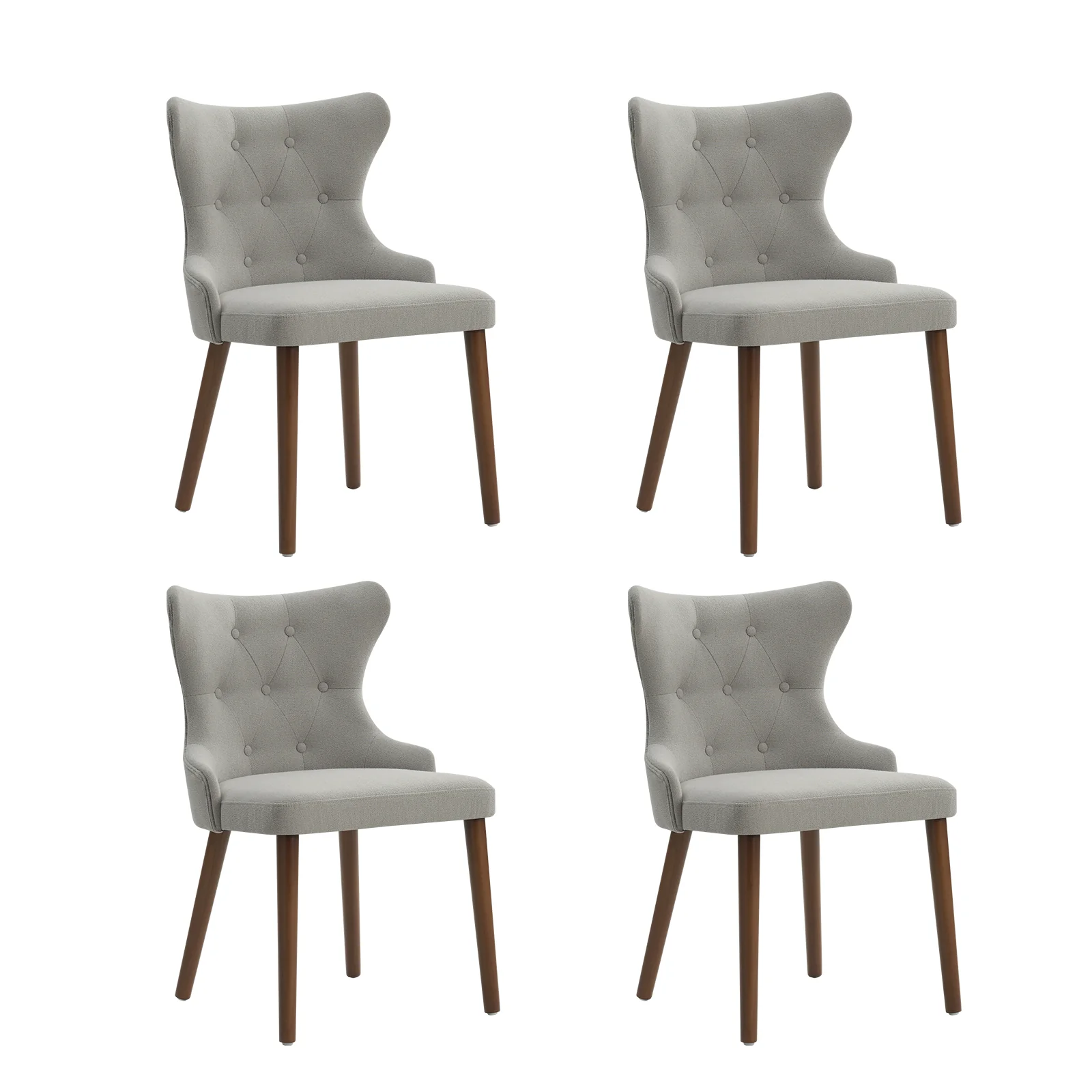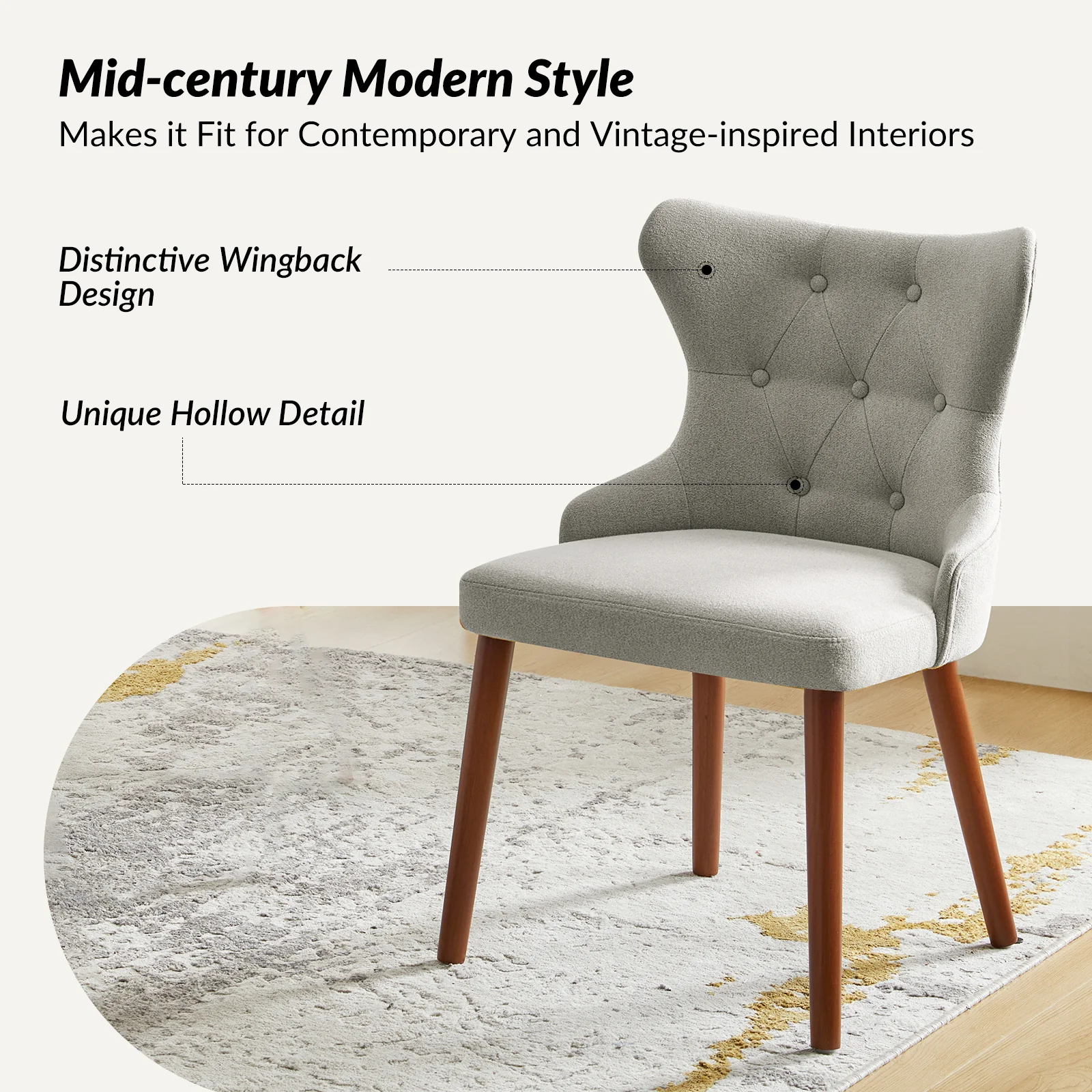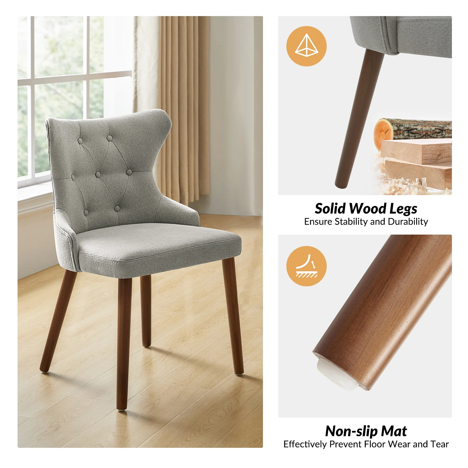 This mid-century modern dining chair set brings sophistication and comfort to your dining area. The set includes elegant wingback chairs, each designed with solid wood legs for a sturdy and classic foundation. The backrests feature a button-tufted design, adding a touch of vintage charm and visual interest to the chairs. Upholstered in waterproof fabric, these chairs are easy to maintain and keep clean, making them suitable for households with children or frequent guests. Crafted from high-density foam-filled seats that offer support, you can sit comfortably for extended periods. This dining chair set is easy to install with threaded legs, no tools required. The ergonomic design ensures you and your guests can enjoy dinners or social gatherings without discomfort. Whether placed in a dining room, kitchen, or even as accent chairs in other living spaces, this dining chair set enhances any decor with its stylish mid-century modern design.