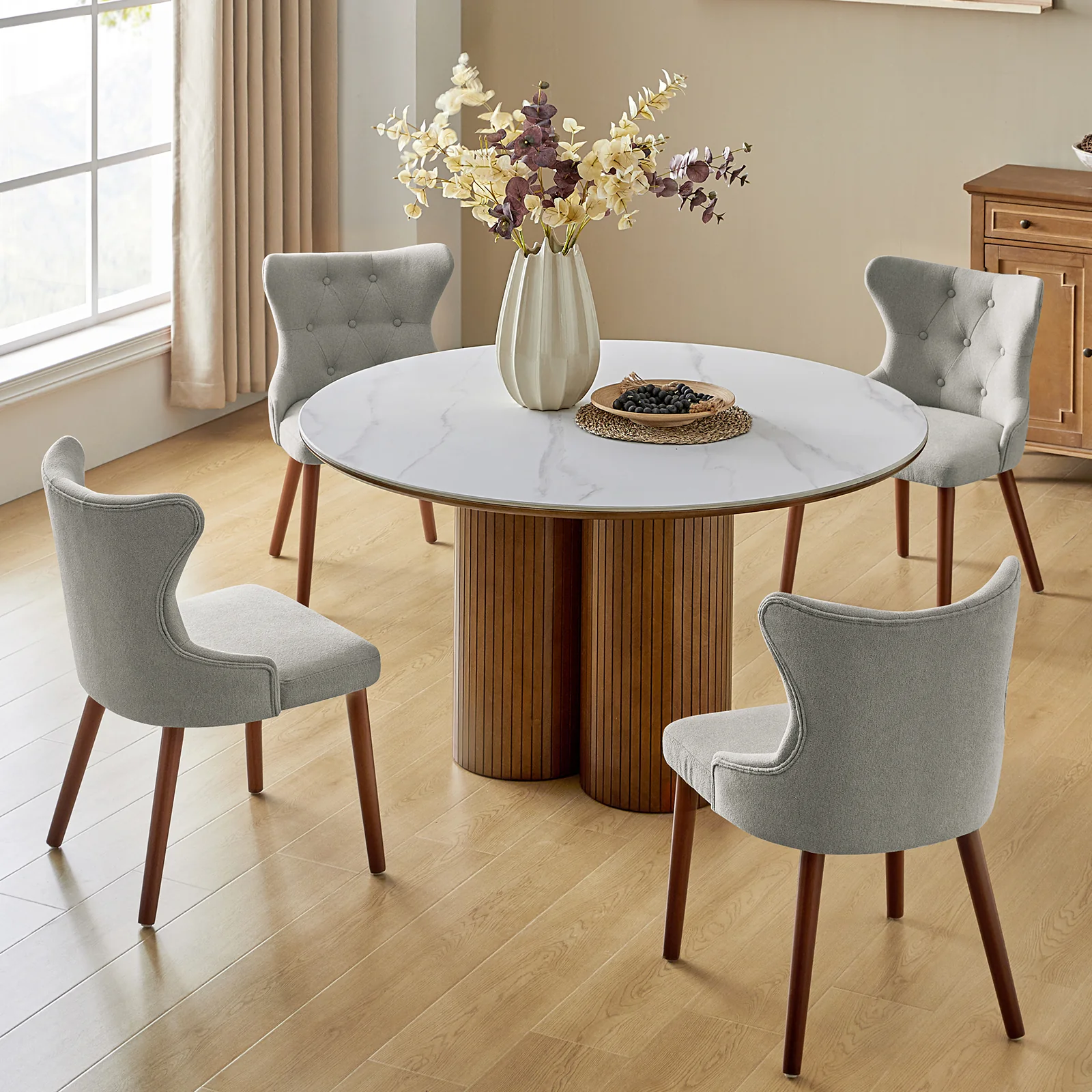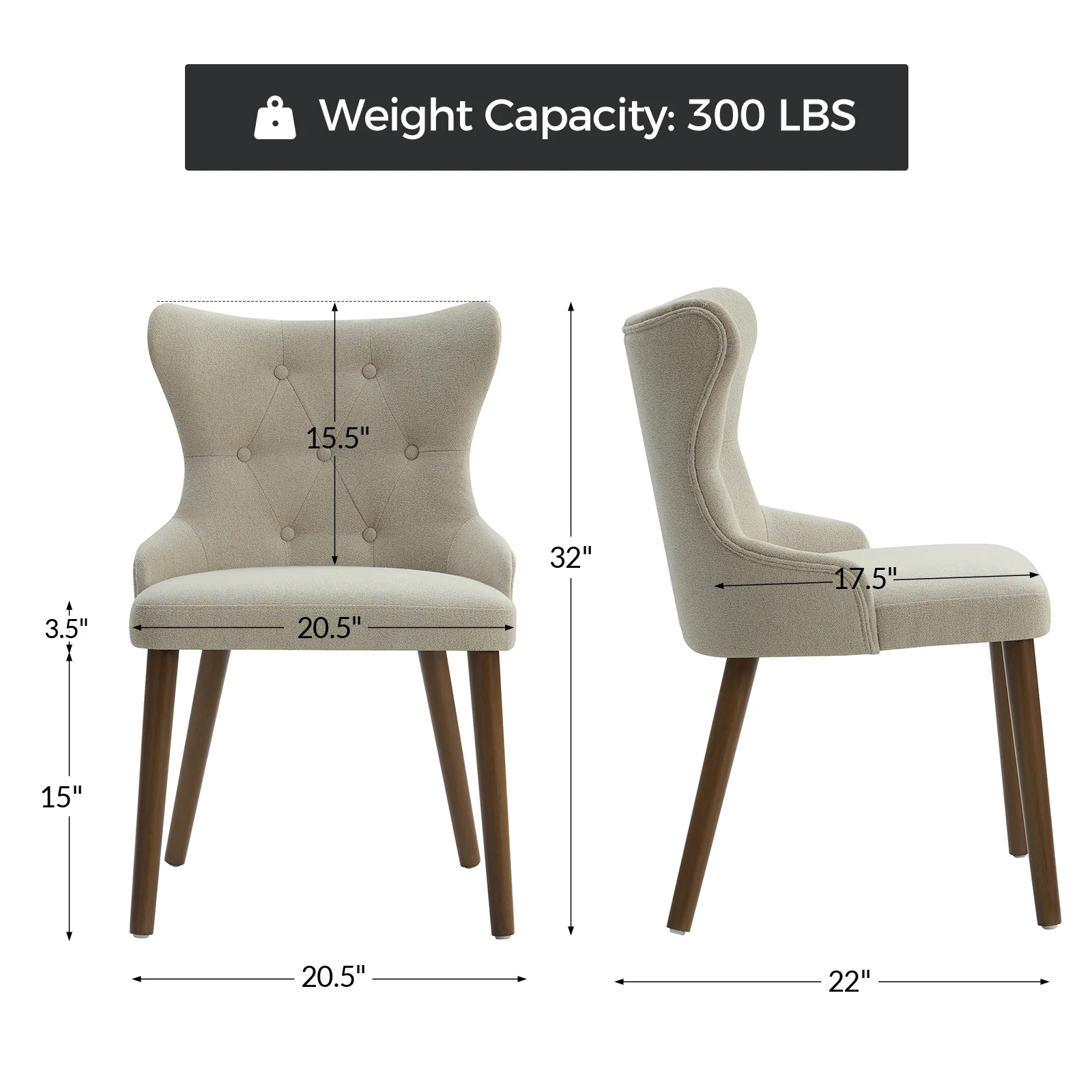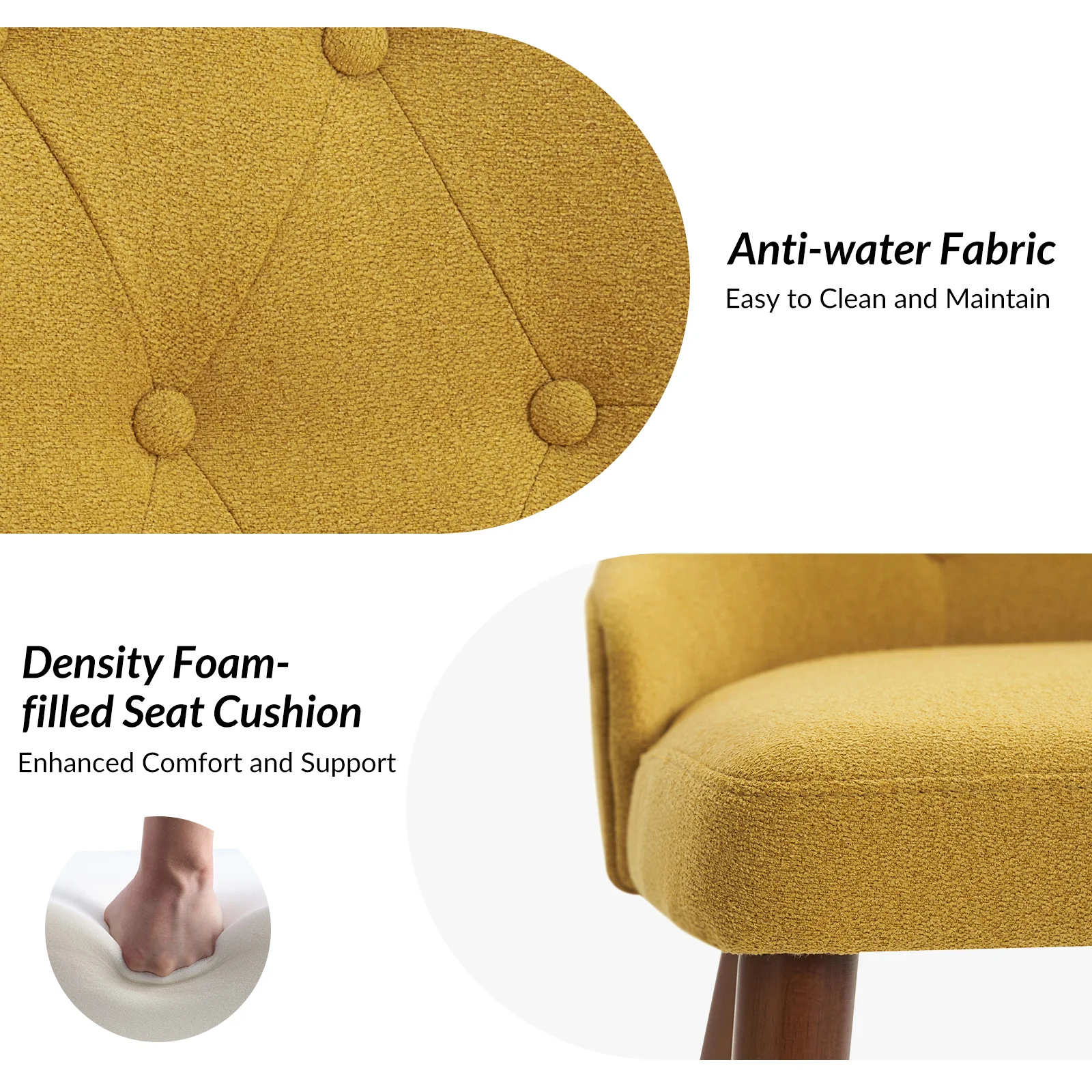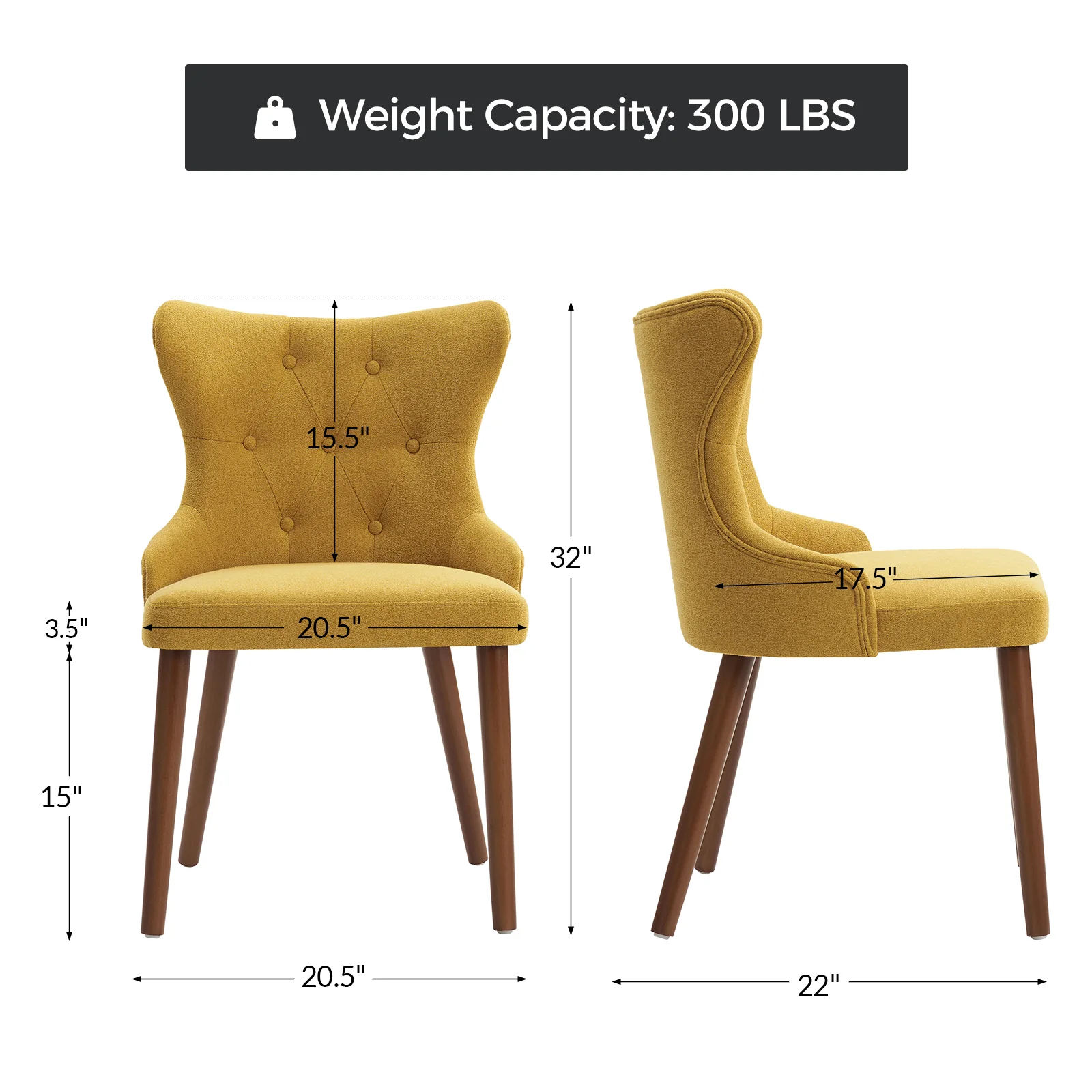 This mid-century modern dining chair set brings sophistication and comfort to your dining area. The set includes elegant wingback chairs, each designed with solid wood legs for a sturdy and classic foundation. The backrests feature a button-tufted design, adding a touch of vintage charm and visual interest to the chairs. Upholstered in waterproof fabric, these chairs are easy to maintain and keep clean, making them suitable for households with children or frequent guests. Crafted from high-density foam-filled seats that offer support, you can sit comfortably for extended periods. This dining chair set is easy to install with threaded legs, no tools required. The ergonomic design ensures you and your guests can enjoy dinners or social gatherings without discomfort. Whether placed in a dining room, kitchen, or even as accent chairs in other living spaces, this dining chair set enhances any decor with its stylish mid-century modern design.