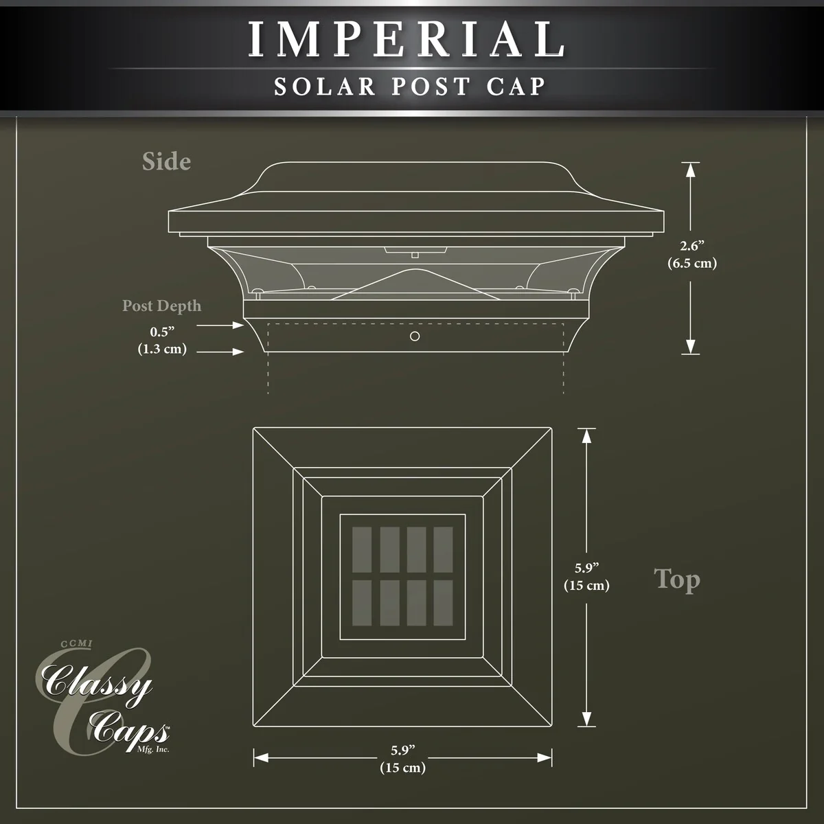 Add a touch of modern elegance to your outdoor space with the Classy Caps 4x4 Bronze Aluminum Imperial Solar Post Cap. Its high-performance solar lights are three times brighter than standard LED's and stay lit for up to 10 hours, providing brilliant white light with a 4500-5500 Kelvin range. With an auto-on feature and an off switch, it's easy to use and convenient. Made from durable cast aluminum with a powder-coated finish, the Imperial cap is built to last and requires no future painting. Quick and easy to install, it fits over an actual 4"x4" or 3.5"x3.5" post (adaptor included). Patent No: D624,227 S.