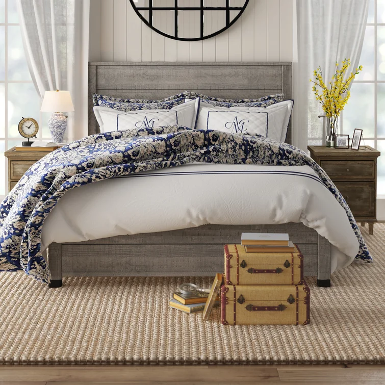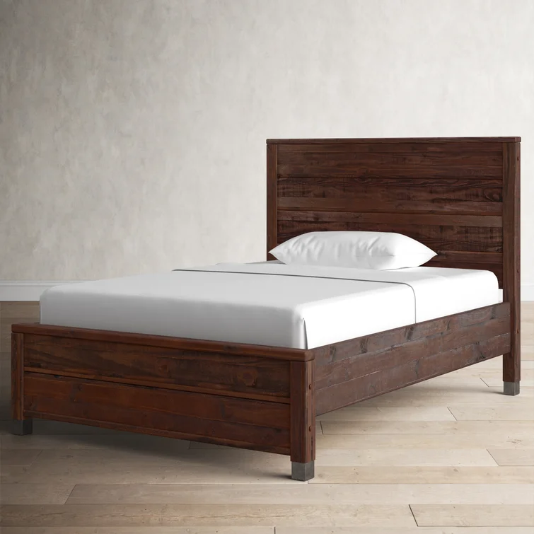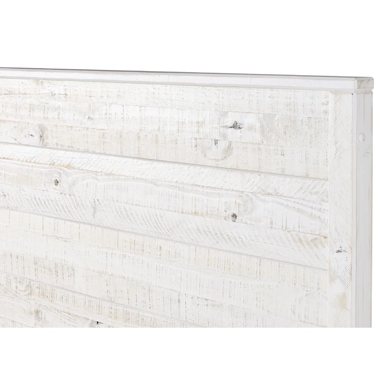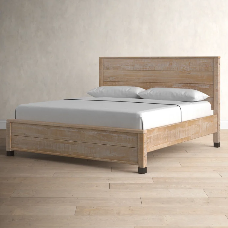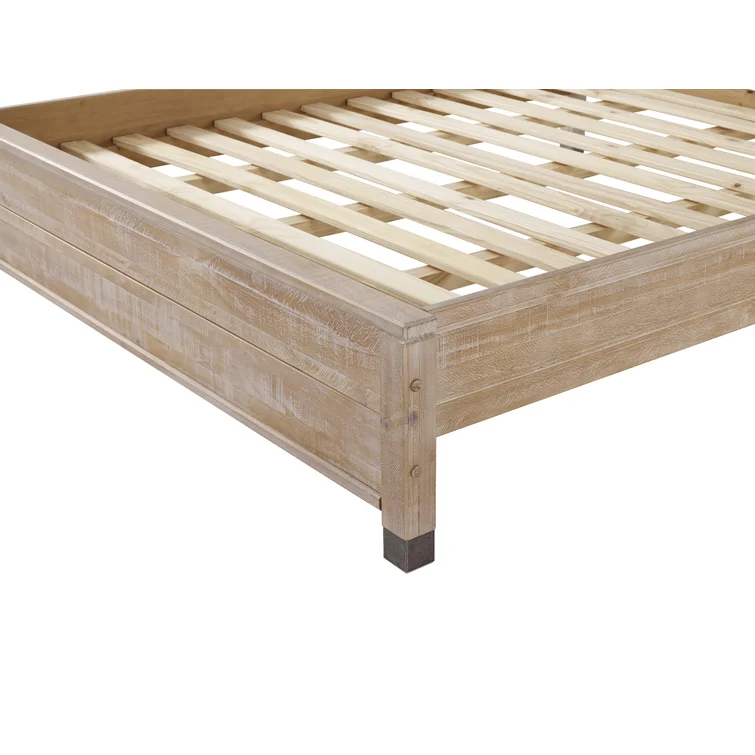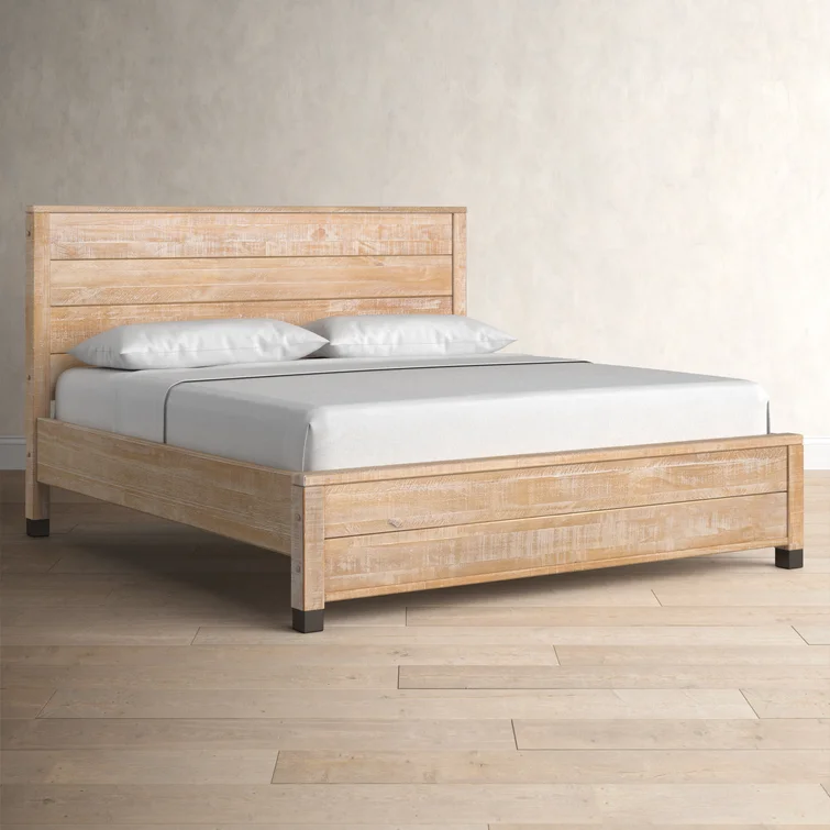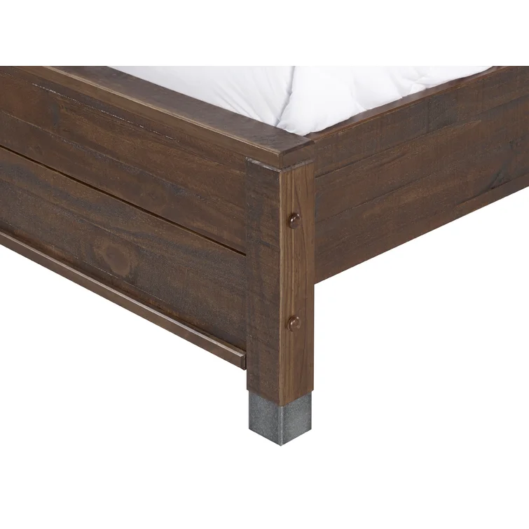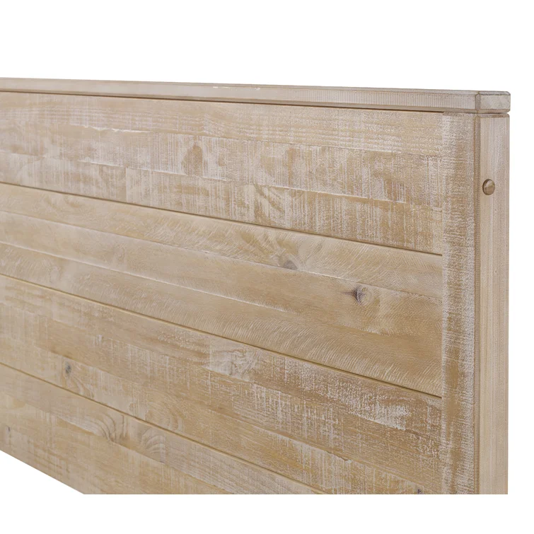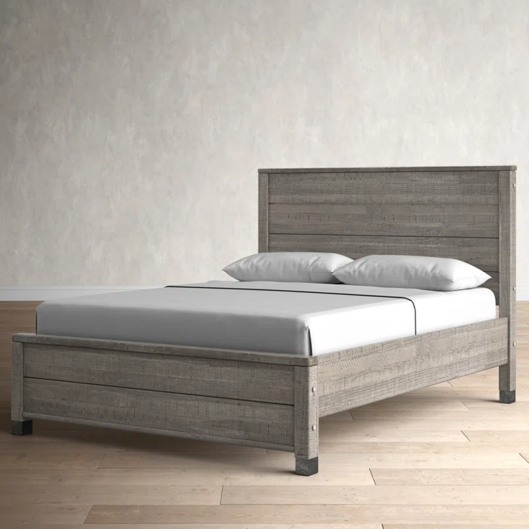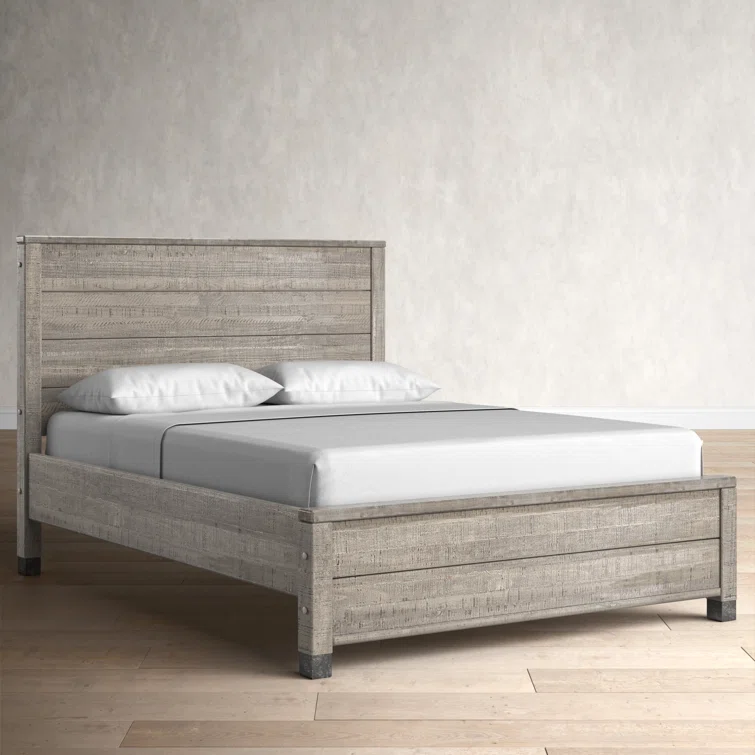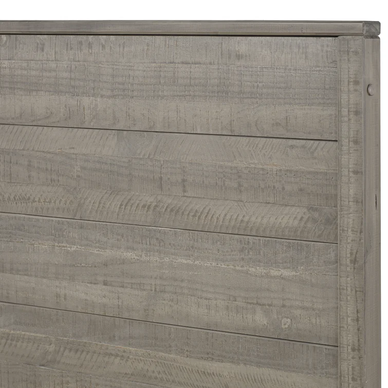 This contemporary, clean-lined bed gets a rustic twist creating the perfect balance of sophistication and warmth making it the perfect pick for industrial lofts and modern farmhouses alike. The bed is crafted from solid wood sourced from renewable plantations, making the bed sturdy and long-lasting. Its frame features a slatted design and a weathered finish, while the headboard is a paneled look also with the same rustic finish. The water-based distressed finish showcases the natural beauty of the wood grains and decorative steel accents add additional appeal. No box spring is required for this piece, instead, a slat system with center supports is included to give your mattress support and space to breathe.