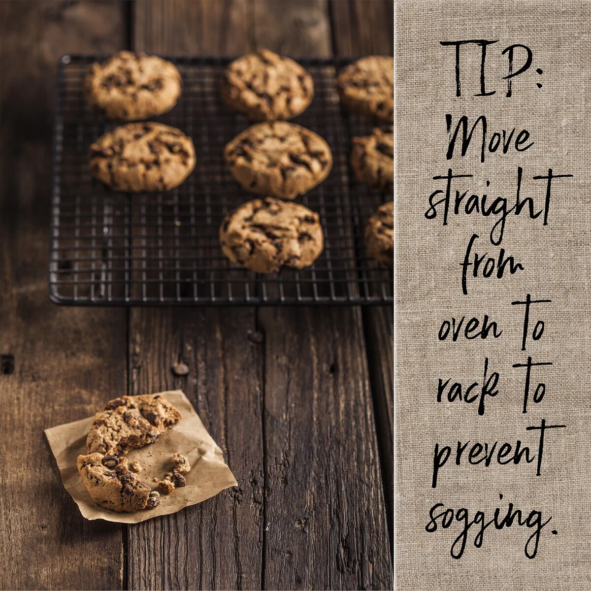 - VERSATILE: The cooling rack is perfect for baking cakes and cookies, roasting vegetables, and allowing baked goods to cool. The cooling rack has raised feet and crosswires for stability and maximum airflow.