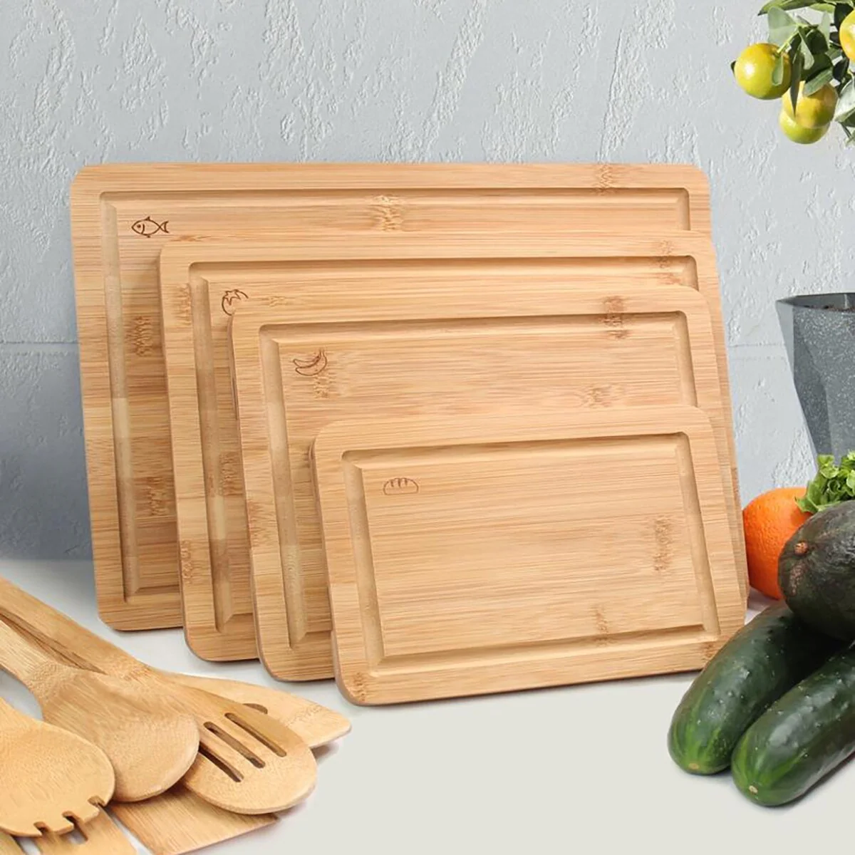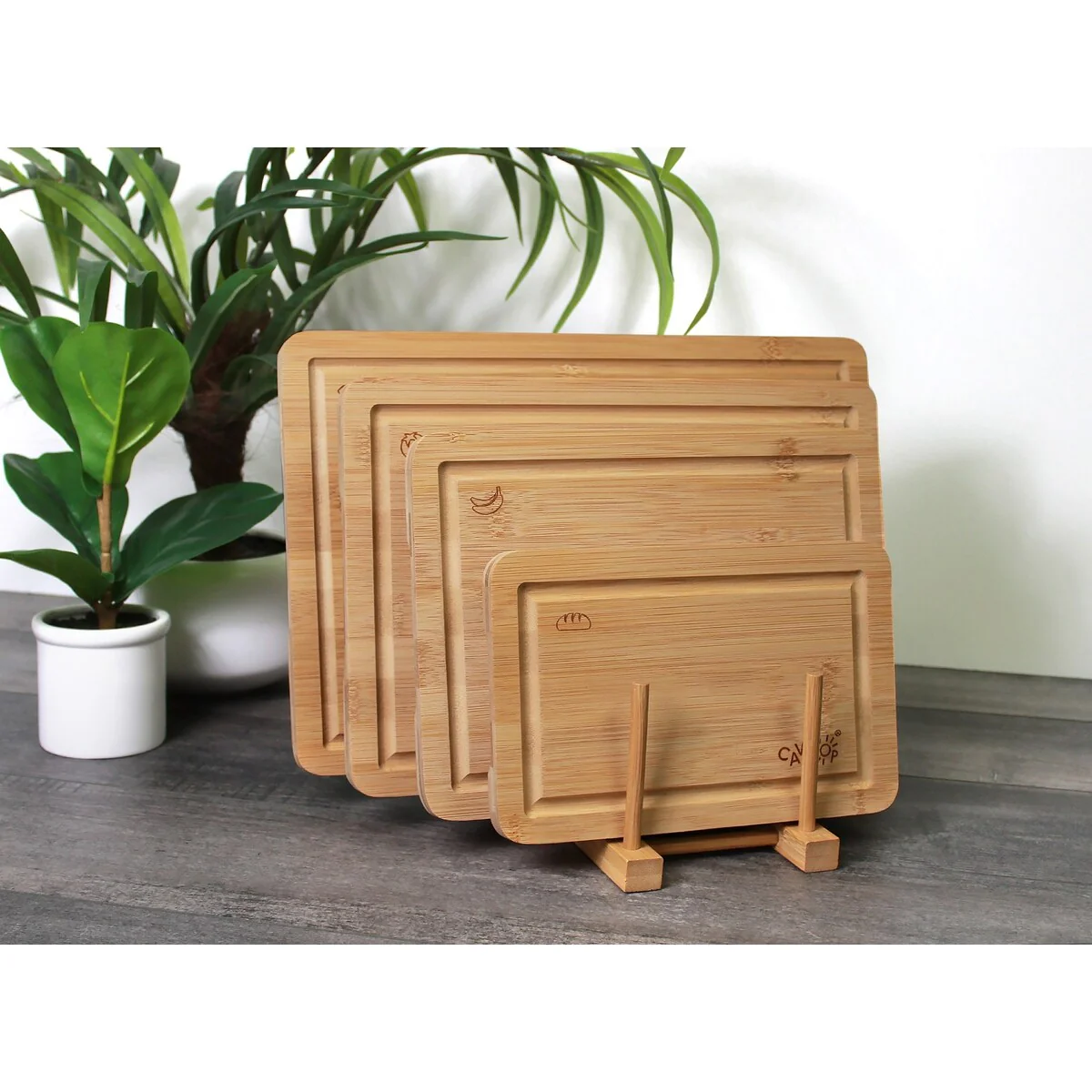A cutting board is an essential for every kitchen.This multi-purpose tool will be more than just your everyday cutting board, making it perfect for prepping and serving meals and includes a stand for easy storage.All items are constructed of eco-friendly and sturdy bamboo.The boards can be used as a serving tray with the convenient underboard side-grips.Drainage grooves catch juices and prevent countertop messes.Lightweight with scratch-resistant surface.Non-porous surface is stain and odor resistantHand wash. Set of four (4) include the following size board15" X 10" 13" X 9" 11" X 8" 9" X 7"