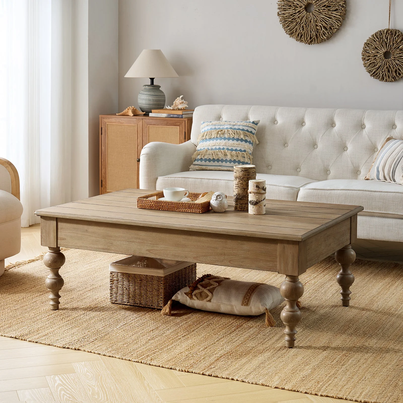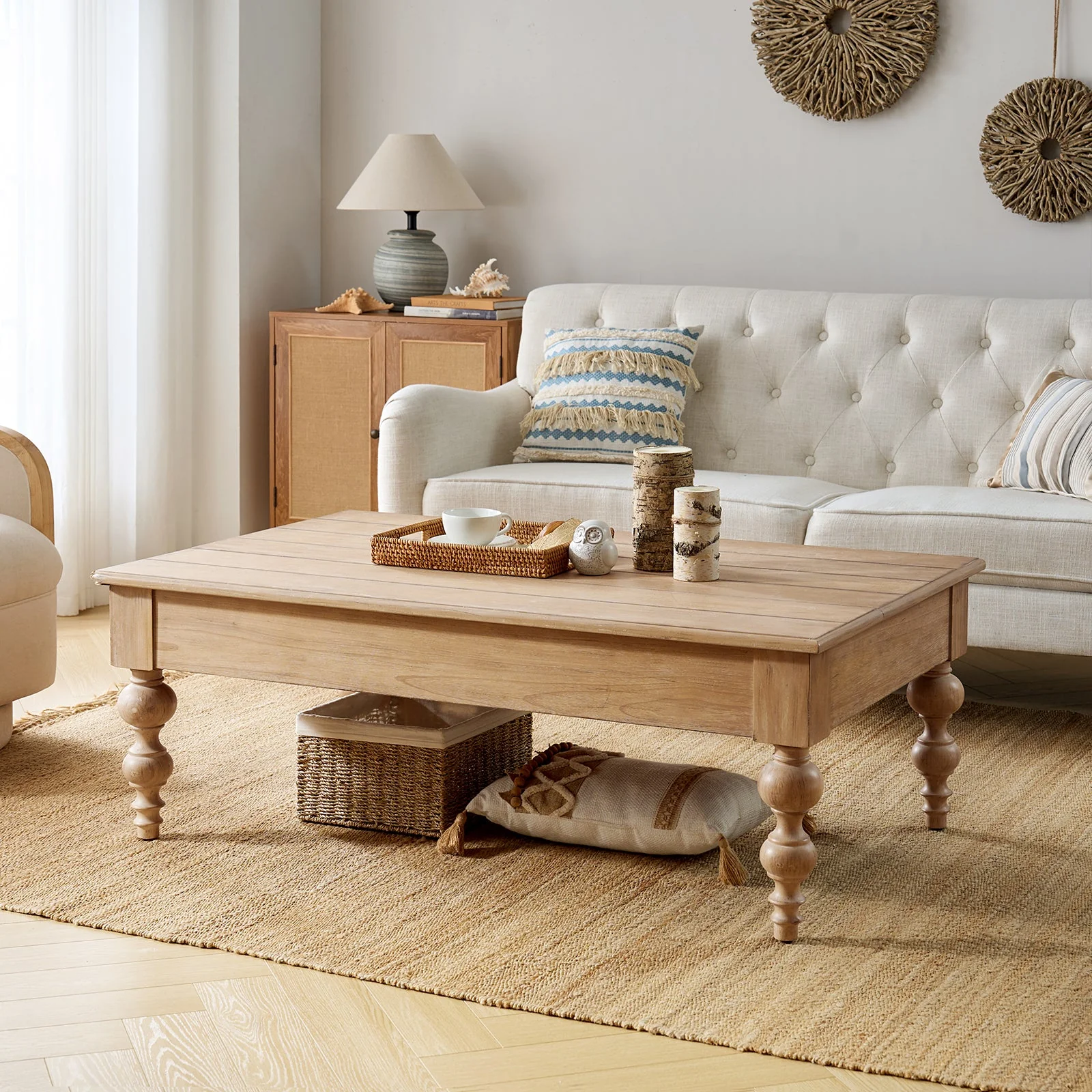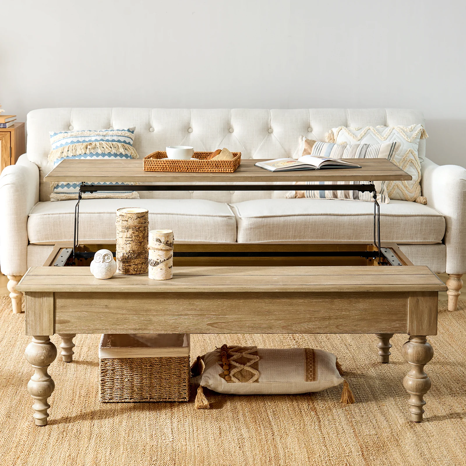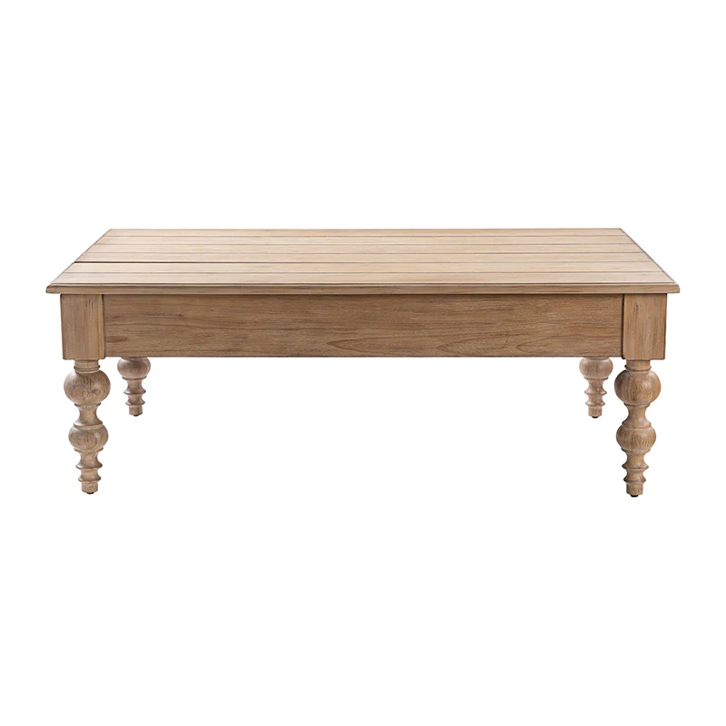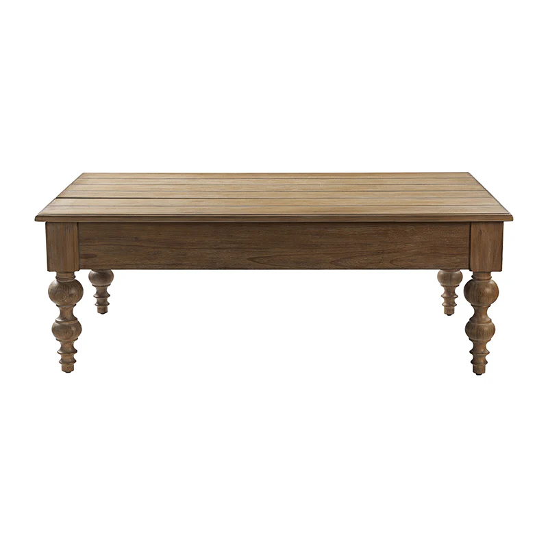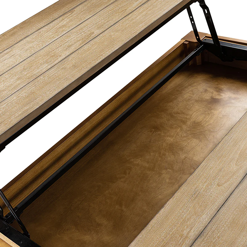 The lift-top coffee table with storage is a versatile and stylish addition to any living space. Handcrafted with attention to detail, this traditional piece combines farmhouse charm with a rustic and distressed finish. Constructed from solid rubber wood and MDF, it offers durability and longevity. Featuring elegant spindle legs, it adds a touch of sophistication to its design. The table's pop-up mechanism allows for easy lifting, revealing ample storage space underneath to keep your living area organized. Its timeless appeal complements a range of interior styles, from coastal and French country to lodge aesthetics. Enjoy the functionality and beauty of this handcrafted coffee table.