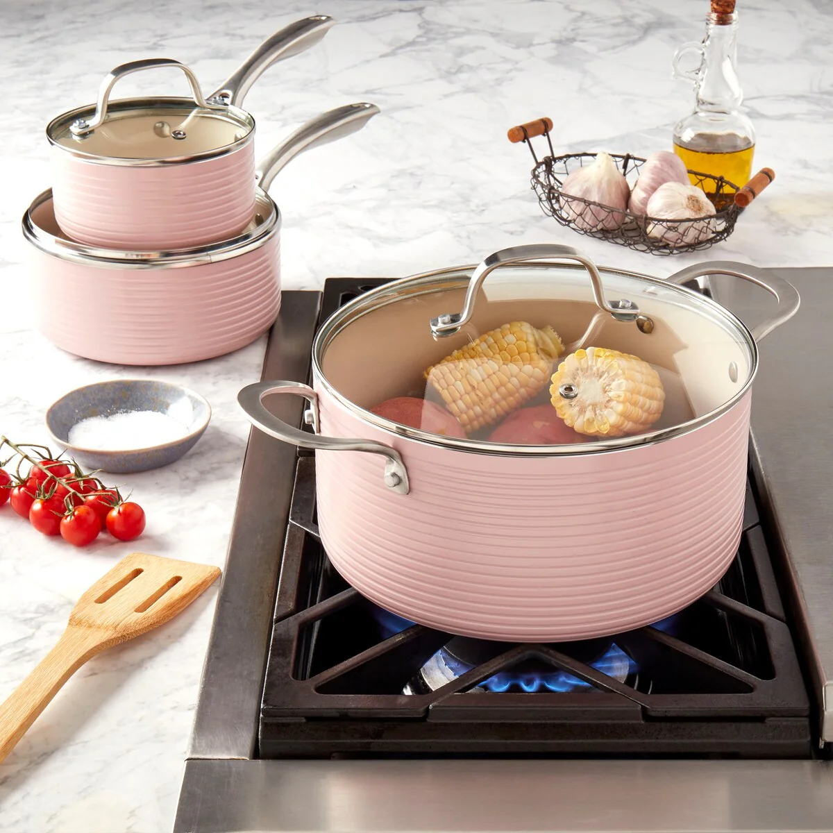 The 10PC non-stick aluminum cookware set from Denmark Tools for Cooks is beautifully designed and has been carefully crafted to uphold the stellar performance expected from high-quality cookware. This set couples superb non-stick coating with a durable aluminum construction that is ideal for daily use in high-traffic kitchens. The 10PC set includes everything necessary for a complete cookware collection. PFOA-Free non-stick coating provides incredible food release while easy to clean interior and exterior. Ergonomically designed handles provide a comfortable grip; tempered glass lids allow you to monitor the food without disturbing the cooking process.