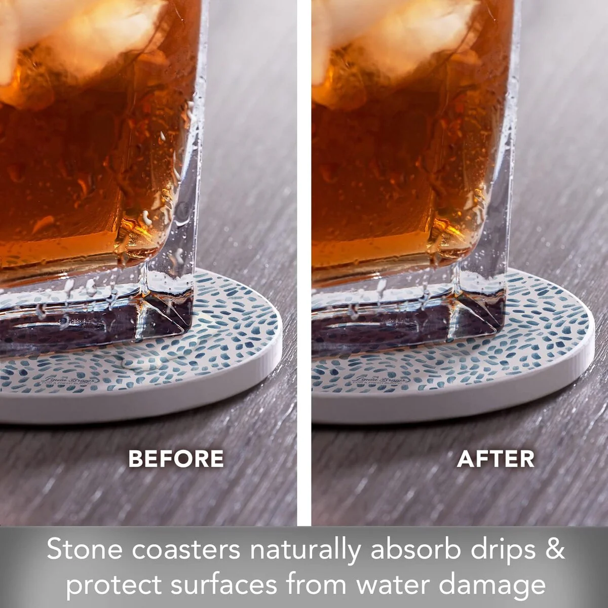 • ABSORBENT STONE - You receive a set of 4 ceramic absorbent coasters. Coasters continuously absorb drips and condensation from beverages, protecting your surfaces from water rings and damage.