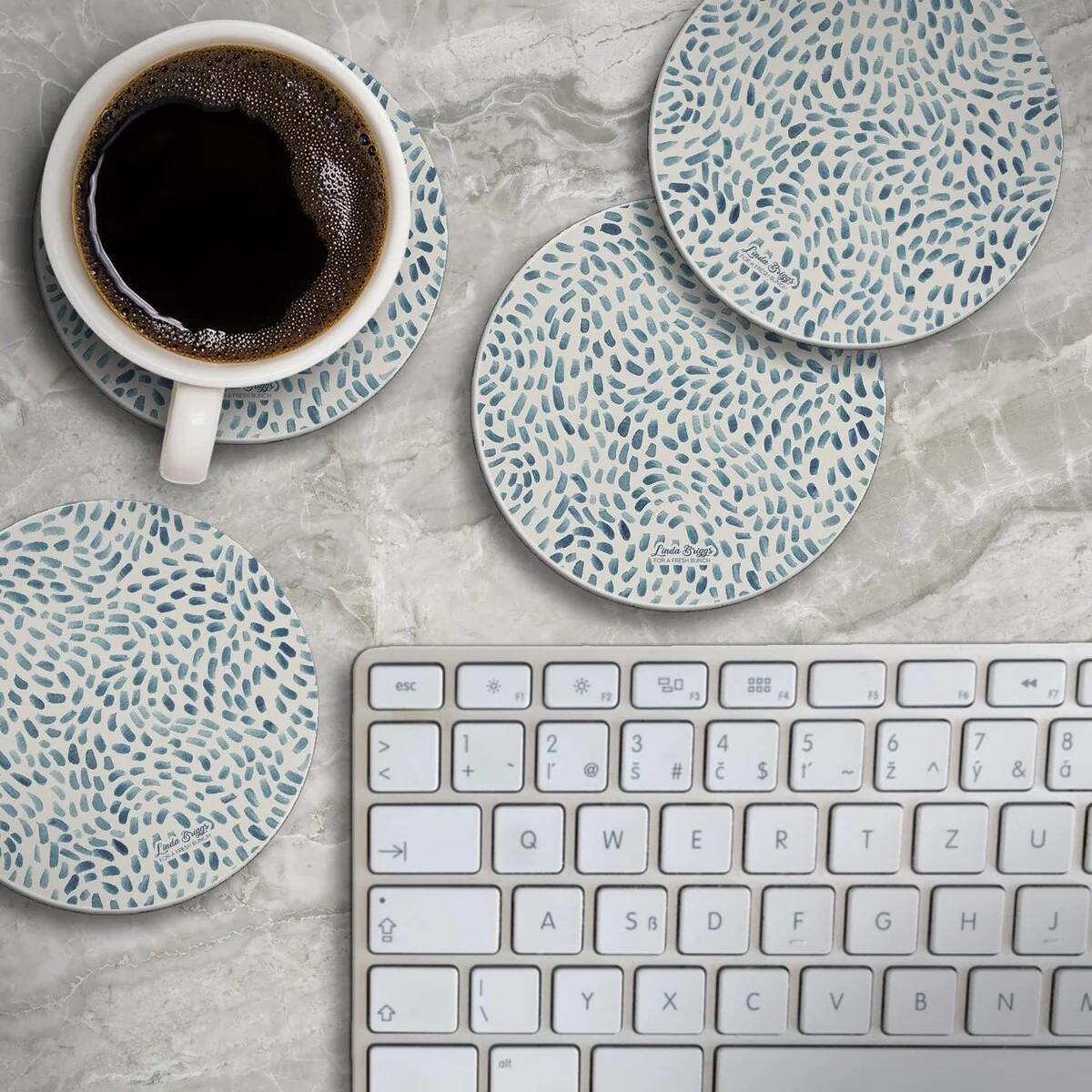 Drift Marks Round Absorbent Stone Coaster 4 Pack with Protective Cork Backing. Manufactured in the USA of ceramic stone that absorbs excess condensation from beverages. Cork backing protects your surfaces from scratches and stains. Artistic designs are printed on the surface of each coaster. These attractive coasters add elegance and distinction to your space. Coasters measure 4in diameter. Visit our CounterArt store for more coordinating houseware products.