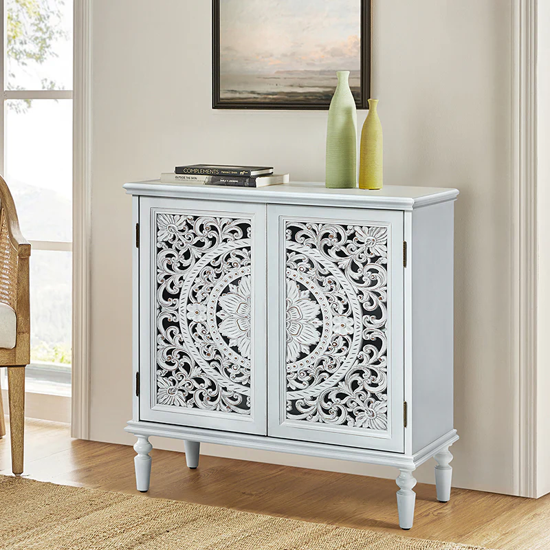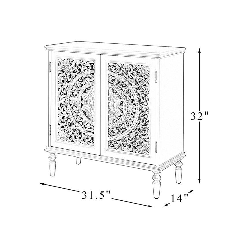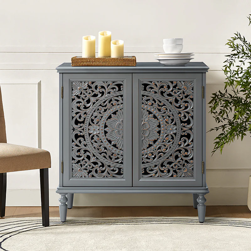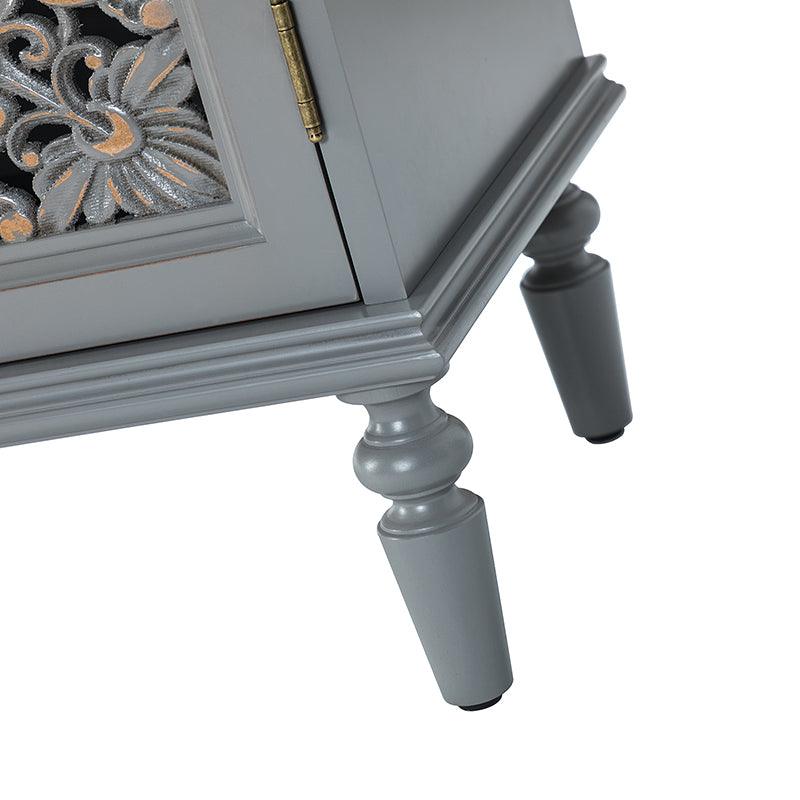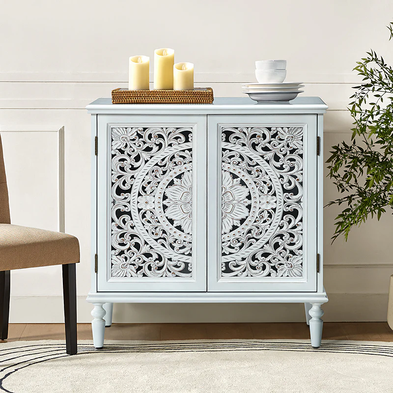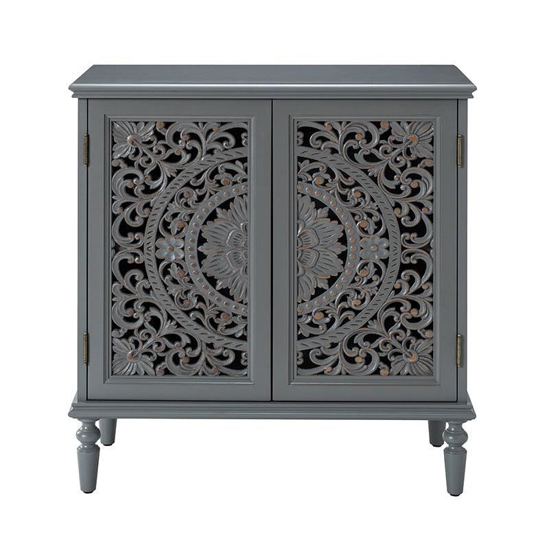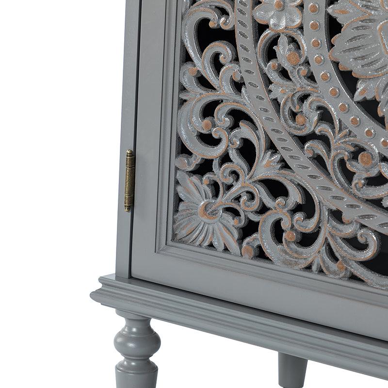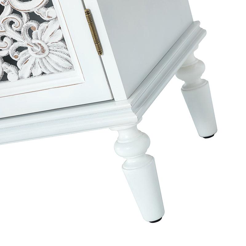 A sleek addition to your bedroom or living space, this transitional cabinet sports an elegant look that's fit for any aesthetic. The two cabinet doors have a carved floral design to add a touch of flair to your drab living space. The interior of the cabinet has a fixed shelf that divides the interior space into two sections to provide space for what you need. Four turned legs firmly support the whole cabinet, so you don't have to worry about his weight-bearing problem when you put a lot of things. Meanwhile, the flat top surface is the perfect area to put potted plants, books and other things. The streamlined design makes it a versatile piece that ideal in smaller spaces, whether in a sitting area or next to a bed.