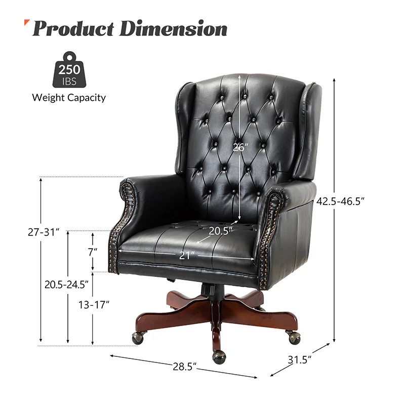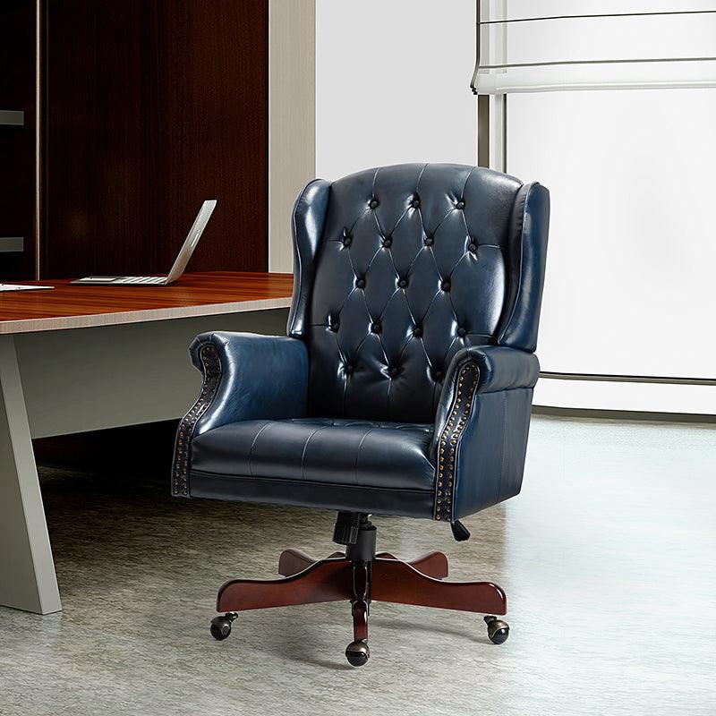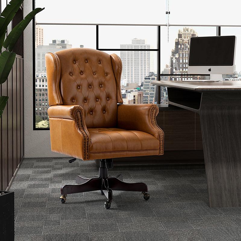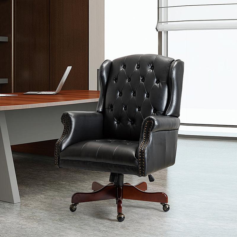Add a touch of classic elegance to your space with a design that is equally functional and stylish. This swivel office chair is a wonderful addition to any office or home office with its variety of vibrant colors-vegan leather upholstery that blends with any design taste. Designed in an attractive style with tufted buttons-dotting wingback and integrated rolled arms lend a tailored touch, this executive chair features a sturdy solid and manufactured frame and beautiful red-brown finished base combined with 360-degree metal wheels allow you to glide to anywhere in the room. Glam nailhead trim embellishes the rolled arms and outlines the shape of it while a lever-operated lift to adjust the seat height tailors your professional space. This piece also offers you extreme comfort and support with its foam filled backrest as well as pocket spring built-in seat. Luxurious executive chair is the perfect use-it-everywhere piece, it will create a glamorous, eye-catching look and could be used in their bedroom, entryway or office.