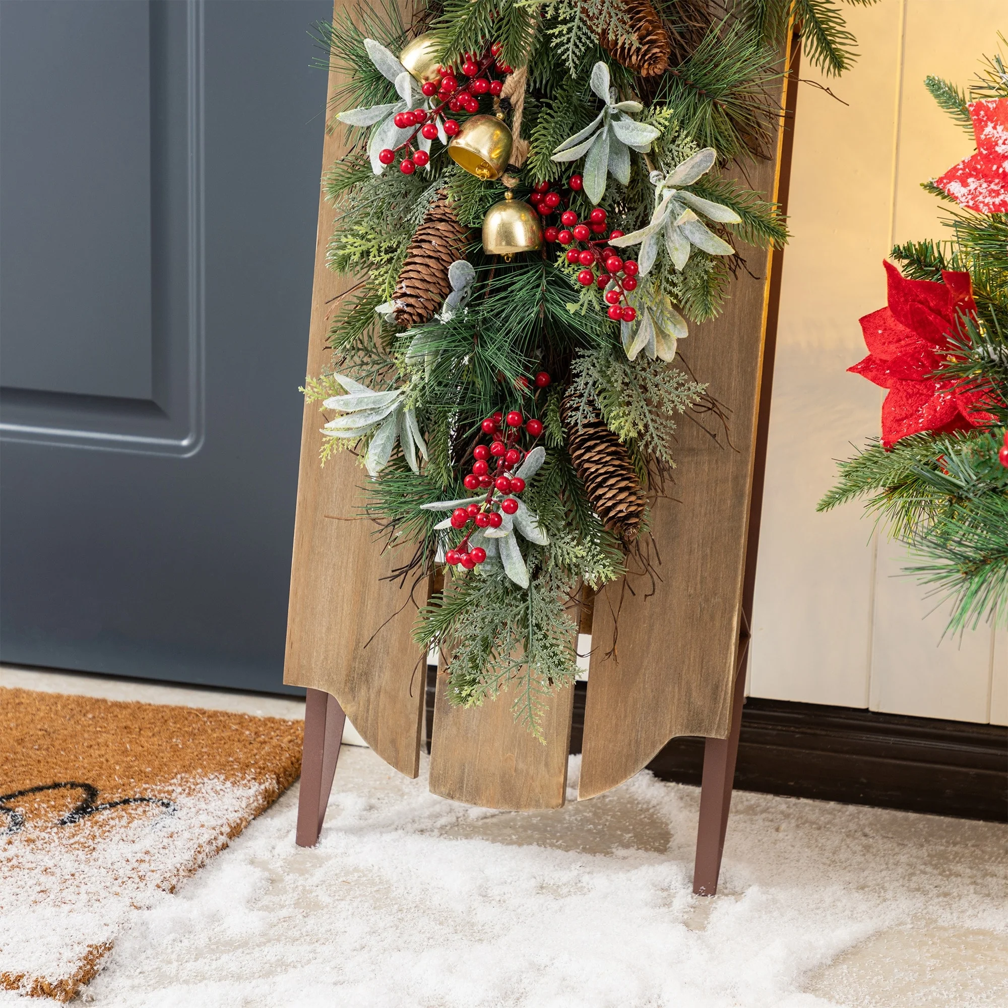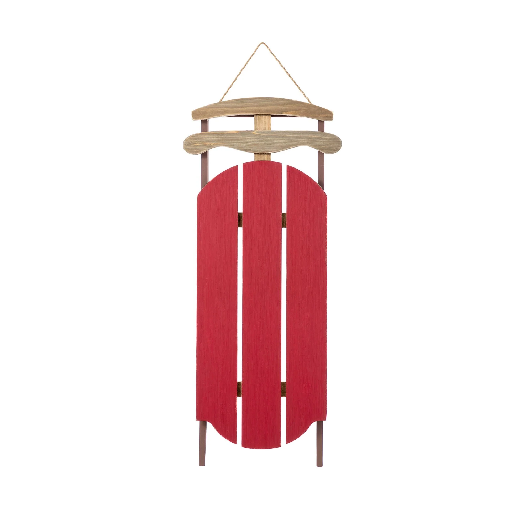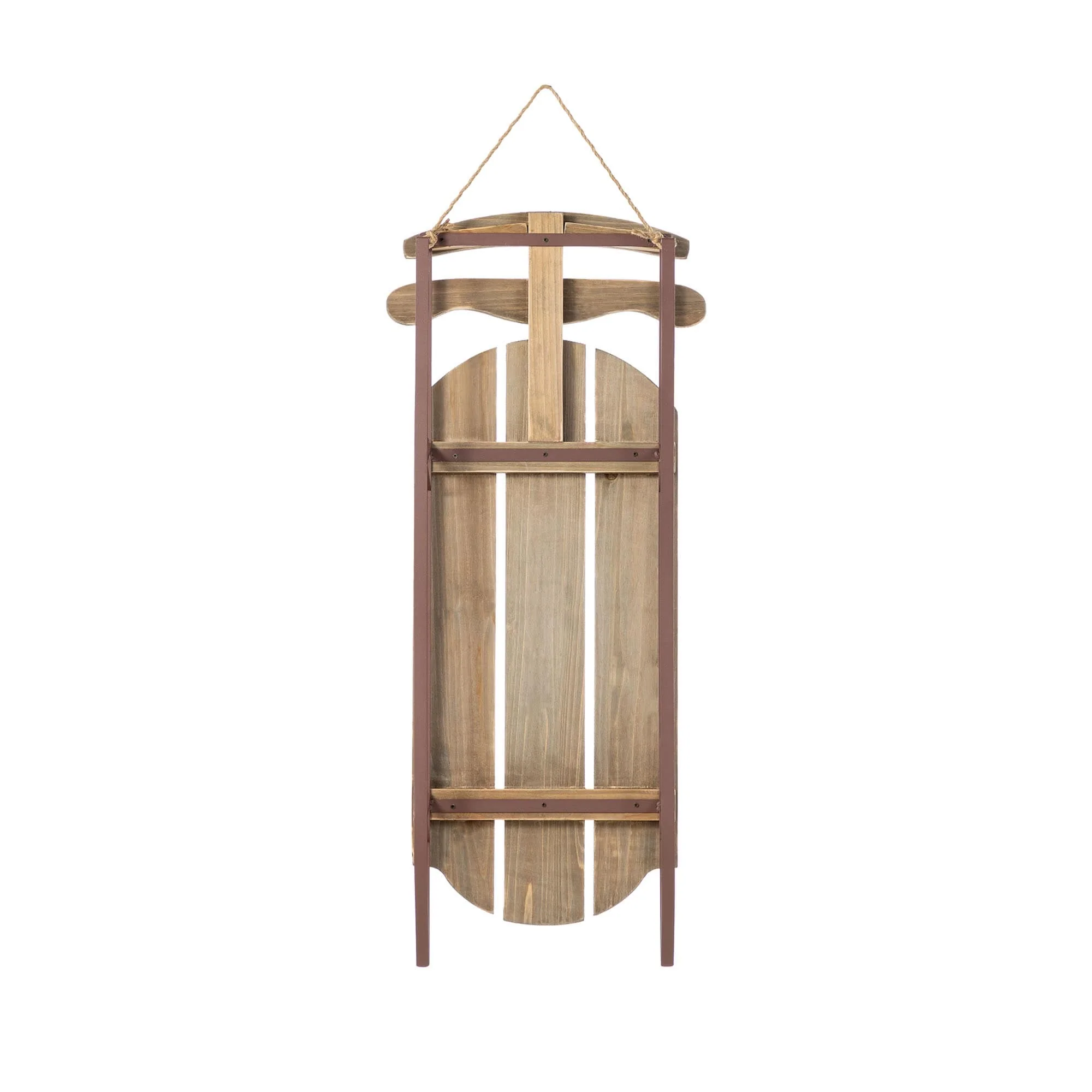 The 34.25"H Wooden Natural Christmas Porch Decor is a charming and rustic holiday decoration that features a classic sleigh design crafted from natural wood, offering a timeless piece that can be hung on doors or walls to add a warm and festive touch to any Christmas display.