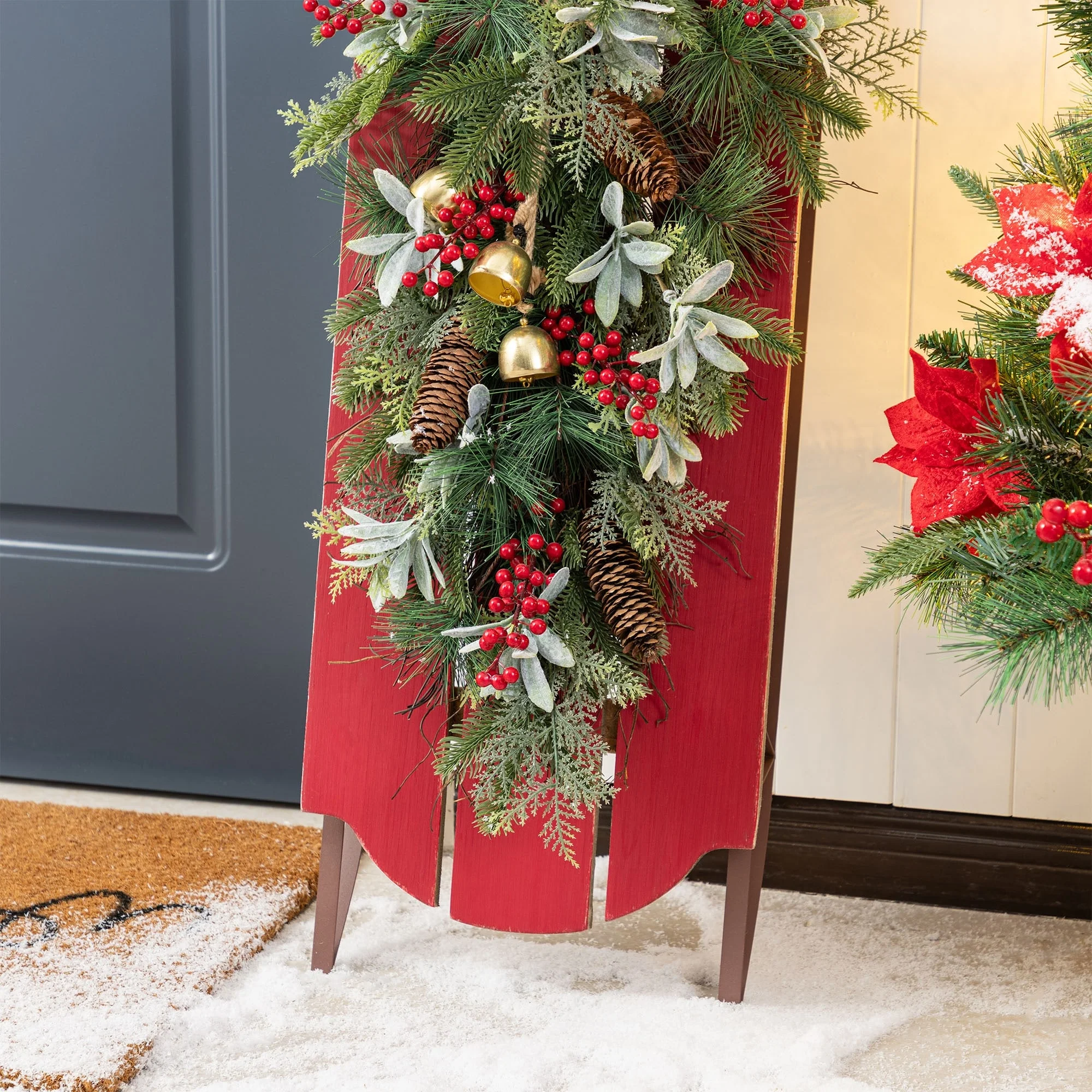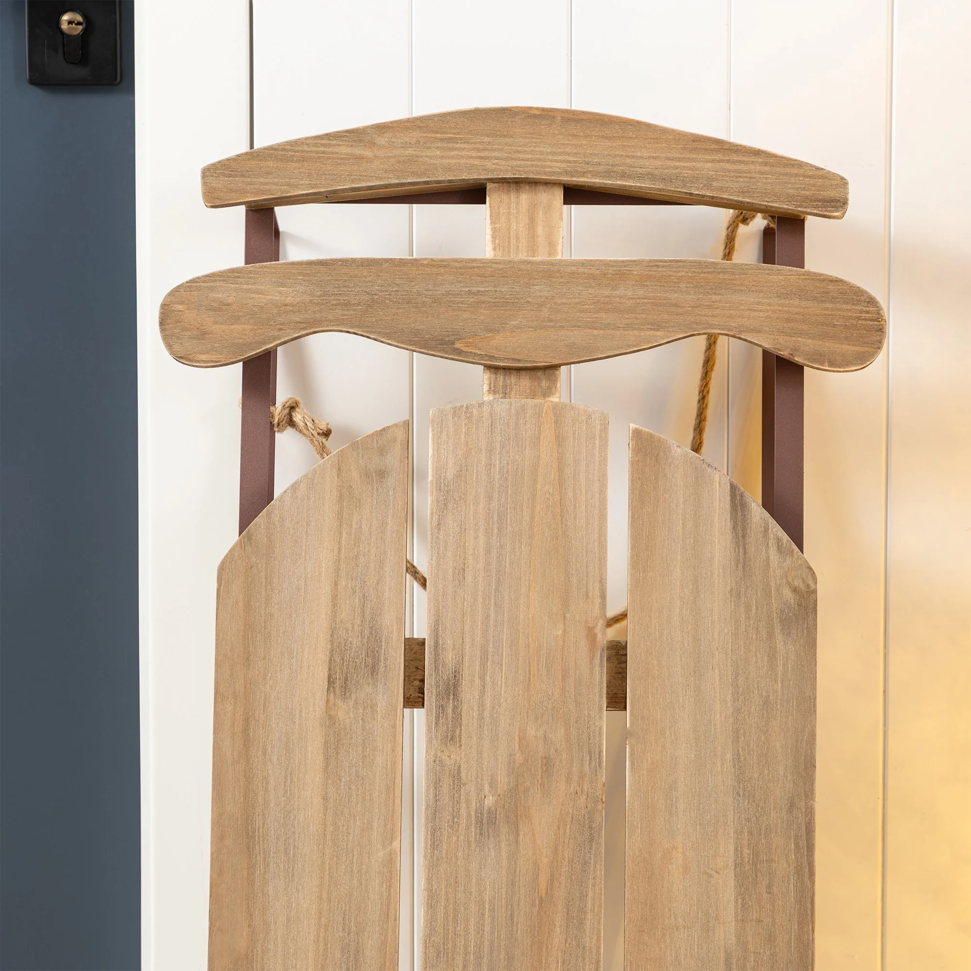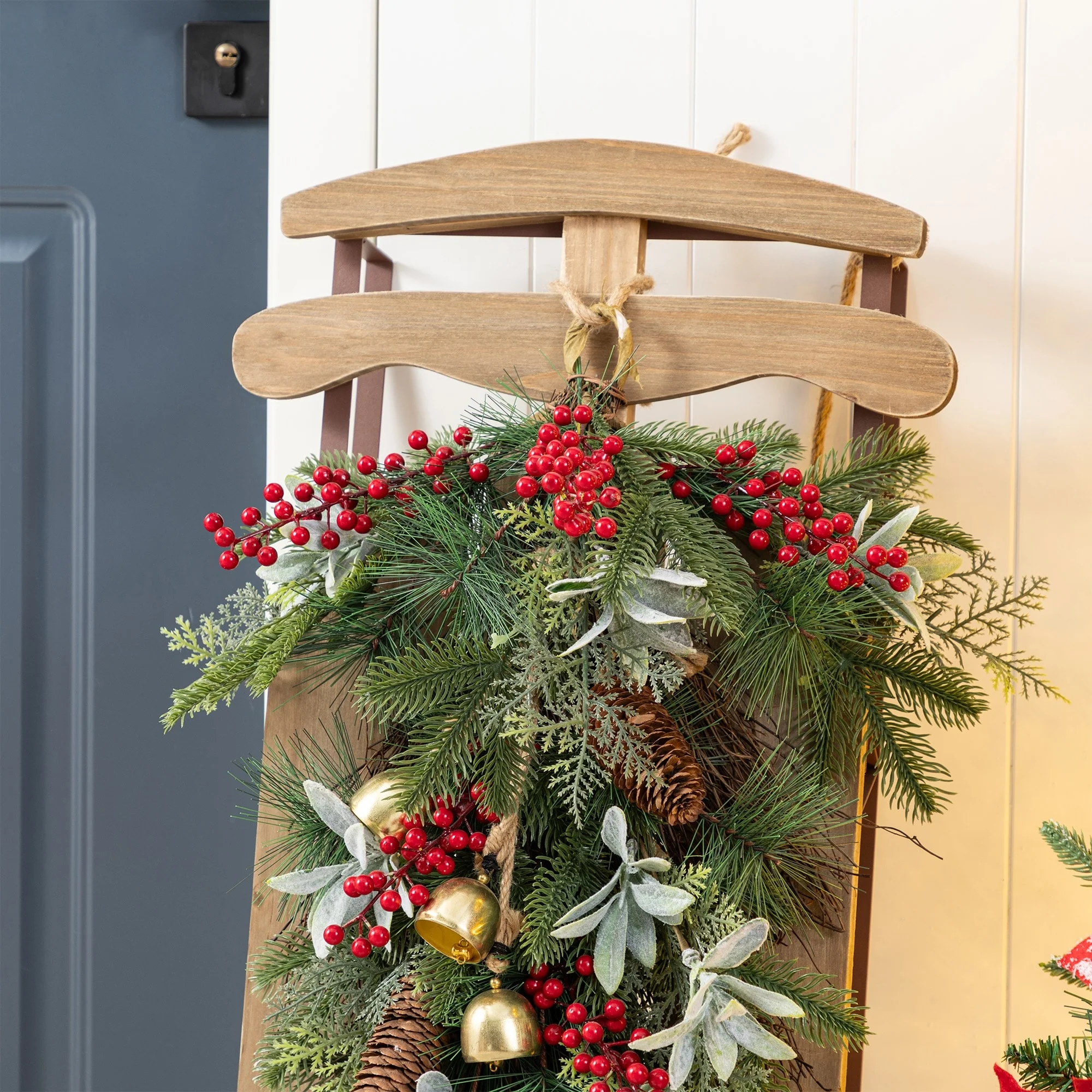The 34.25"H Wooden Natural Christmas Porch Decor is a charming and rustic holiday decoration that features a classic sleigh design crafted from natural wood, offering a timeless piece that can be hung on doors or walls to add a warm and festive touch to any Christmas display.