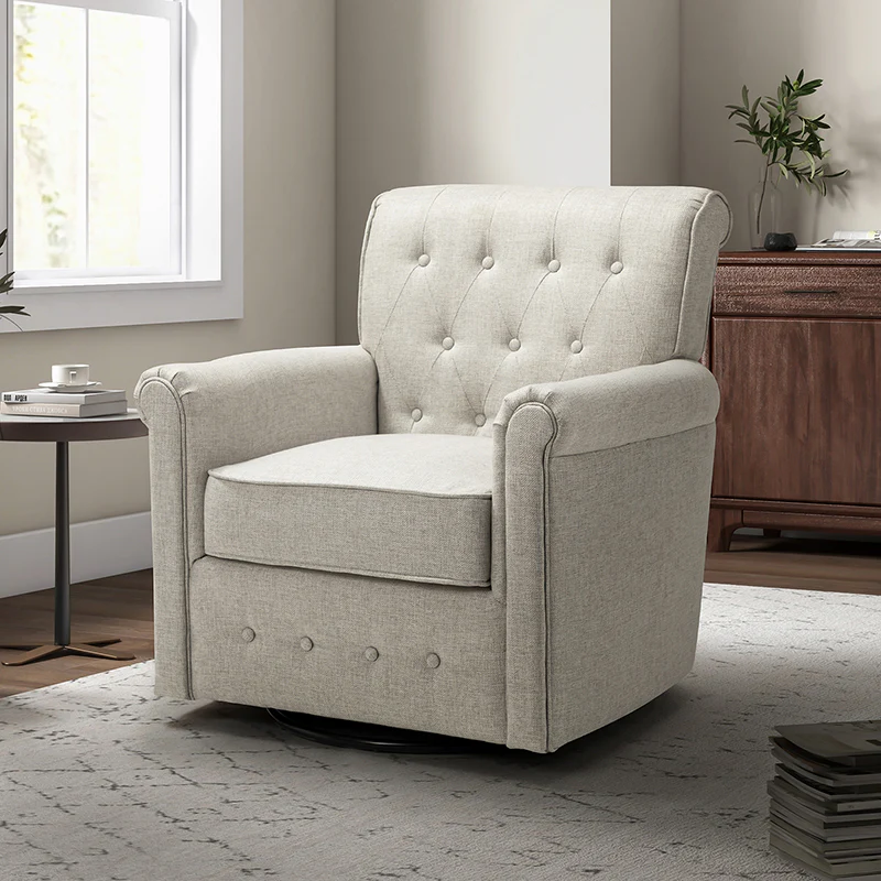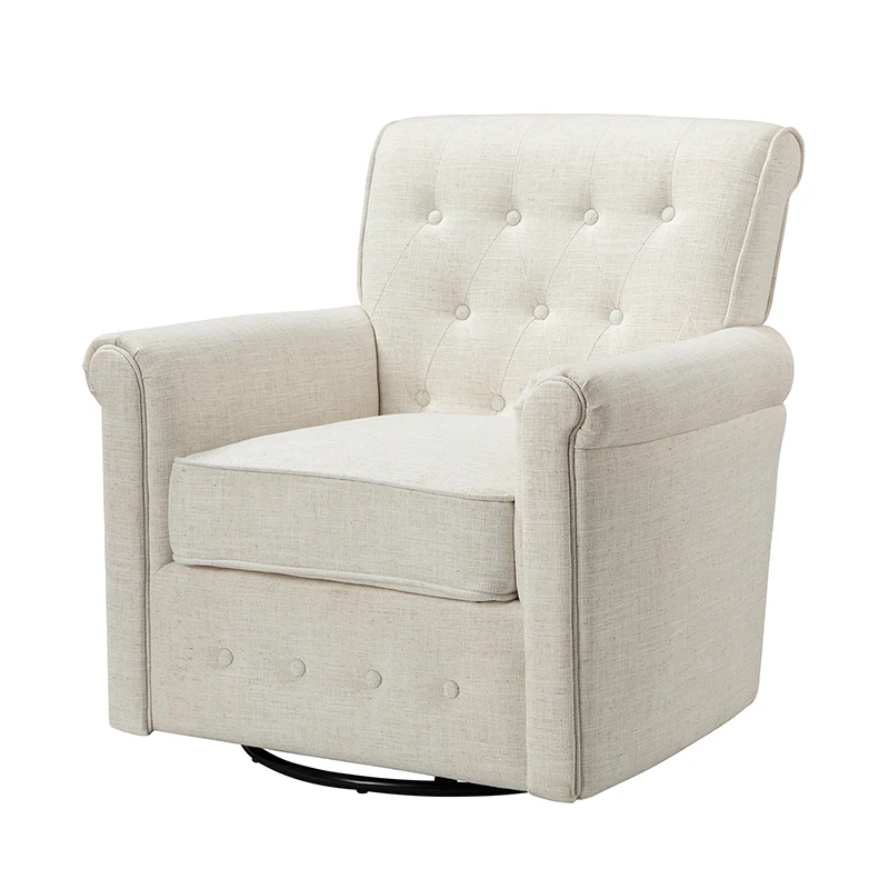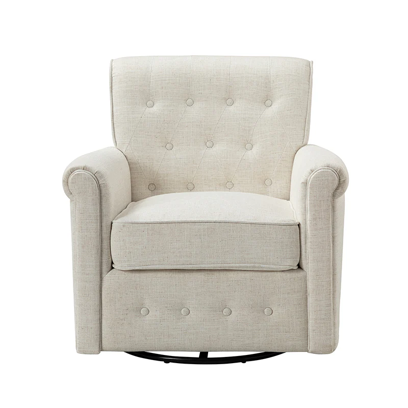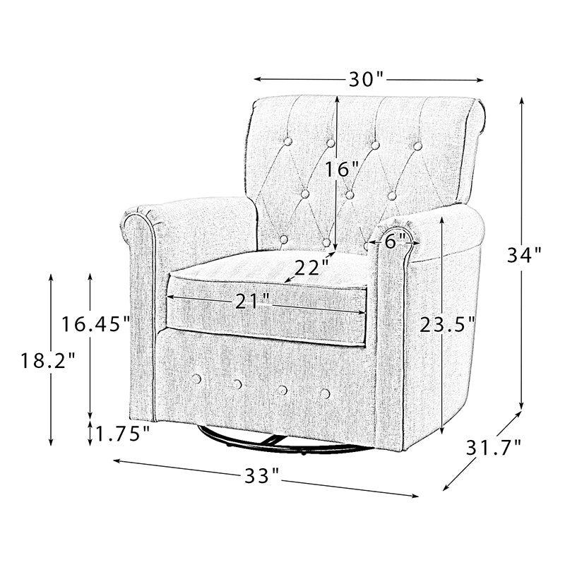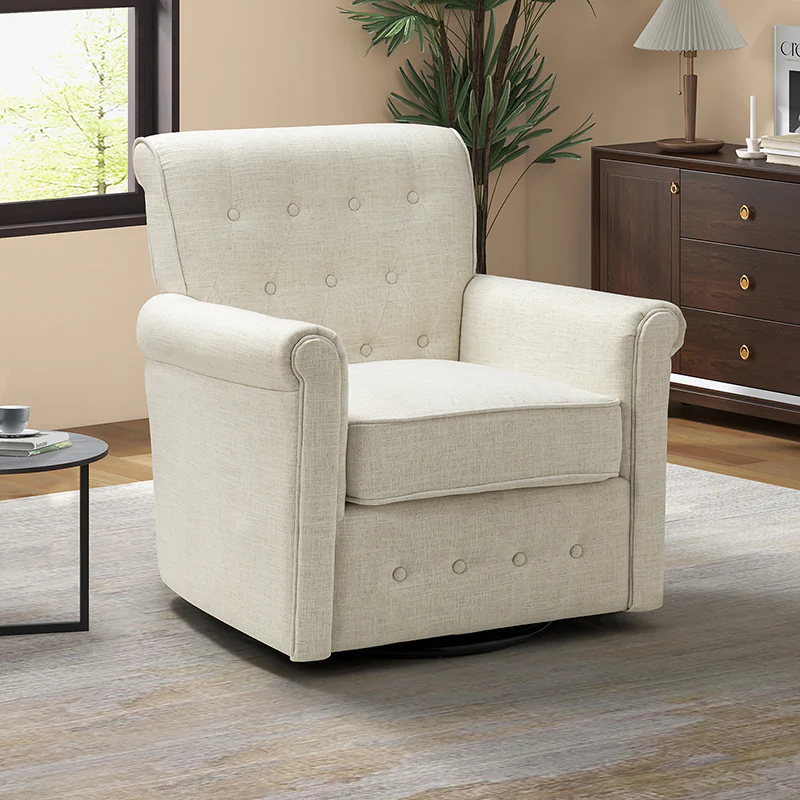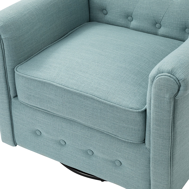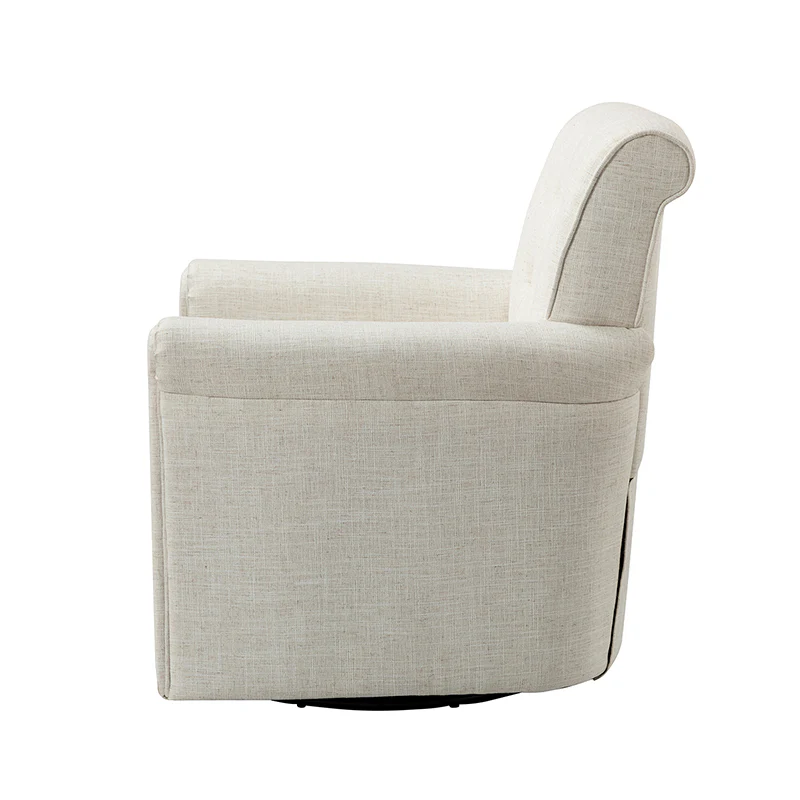 This swivel armchair is a great addition to perfecting your seating arrangement, providing the perfect perching spot for your home. The prominent design of this armchair is inspired by the major brands, the material texture is better, comfortable size and sitting feeling. Creative rolled armrests add a touch of classical style, while thick foam padding provides a comfortable sitting feel. Made with a soft 100% polyester wrap and a sturdy mix of wood and metal, this tufted armchair is long enough. Carrying up to 250 pounds on its own, this stunning accent swivel chair creates the perfect place to read, nap, or watch a game.