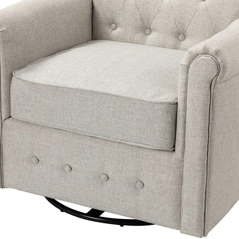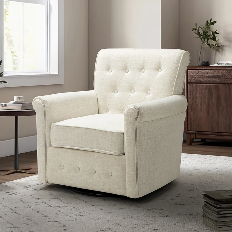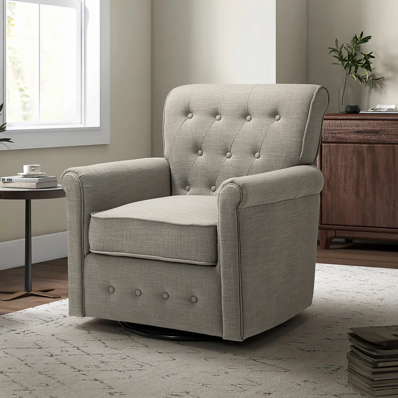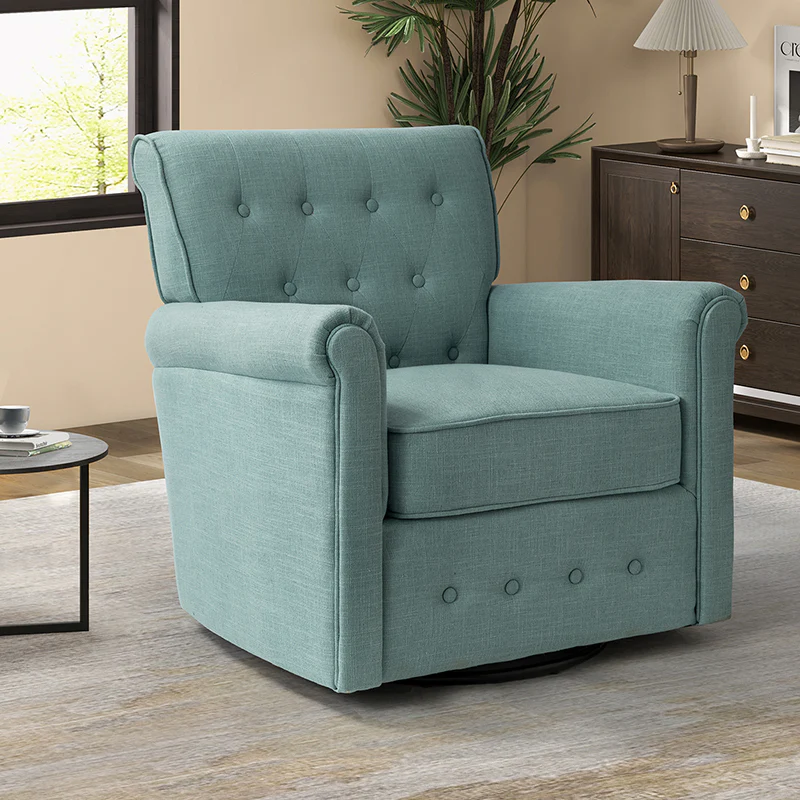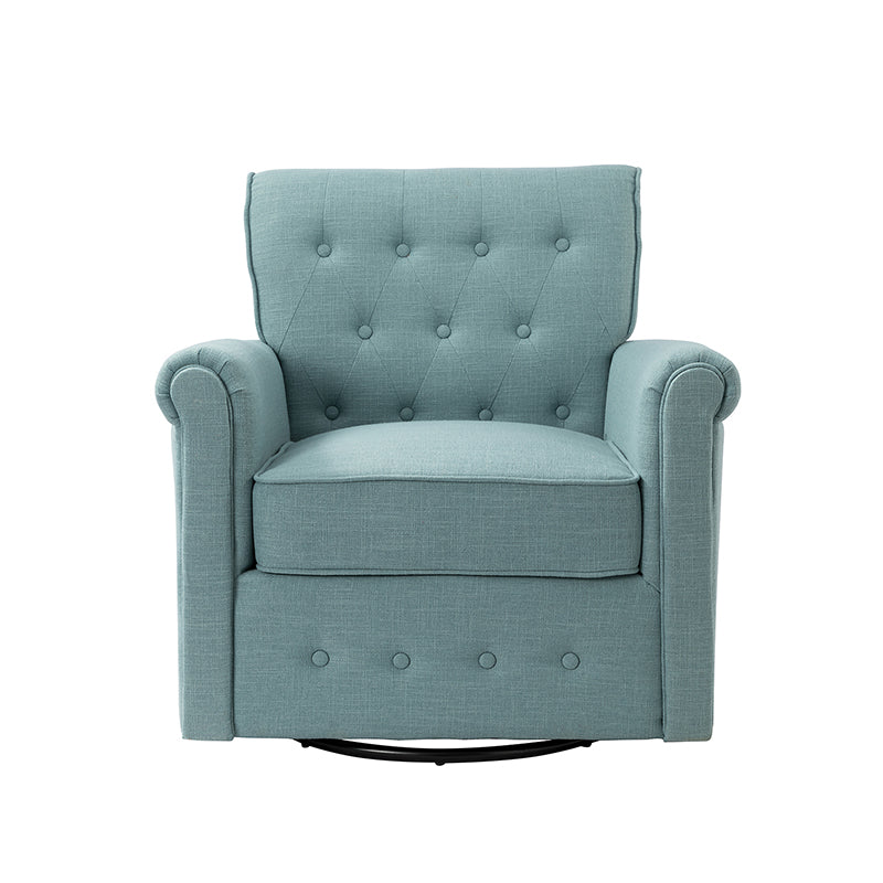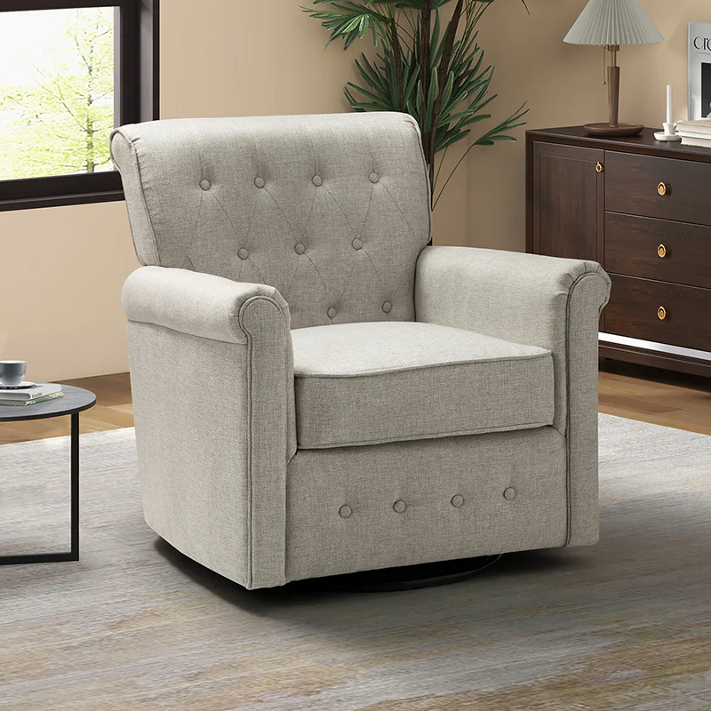 This swivel armchair is a great addition to perfecting your seating arrangement, providing the perfect perching spot for your home. The prominent design of this armchair is inspired by the major brands, the material texture is better, comfortable size and sitting feeling. Creative rolled armrests add a touch of classical style, while thick foam padding provides a comfortable sitting feel. Made with a soft 100% polyester wrap and a sturdy mix of wood and metal, this tufted armchair is long enough. Carrying up to 250 pounds on its own, this stunning accent swivel chair creates the perfect place to read, nap, or watch a game.