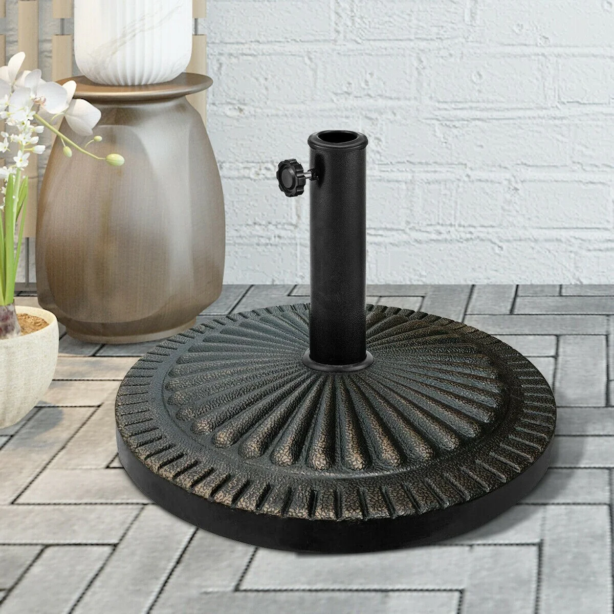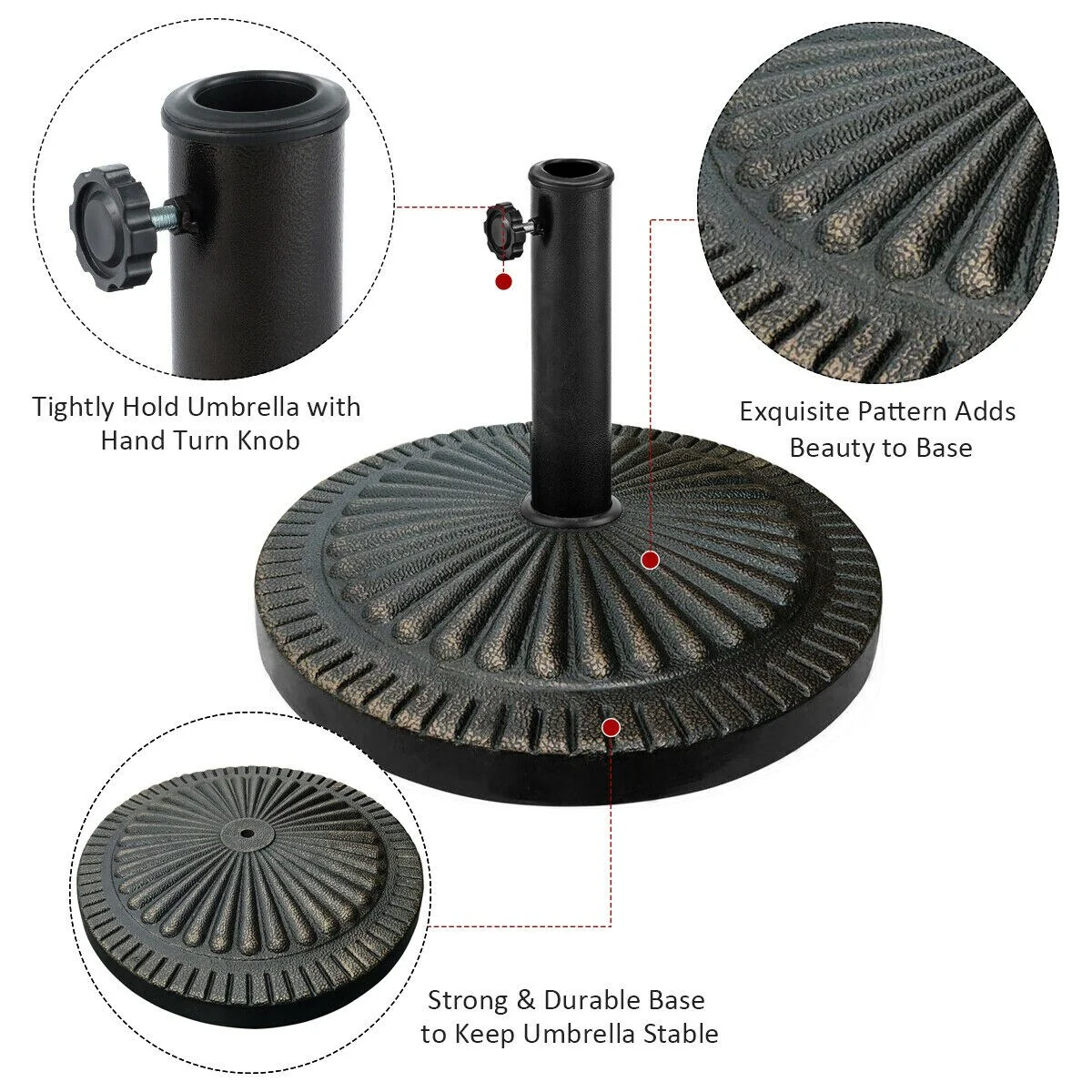 Whether it's rainy or windy, our umbrella base will stand in place to stabilize your umbrella with superior quality. Constructed of high-quality resin and stainless accessories, our umbrella base is aging resistant and heavy enough to withstand any weather conditions. It can be placed in many places like garden, patio, balcony and poolside so that you and your guests can enjoy quality sun protection while relaxing in hot summer day. With antique styling and elegant finish, it's designed in retro style to bring additional beauty to your house. Comes with all required accessories, it is easy to install the umbrella base with instruction by yourself.