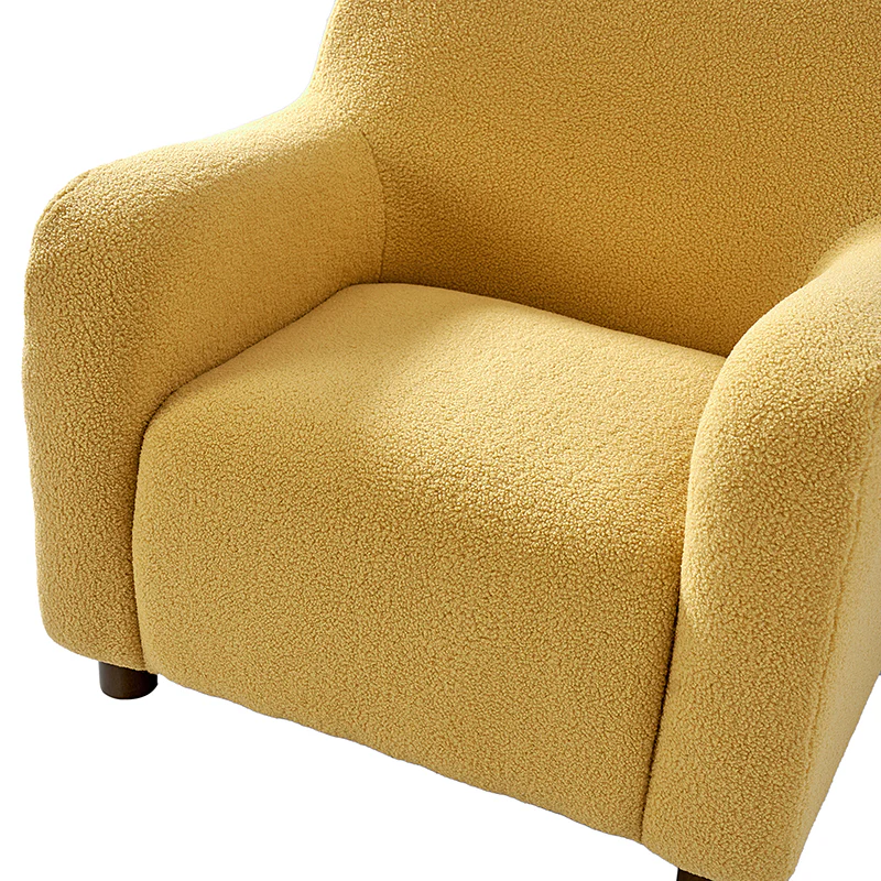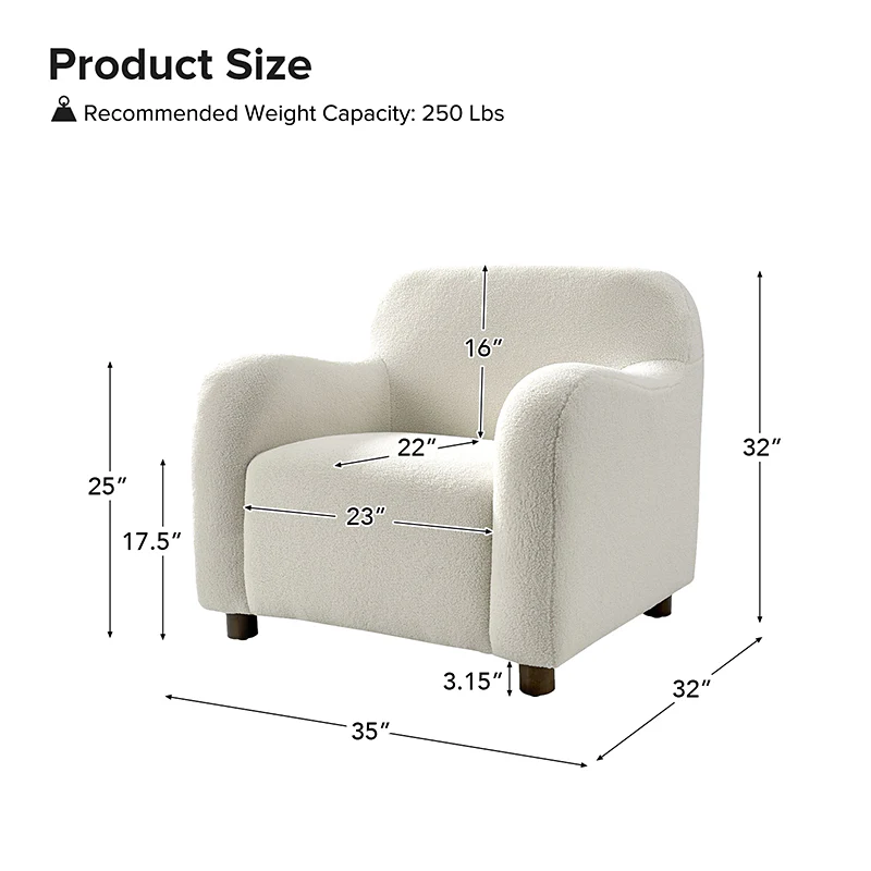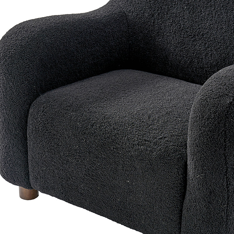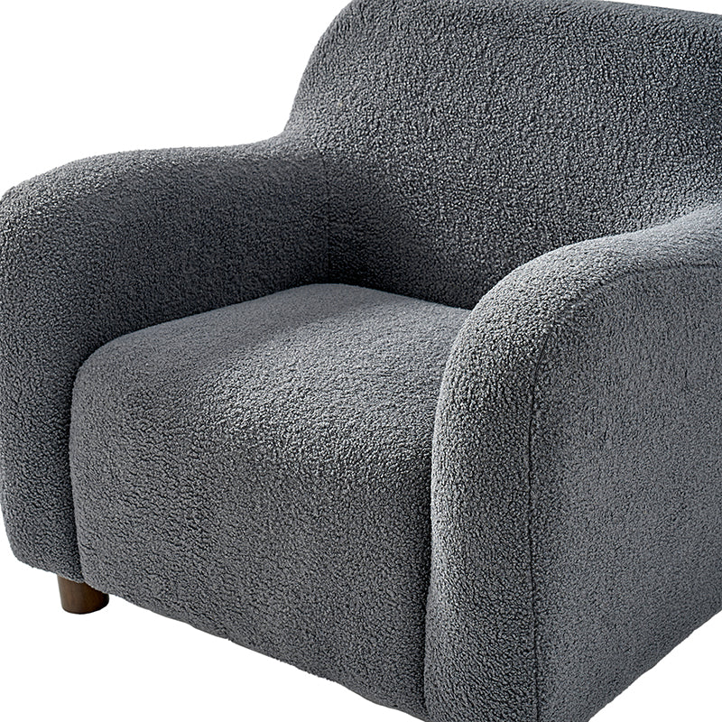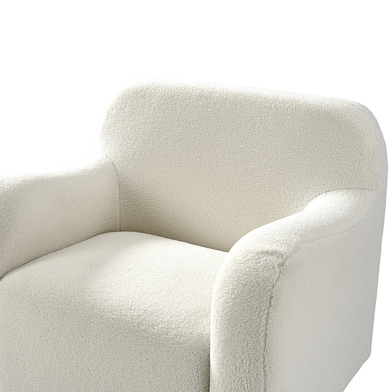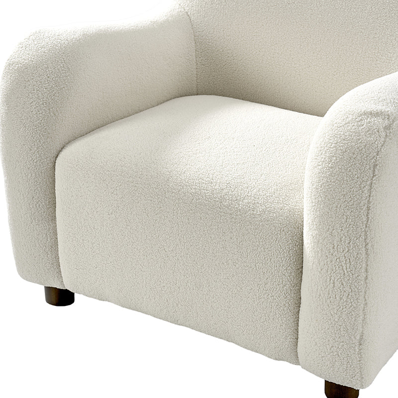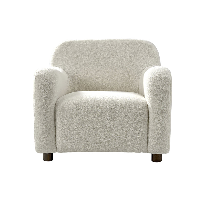 Presenting a contemporary upholstered armchair seamlessly adaptable to both living room and bedroom. Embodying the appeal of creamy style, this accent chair features quality lamb wool cloth upholstery, creating an inviting and cozy atmosphere. The solid wood legs add a touch of natural elegance and ensure sturdiness and stability. Designed for convenience, the armchair boasts a three-minute assembly, requiring only the attachment of the rubber wood legs. This time-saving design enhances the overall user experience, making it a choice for various spaces. Elevate your space with this modern armchair, where style meets functionality for moments of relaxation.