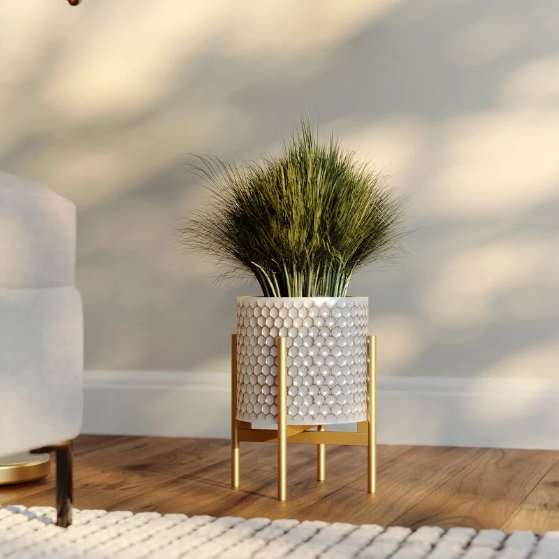 This modern planter gives your potted plants a stylish, sophisticated home with its gold and white embellished honeycomb pattern. Its robust, round shape and gold stand combine for a modern, elegant accent. The white and gold palette of the planter exude a classic mid-century modern style characterized by metallic accents and clean lines, with the slightest hint of glam from the gold-hued interior. Flourish your home with modern decor with this winning accent piece on your mantle, shelf, table, or floor, as it fits in a variety of spaces. The planter's ample size lets both real and faux potted plants shine wherever it sits.