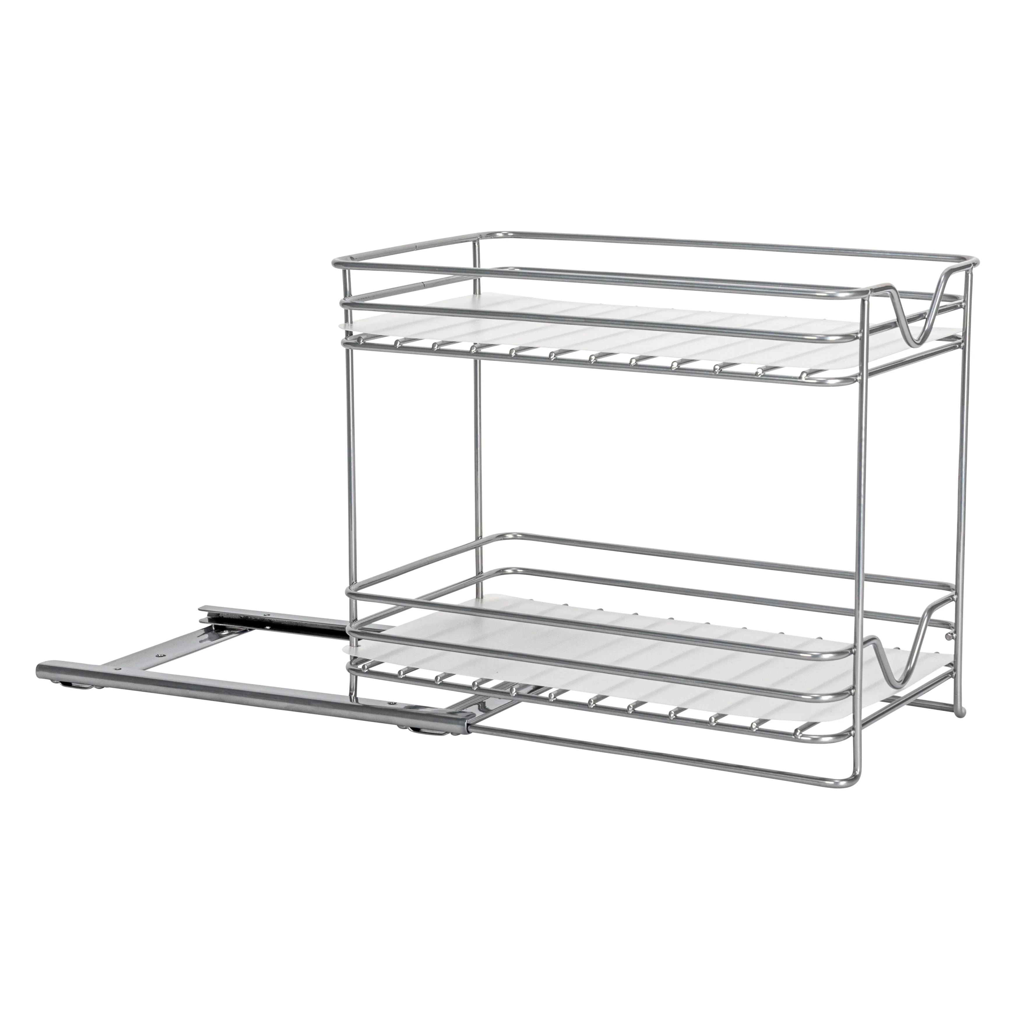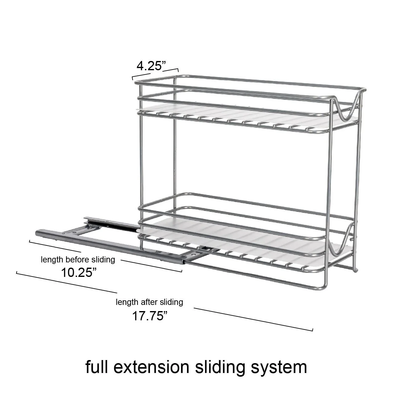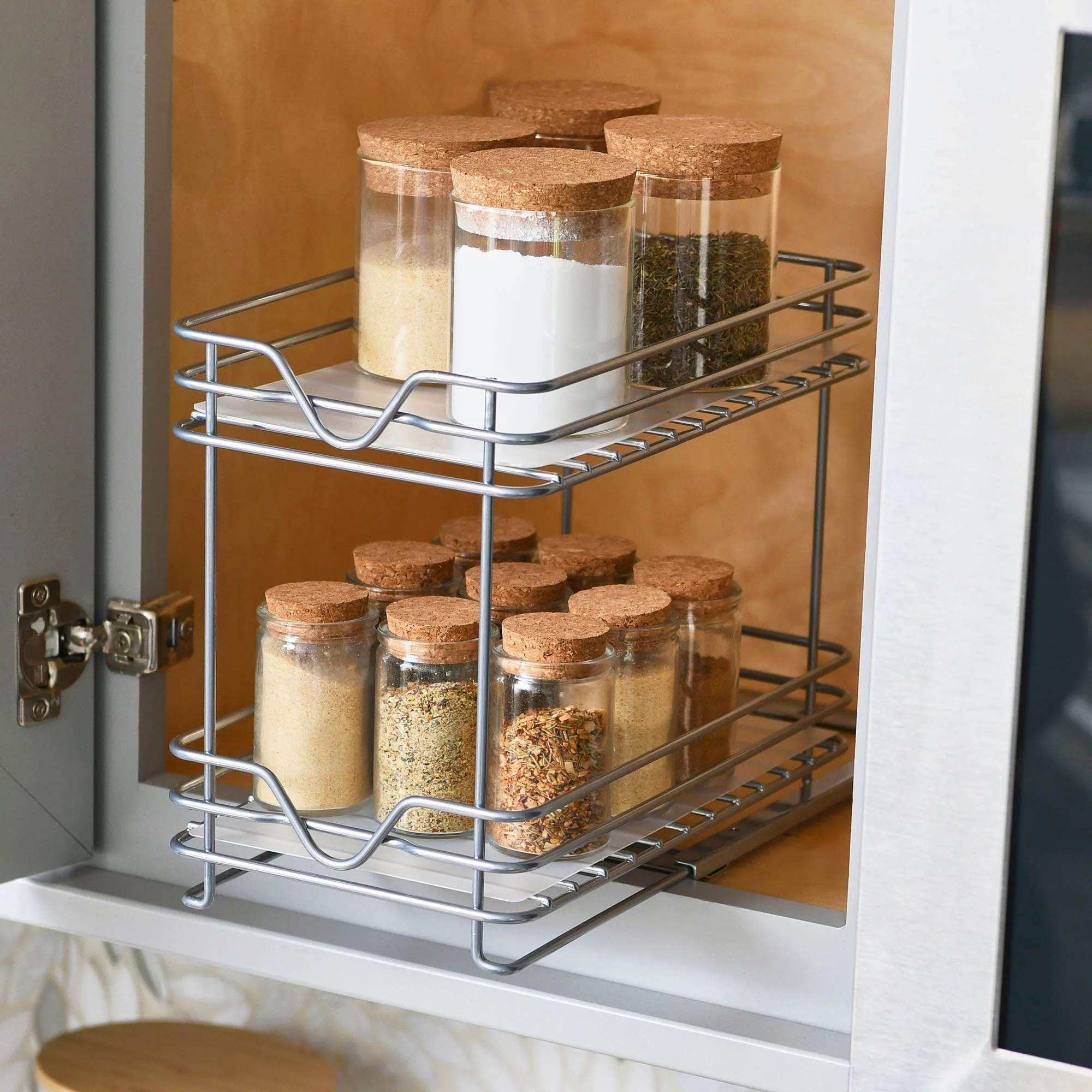 - This cleverly designed, durable powder-coated steel organizer is crafted to serve as a 2-tier spice rack or for neatly corralling small essentials; Equipped with an easy-mount full-extension sliding base
