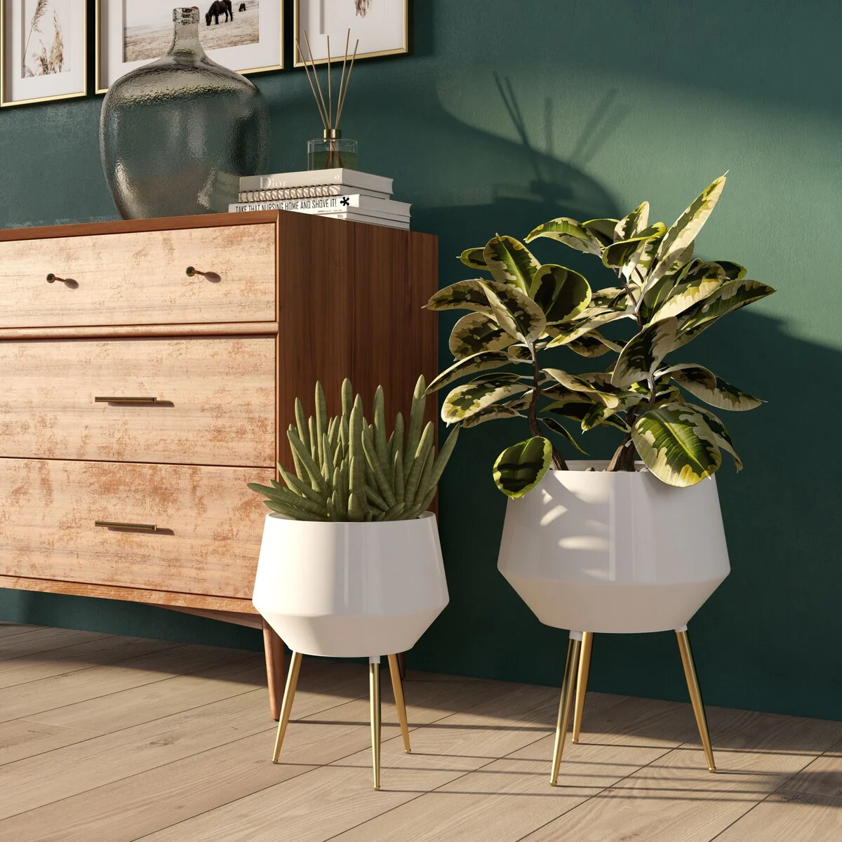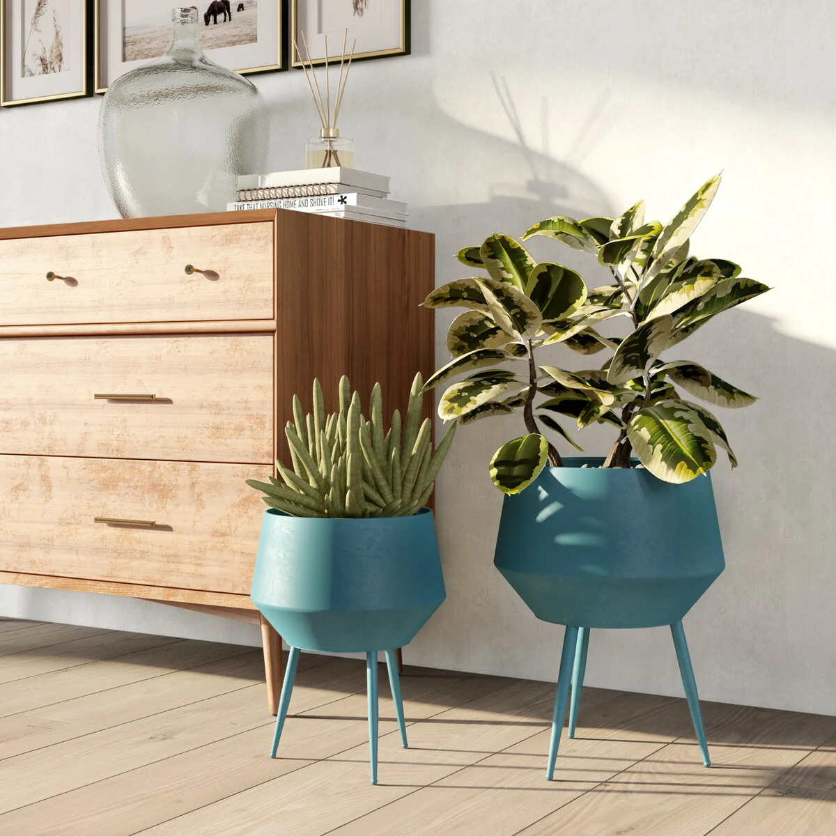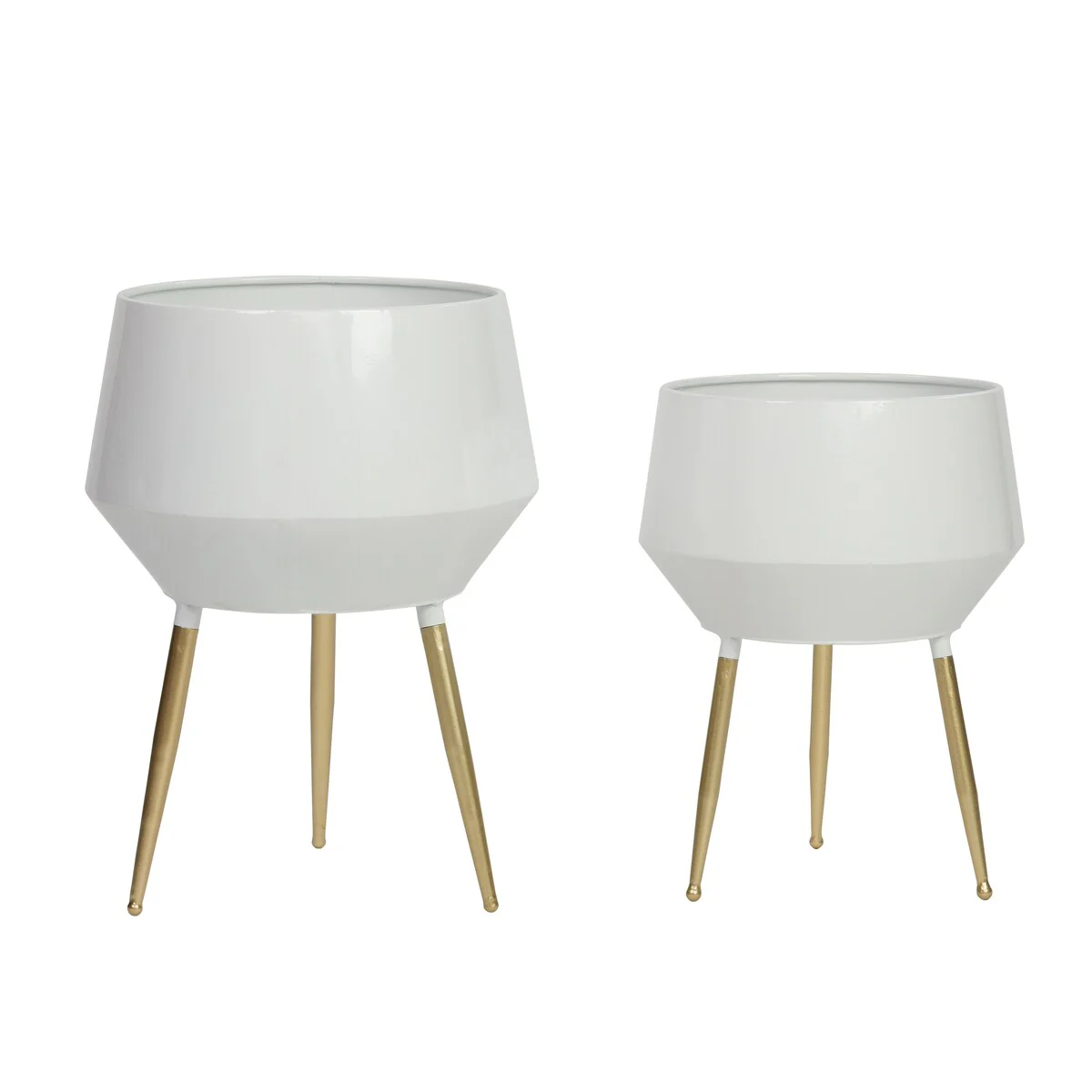 Add a touch of retro cool to your home with this set of Huxley Mid Century Modern Planters. Made with sleek metal craftsmanship and a geometric-inspired design, these planters are perfect for adding a touch of greenery to your space. Whether as floor decor or table-top accents, these versatile planters will complement any modern, mid-century modern, or industrial decor.