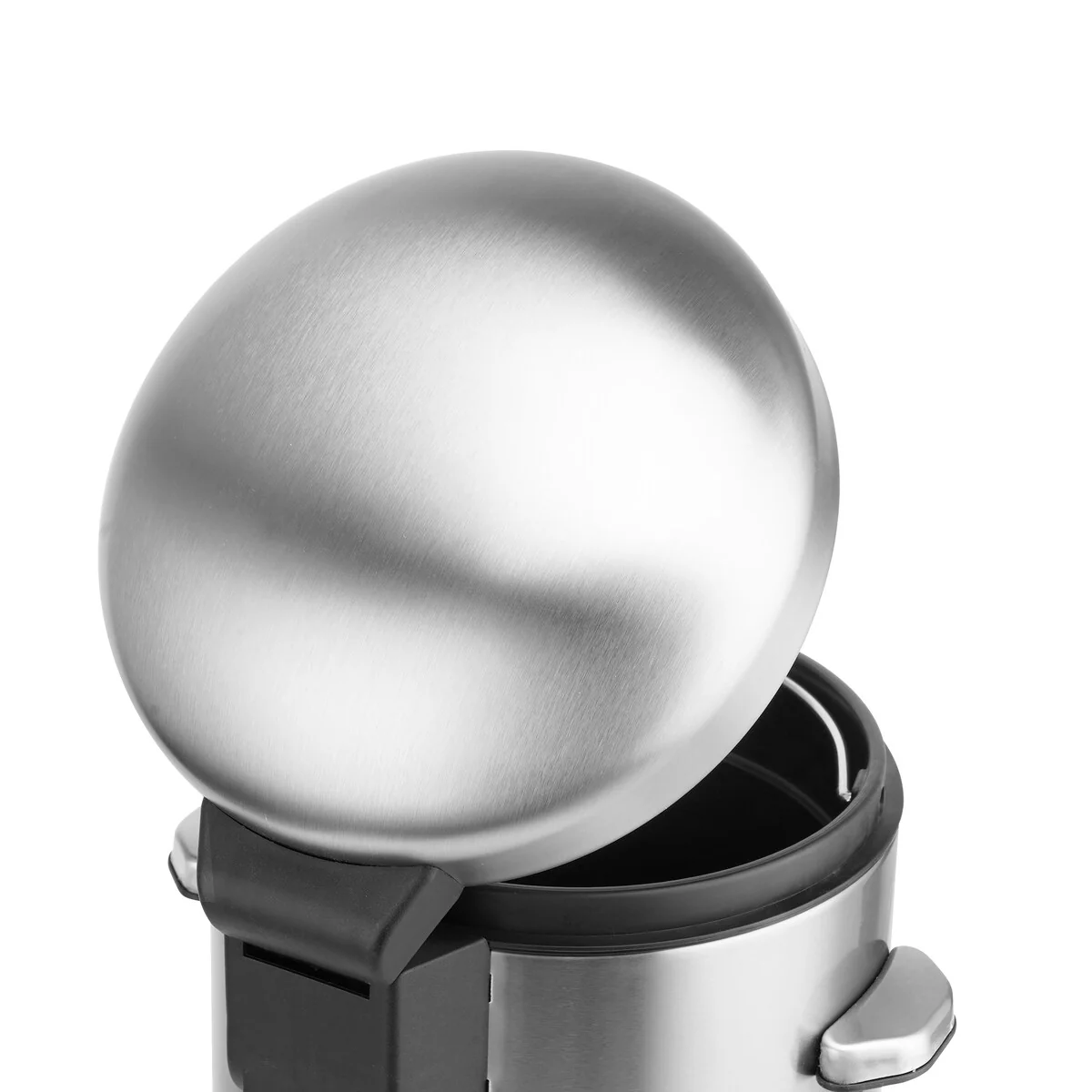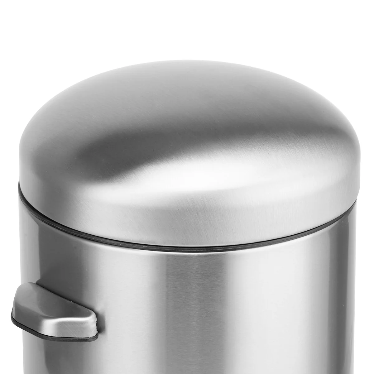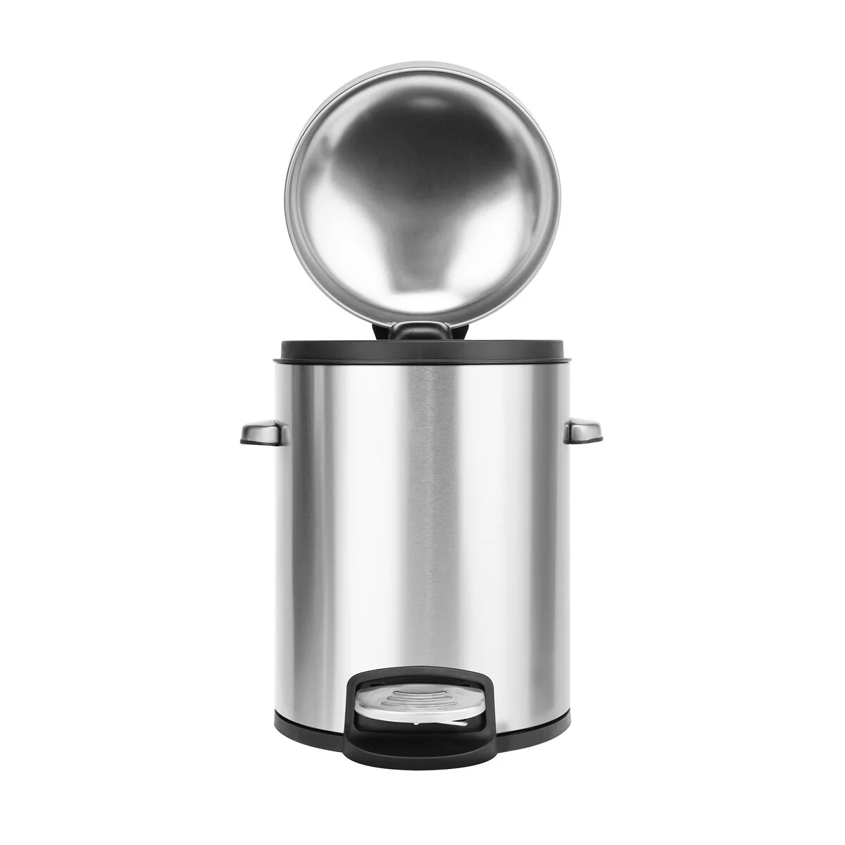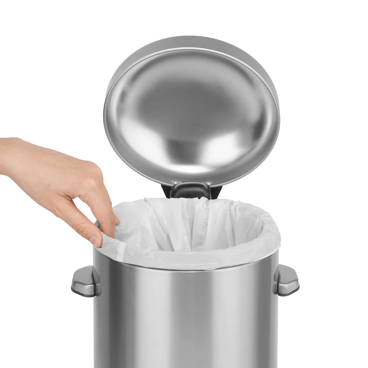 A retro look round shape 1.32gallon/5 liter stainless steel trash can with hands free operation and a quiet slow close lid. The strong foot pedal structure will provide many years of trouble free use. A removable inner plastic bucket can be used with or without a trash bag. A large handle makes for convenient moving and lifting. A non-skid base keeps the trash can steady and protects floors. In brushed stainless steel with fingerprint resistant finish.