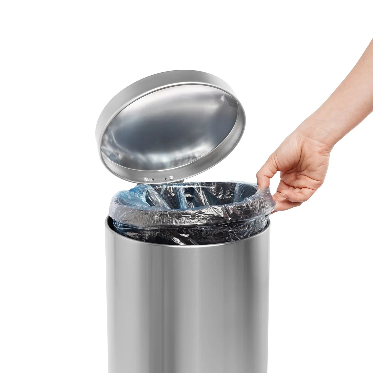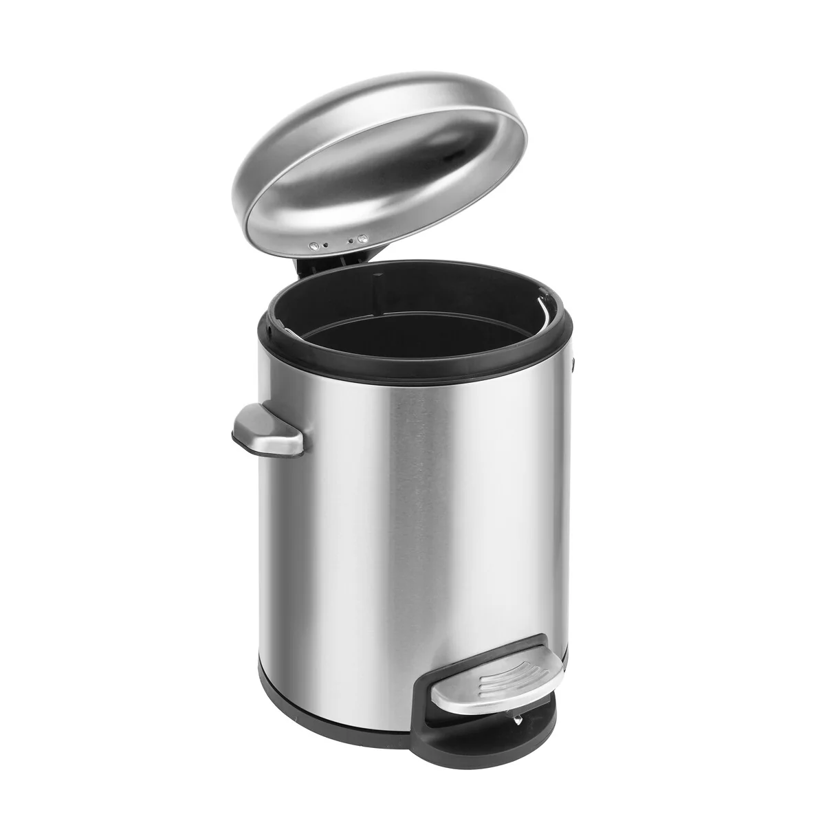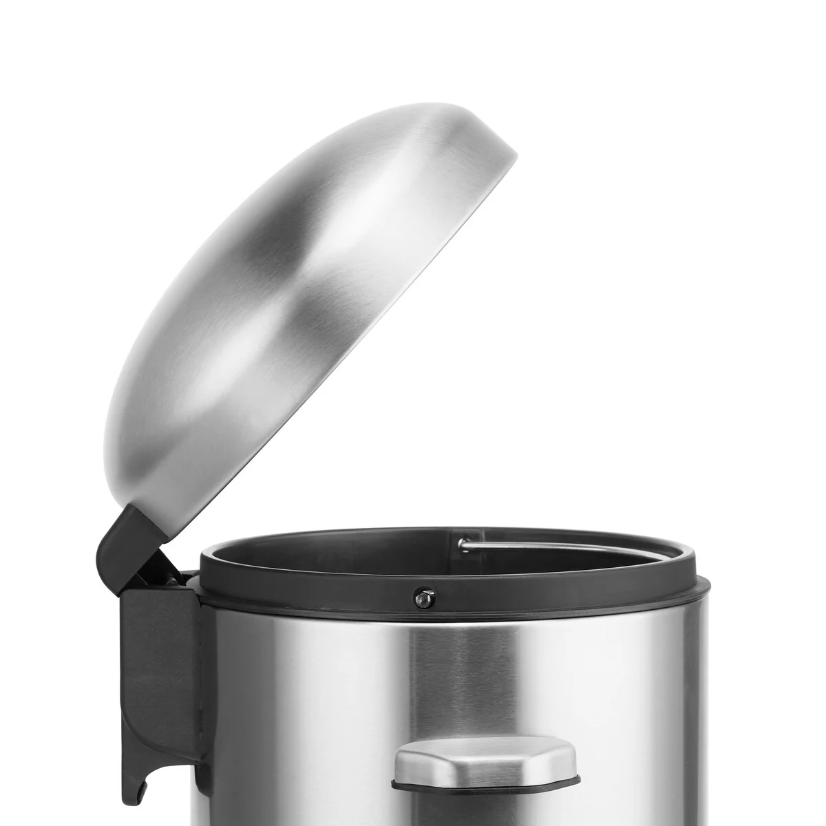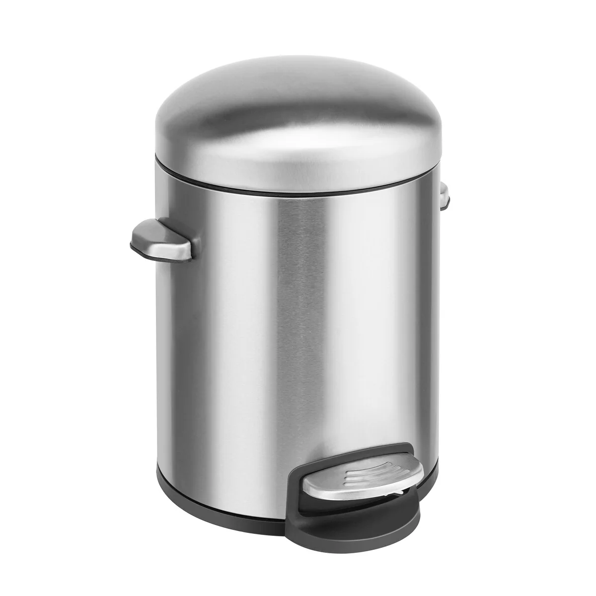 A retro look round shape 1.32gallon/5 liter stainless steel trash can with hands free operation and a quiet slow close lid. The strong foot pedal structure will provide many years of trouble free use. A removable inner plastic bucket can be used with or without a trash bag. A large handle makes for convenient moving and lifting. A non-skid base keeps the trash can steady and protects floors. In brushed stainless steel with fingerprint resistant finish.