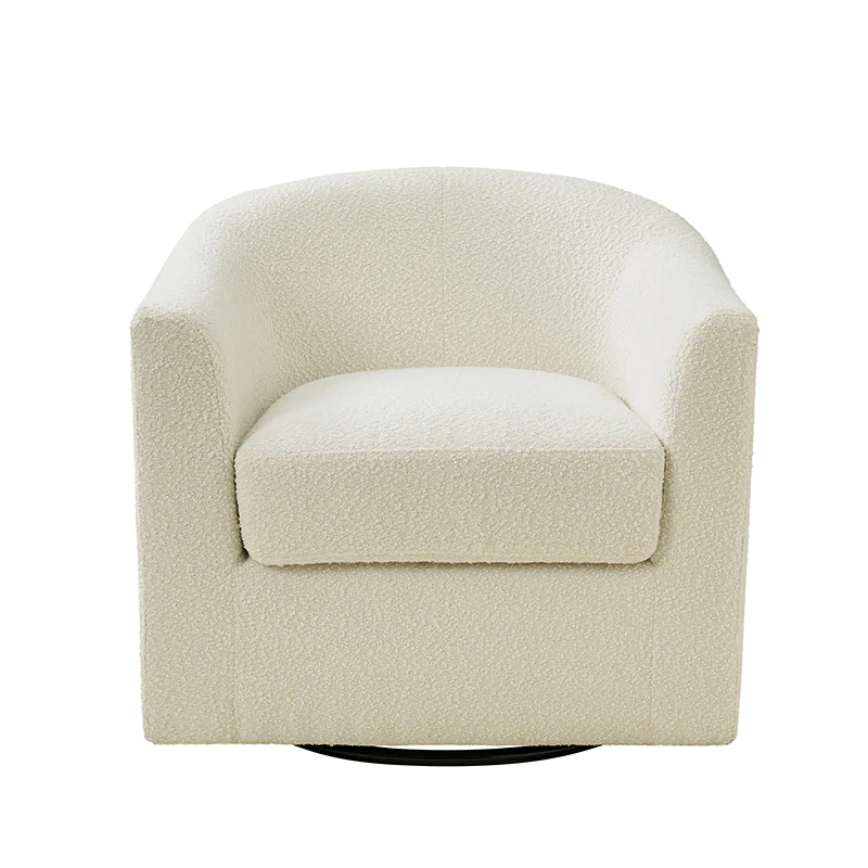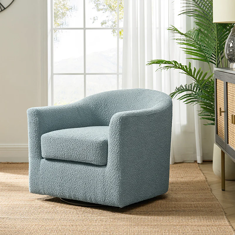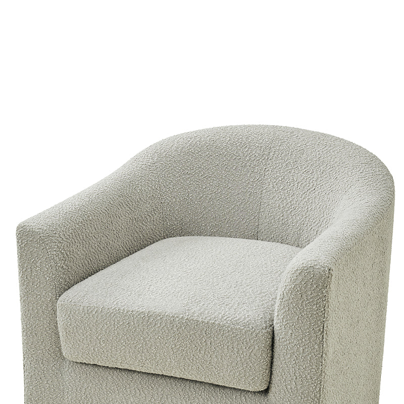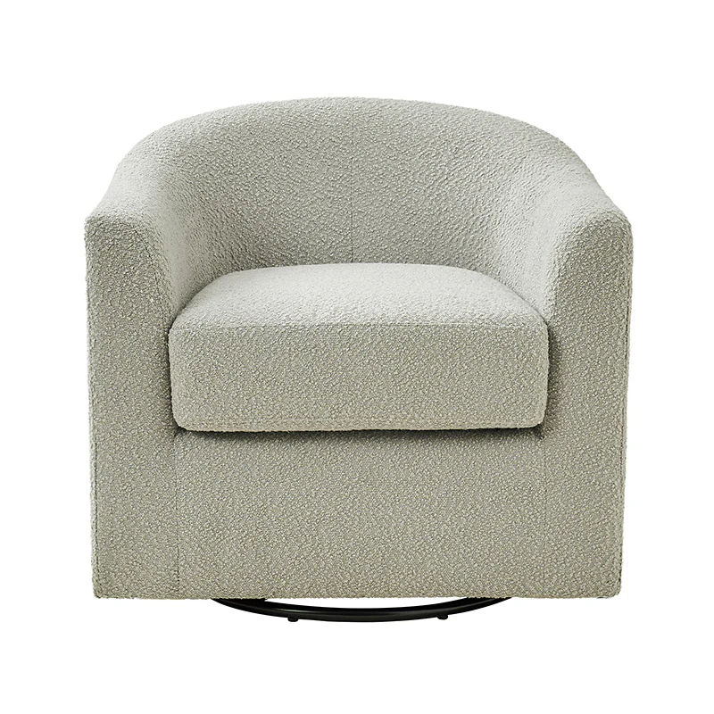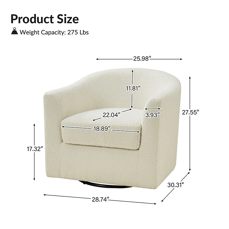 This modern swivel chair showcases a distinctively curved and ergonomic barrel shape, ensuring a unique and satisfying seating experience in your living room, bedroom, home office, and beyond. With its 360-degree swivel, mobility is elevated, enabling effortless rotation and interaction with your surroundings. Meticulously crafted, the chair is upholstered in a specially chosen, soft 100% polyester fabric, enhancing the overall comfort. Versatility and style converge in this swivel barrel chair, making it a sophisticated addition to the contemporary living space. Its sleek and modern design effortlessly complements your home decor, blending functionality with chic aesthetics.