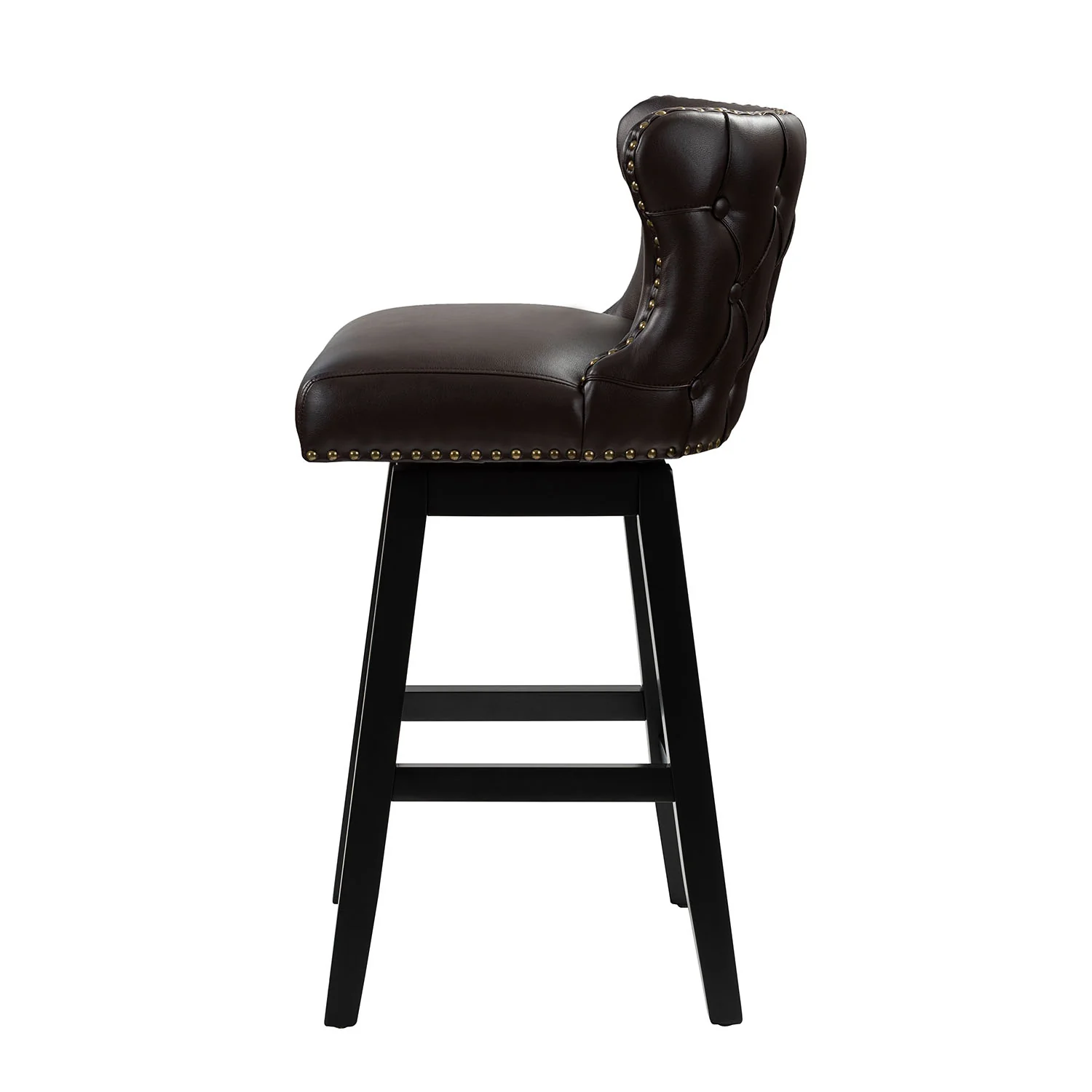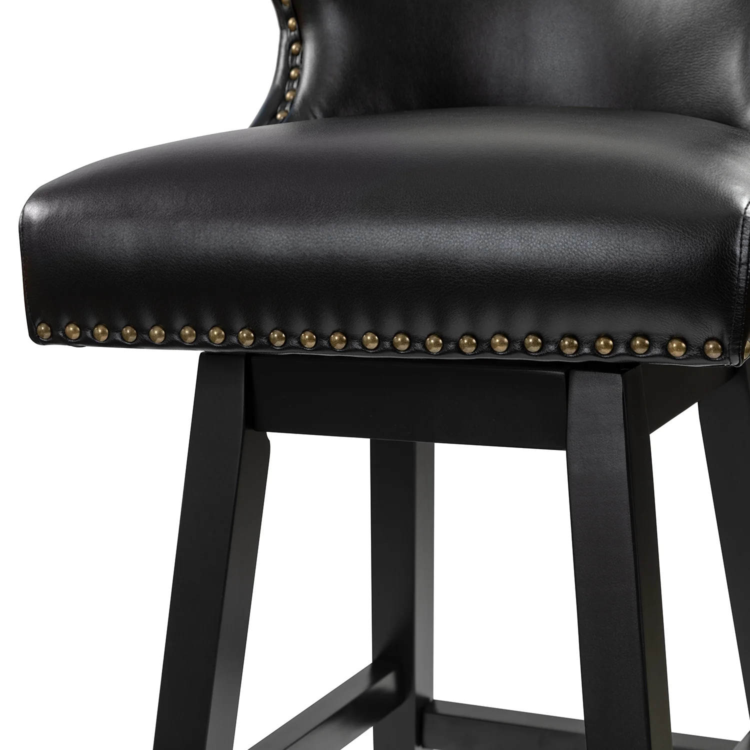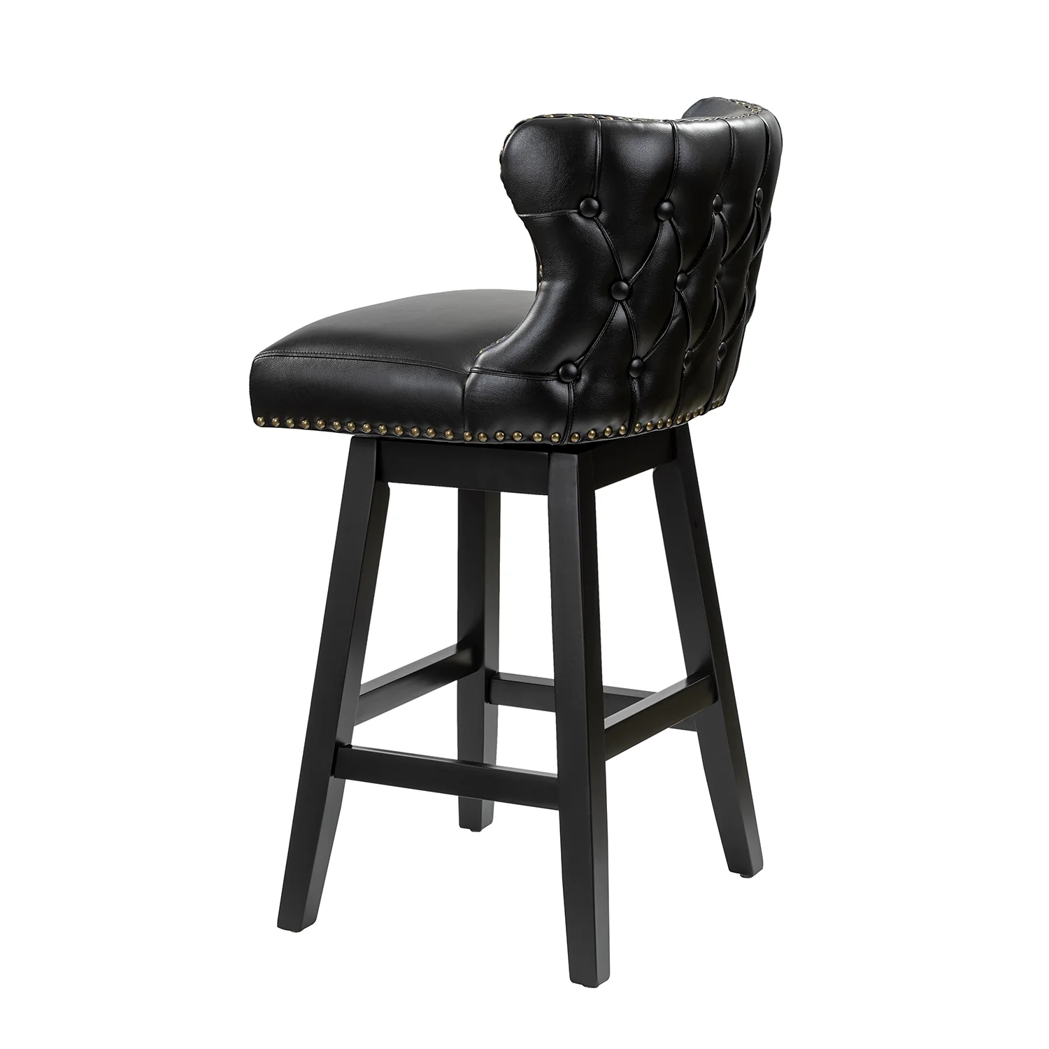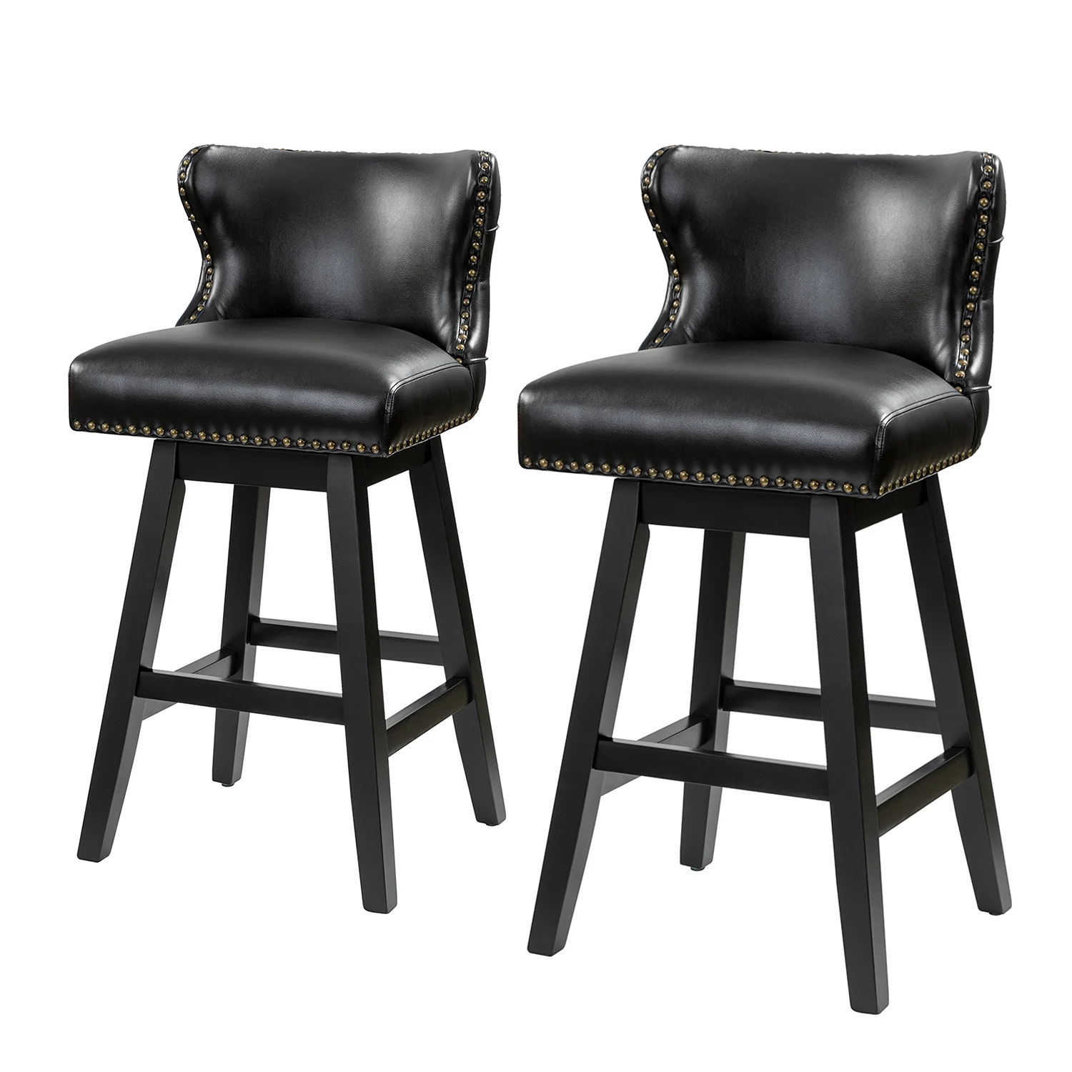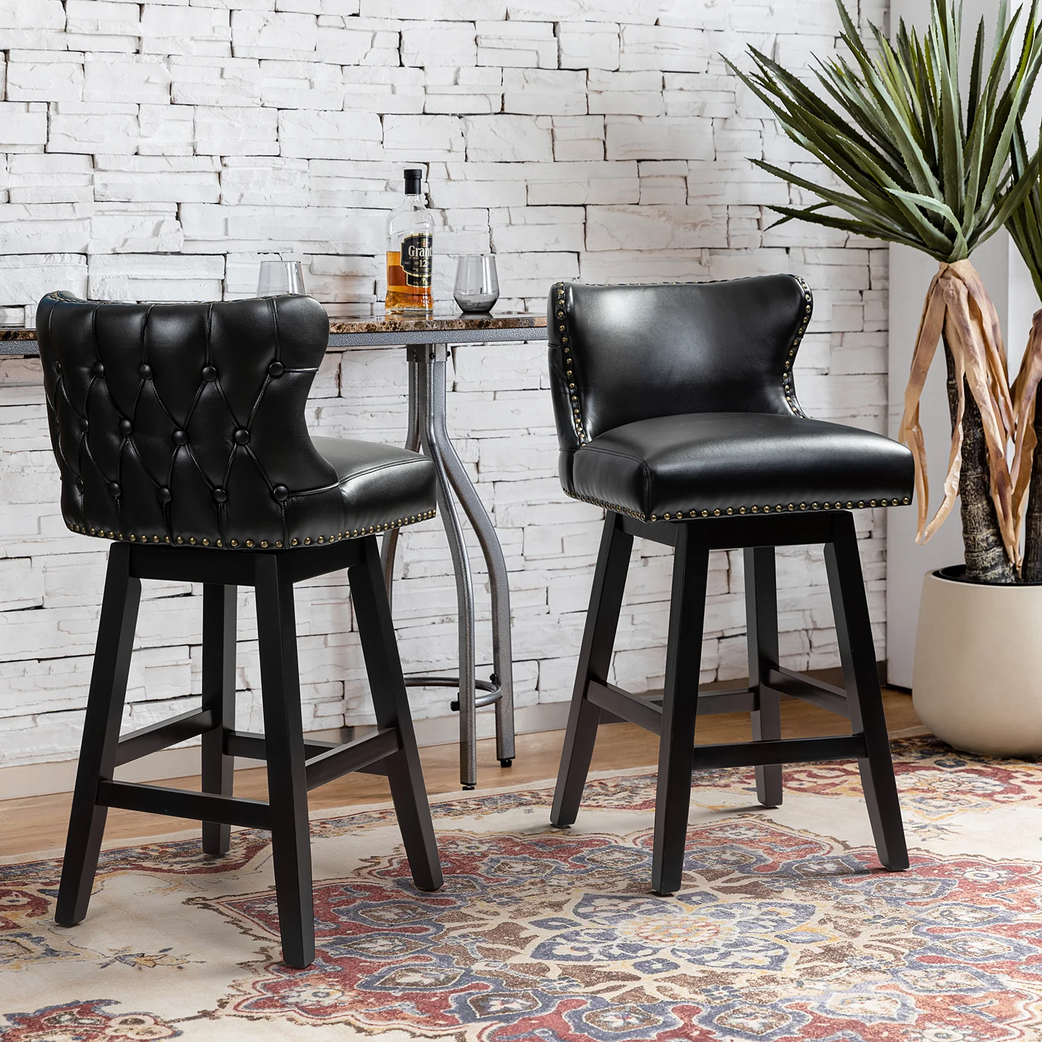 Introducing our exquisite wingback 360-degree swivel bar stool set of 2. Complements traditional, transitional, vintage, and classic home styles, these bar stools are designed to elevate your home decor. The timeless wingback silhouette, adorned with chic button tufting, creates a sense of refinement and sophistication. Adding a touch of glamour, the nail-head trim delicately frames the backrest. Crafted from smooth premium vegan leather, the traditional bar stool set is not only cruelty-free but also waterproof and resistant to oil stains, ensuring long-lasting beauty and easy maintenance. The sturdy wood footrests provide stability and comfort, while the quality foam cushioning ensures a plush and cozy seating experience. Elevate your home bar or kitchen counter with these bar stools that effortlessly blend style and practicality.
