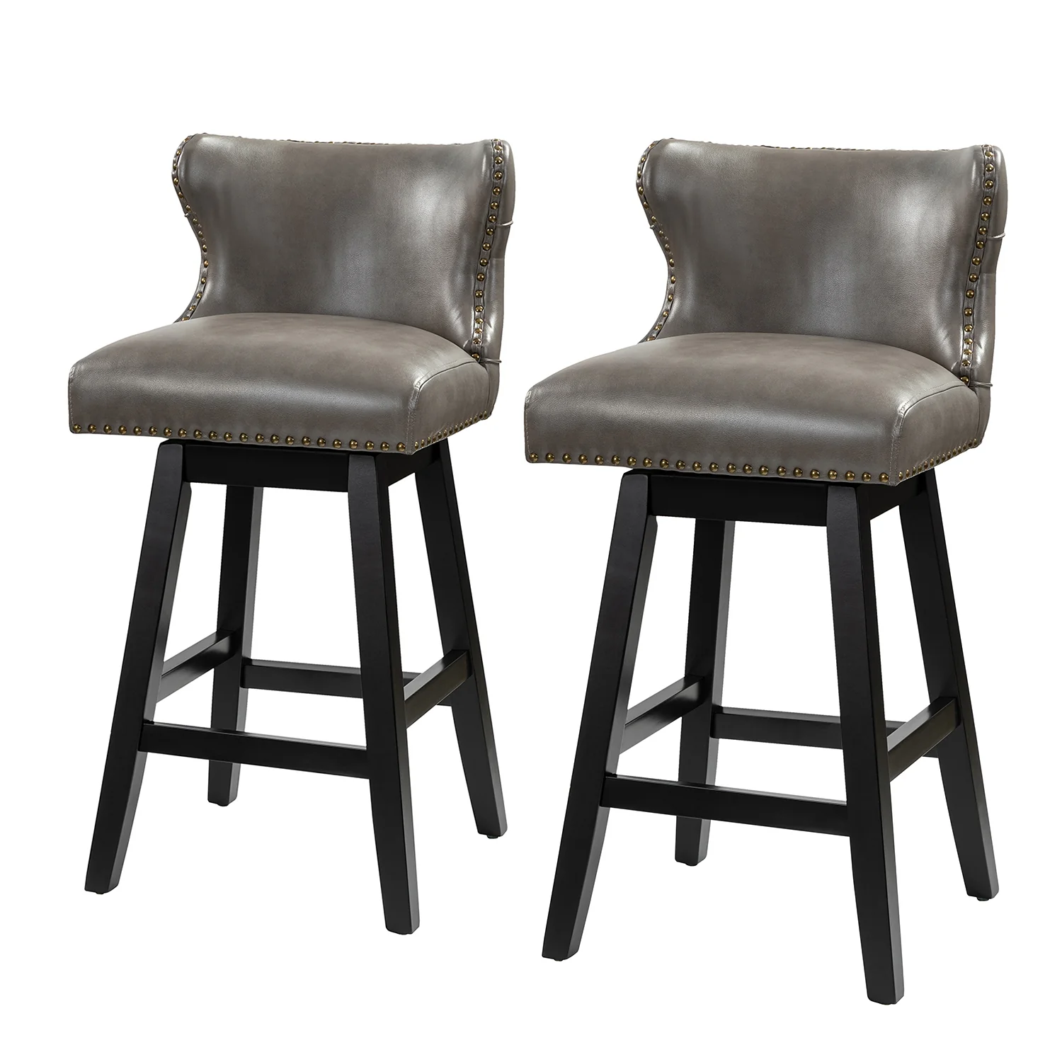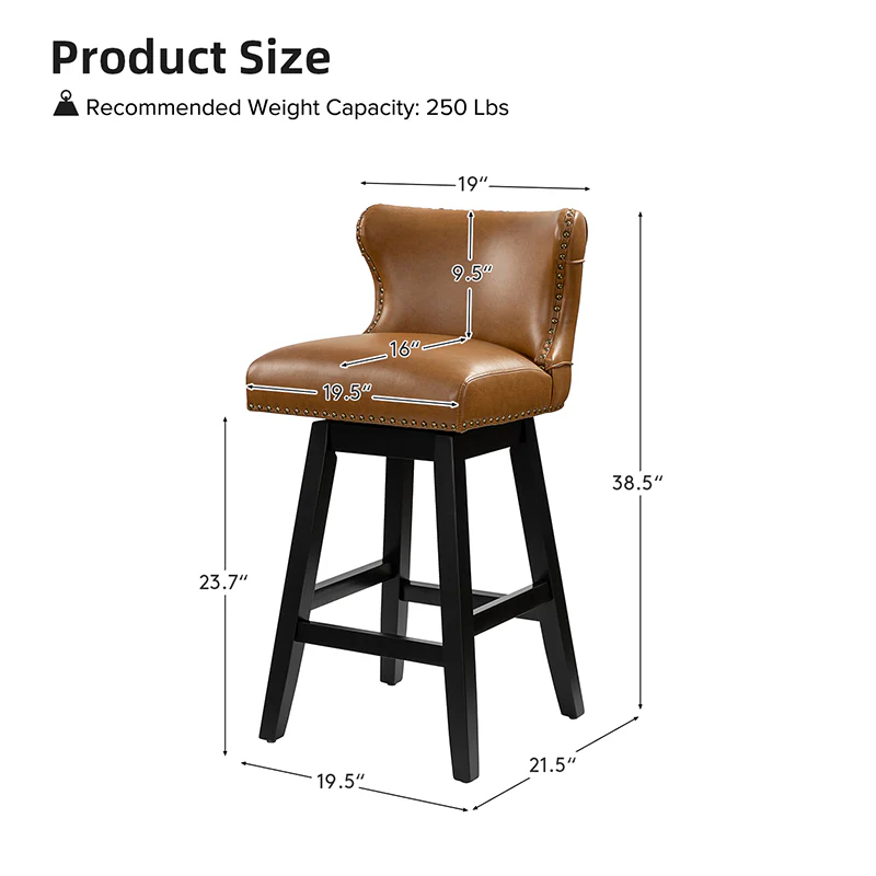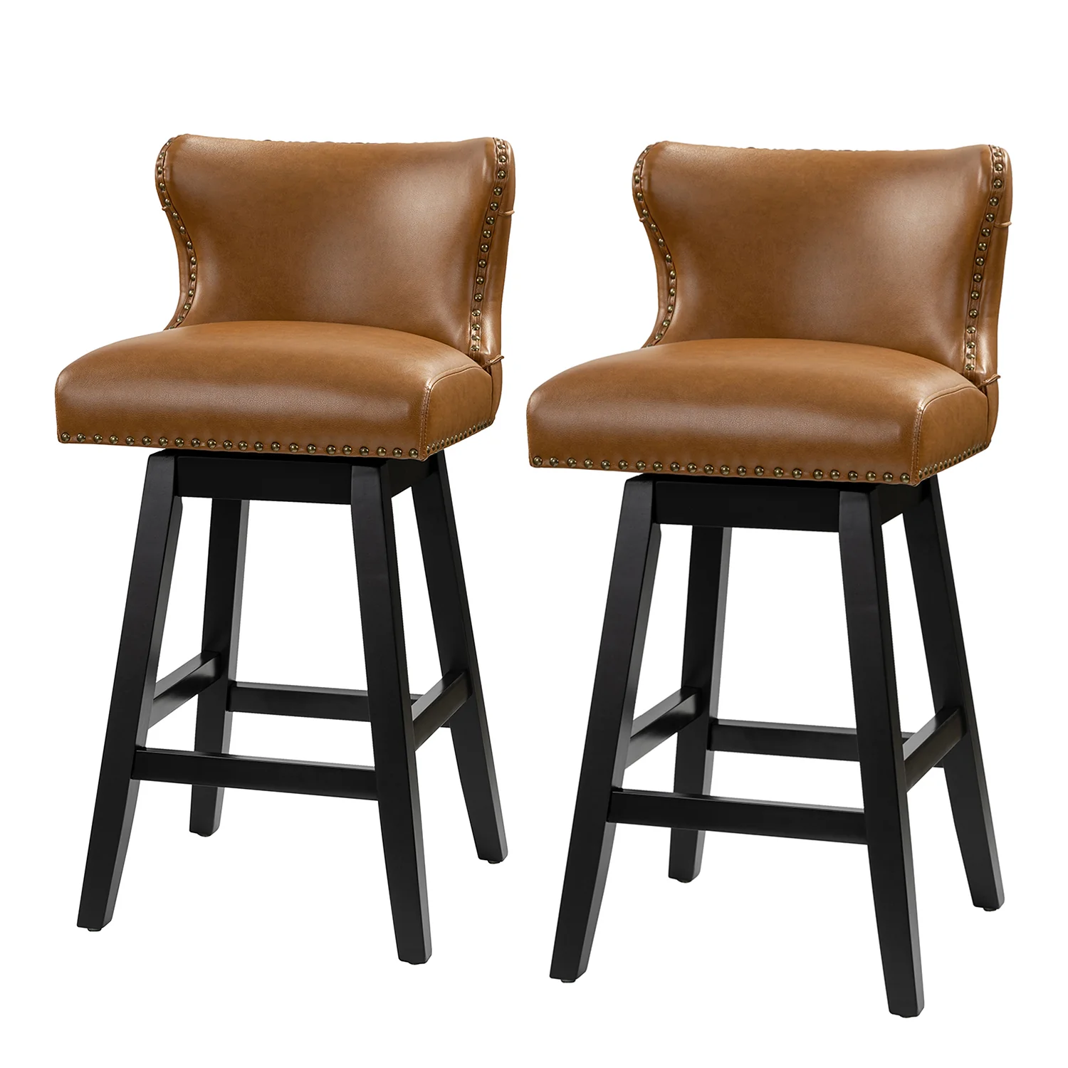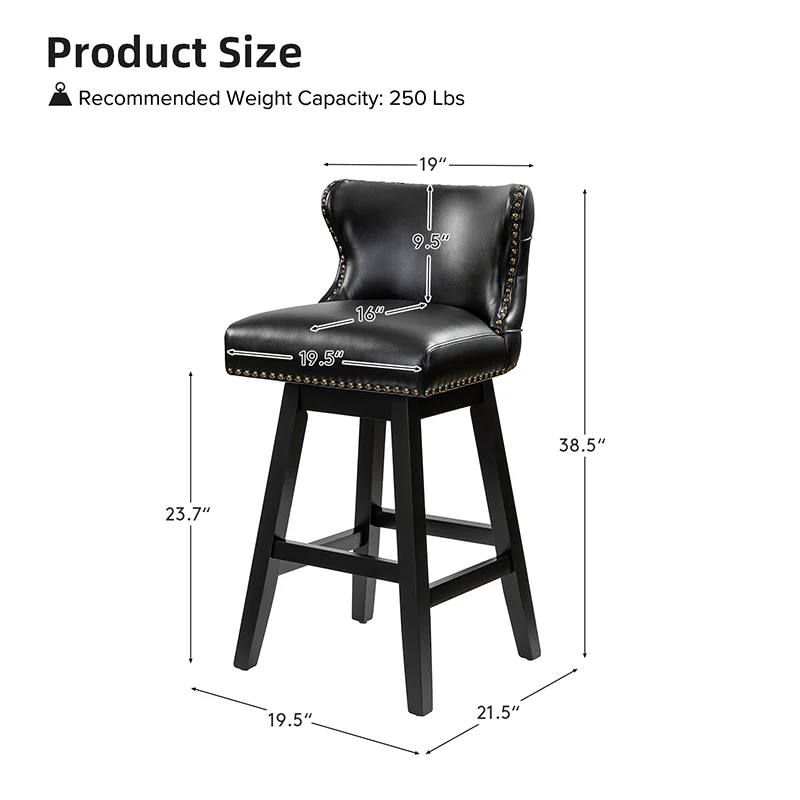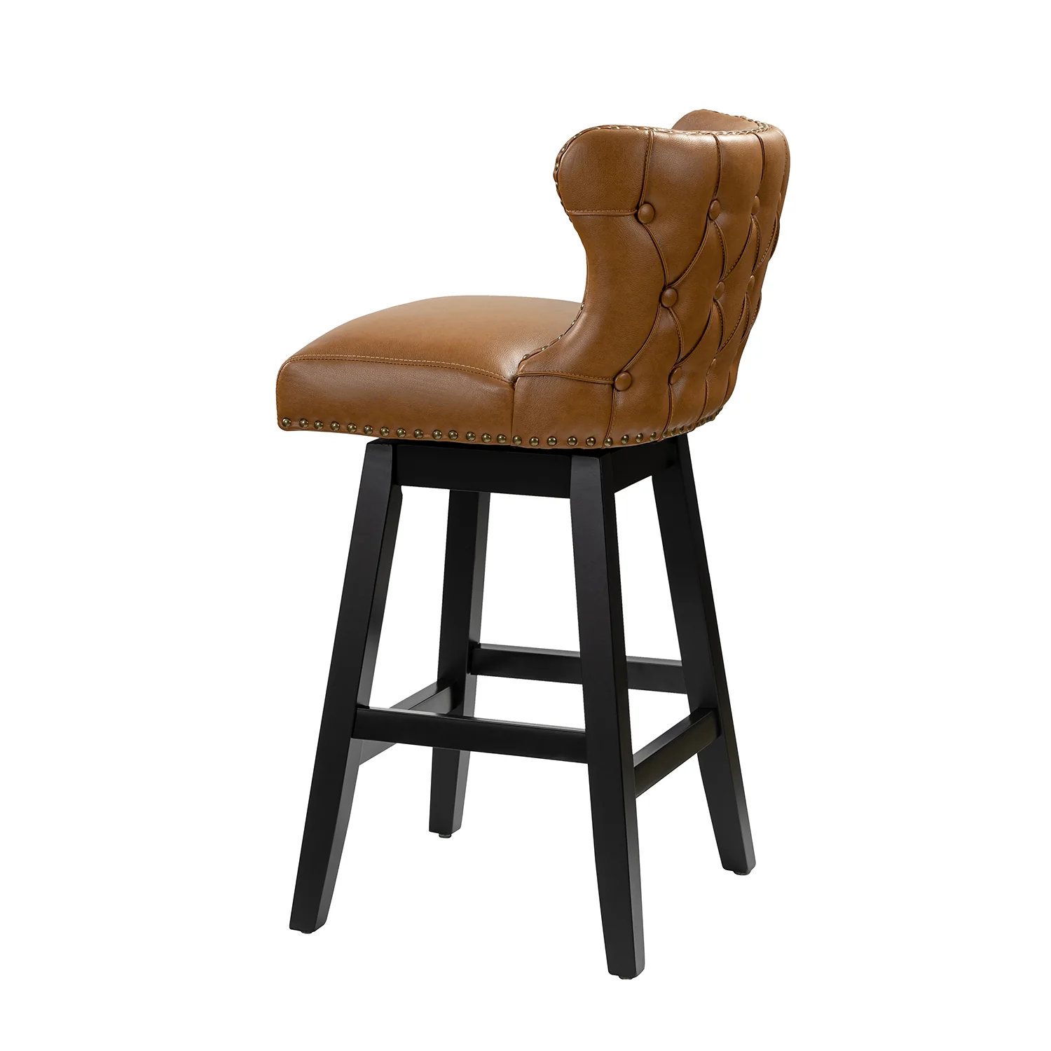 Introducing our exquisite wingback 360-degree swivel bar stool set of 2. Complements traditional, transitional, vintage, and classic home styles, these bar stools are designed to elevate your home decor. The timeless wingback silhouette, adorned with chic button tufting, creates a sense of refinement and sophistication. Adding a touch of glamour, the nail-head trim delicately frames the backrest. Crafted from smooth premium vegan leather, the traditional bar stool set is not only cruelty-free but also waterproof and resistant to oil stains, ensuring long-lasting beauty and easy maintenance. The sturdy wood footrests provide stability and comfort, while the quality foam cushioning ensures a plush and cozy seating experience. Elevate your home bar or kitchen counter with these bar stools that effortlessly blend style and practicality.