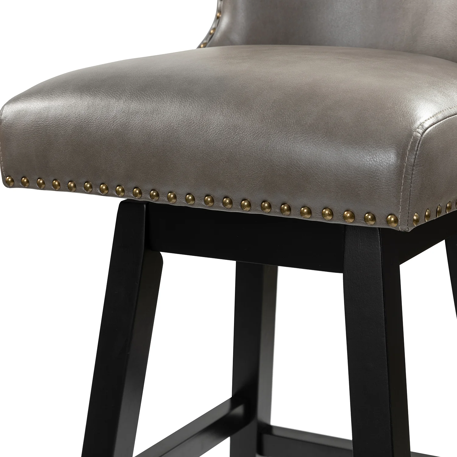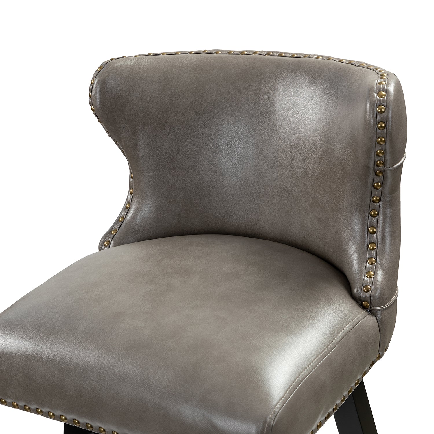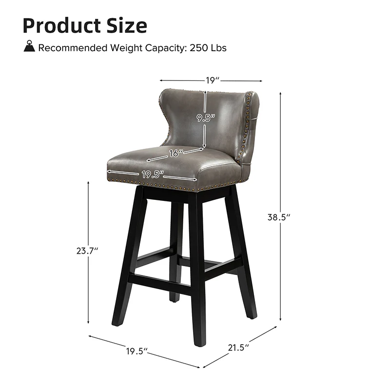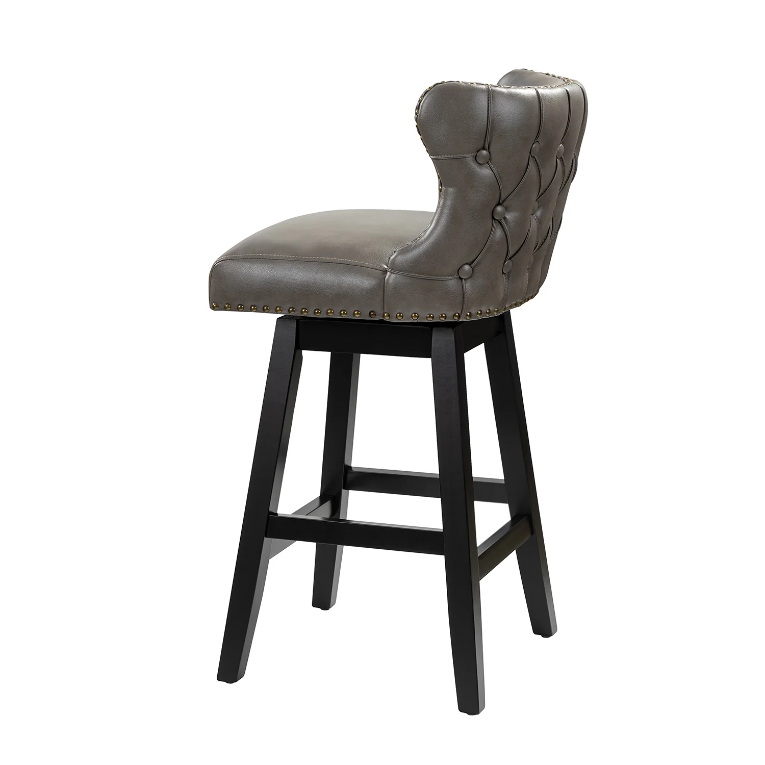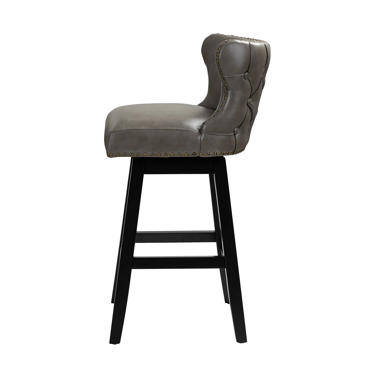 Introducing our exquisite wingback 360-degree swivel bar stool set of 2. Complements traditional, transitional, vintage, and classic home styles, these bar stools are designed to elevate your home decor. The timeless wingback silhouette, adorned with chic button tufting, creates a sense of refinement and sophistication. Adding a touch of glamour, the nail-head trim delicately frames the backrest. Crafted from smooth premium vegan leather, the traditional bar stool set is not only cruelty-free but also waterproof and resistant to oil stains, ensuring long-lasting beauty and easy maintenance. The sturdy wood footrests provide stability and comfort, while the quality foam cushioning ensures a plush and cozy seating experience. Elevate your home bar or kitchen counter with these bar stools that effortlessly blend style and practicality.