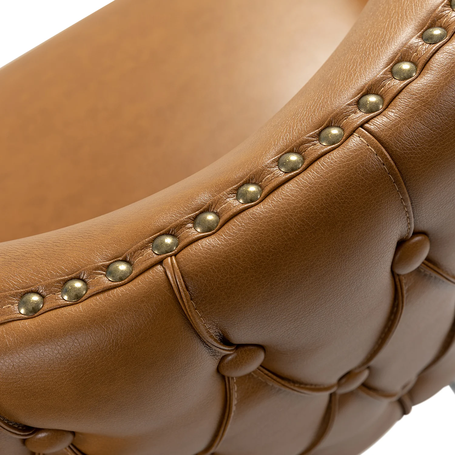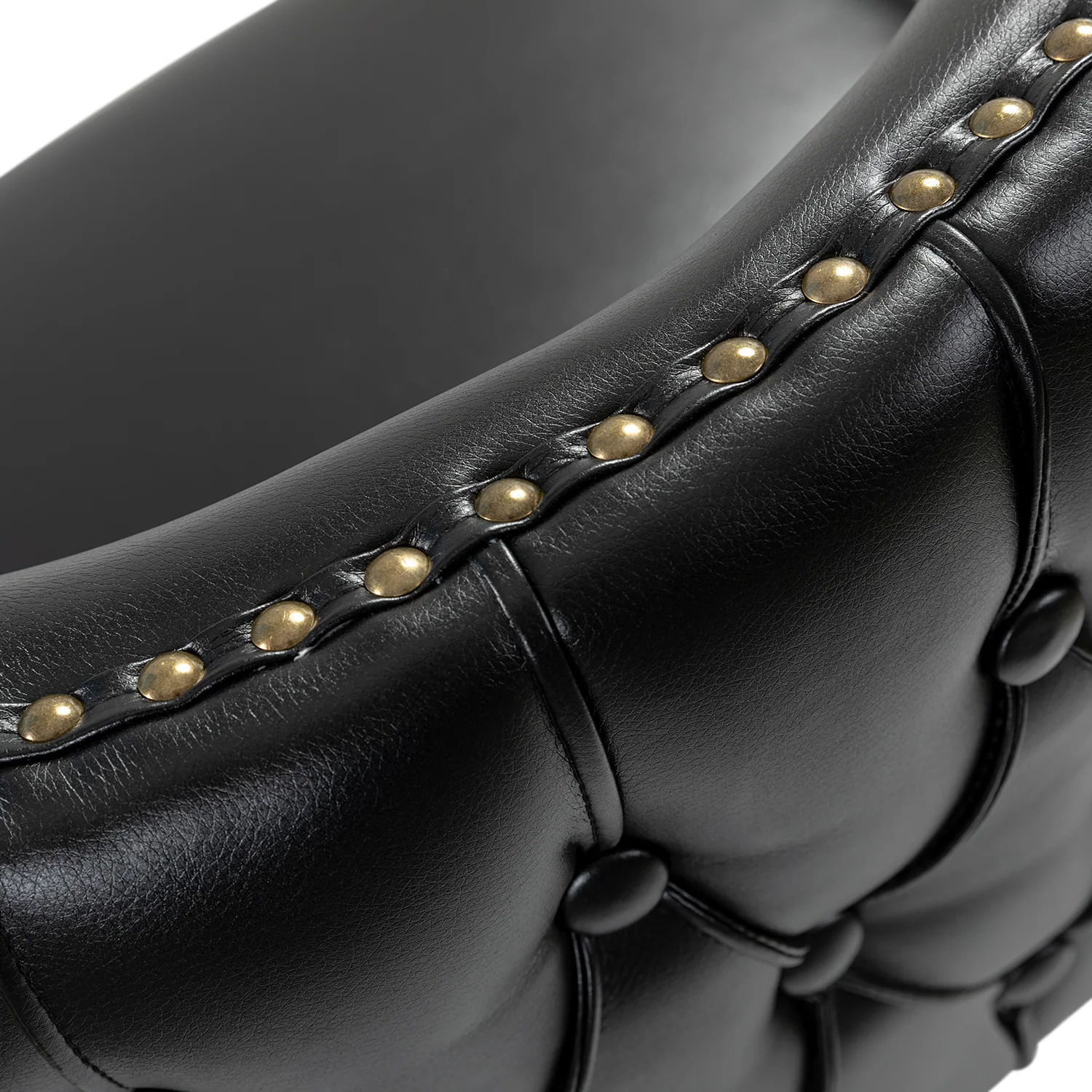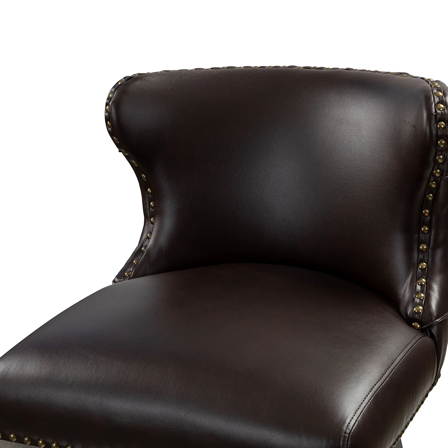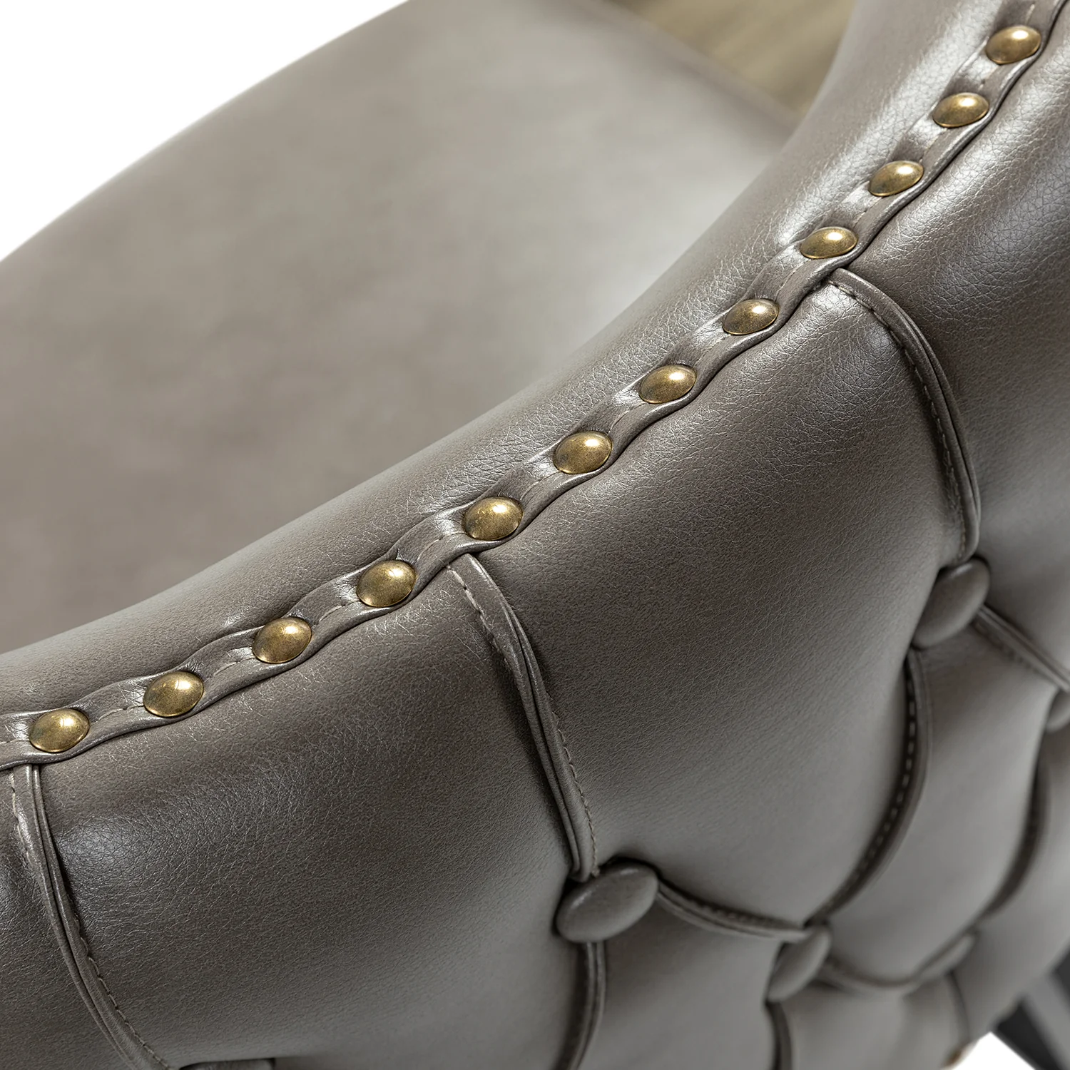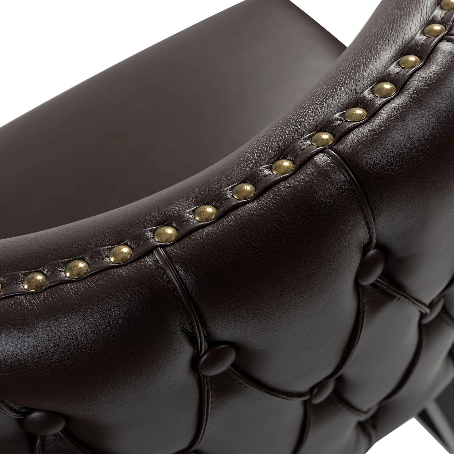 Introducing our exquisite wingback 360-degree swivel bar stool set of 2. Complements traditional, transitional, vintage, and classic home styles, these bar stools are designed to elevate your home decor. The timeless wingback silhouette, adorned with chic button tufting, creates a sense of refinement and sophistication. Adding a touch of glamour, the nail-head trim delicately frames the backrest. Crafted from smooth premium vegan leather, the traditional bar stool set is not only cruelty-free but also waterproof and resistant to oil stains, ensuring long-lasting beauty and easy maintenance. The sturdy wood footrests provide stability and comfort, while the quality foam cushioning ensures a plush and cozy seating experience. Elevate your home bar or kitchen counter with these bar stools that effortlessly blend style and practicality.