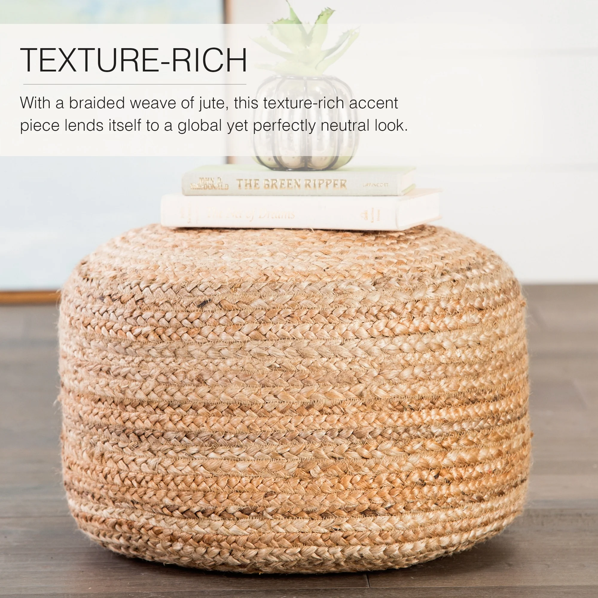 Elevate your home space with the delightfully bohemian style of the Jaipur Living Jute Pouf Ottoman. Natural fibers and a light, natural colorway make this round pouf a breezy coastal farmhouse accent in your living room or bedroom. Boasting a texture-rich cover handwoven of 100% braided jute in India, this handcrafted pouf ottoman lends natural, organic-inspired style, inviting global vibes, and long-lasting durability to any home. The braided cord design wraps around a high-quality Styrofoam bean filled cushion that provides you with the perfect amount of comfort and support under your seat or feet. Use this bohemian pouf as an ottoman or foot stool, spare seating, accent table, or decorative accessory to incorporate a coastal piece into your home decor. With a wide array of both solid and two-tone color options, it's easy to get just the right look to fit you and your space.
