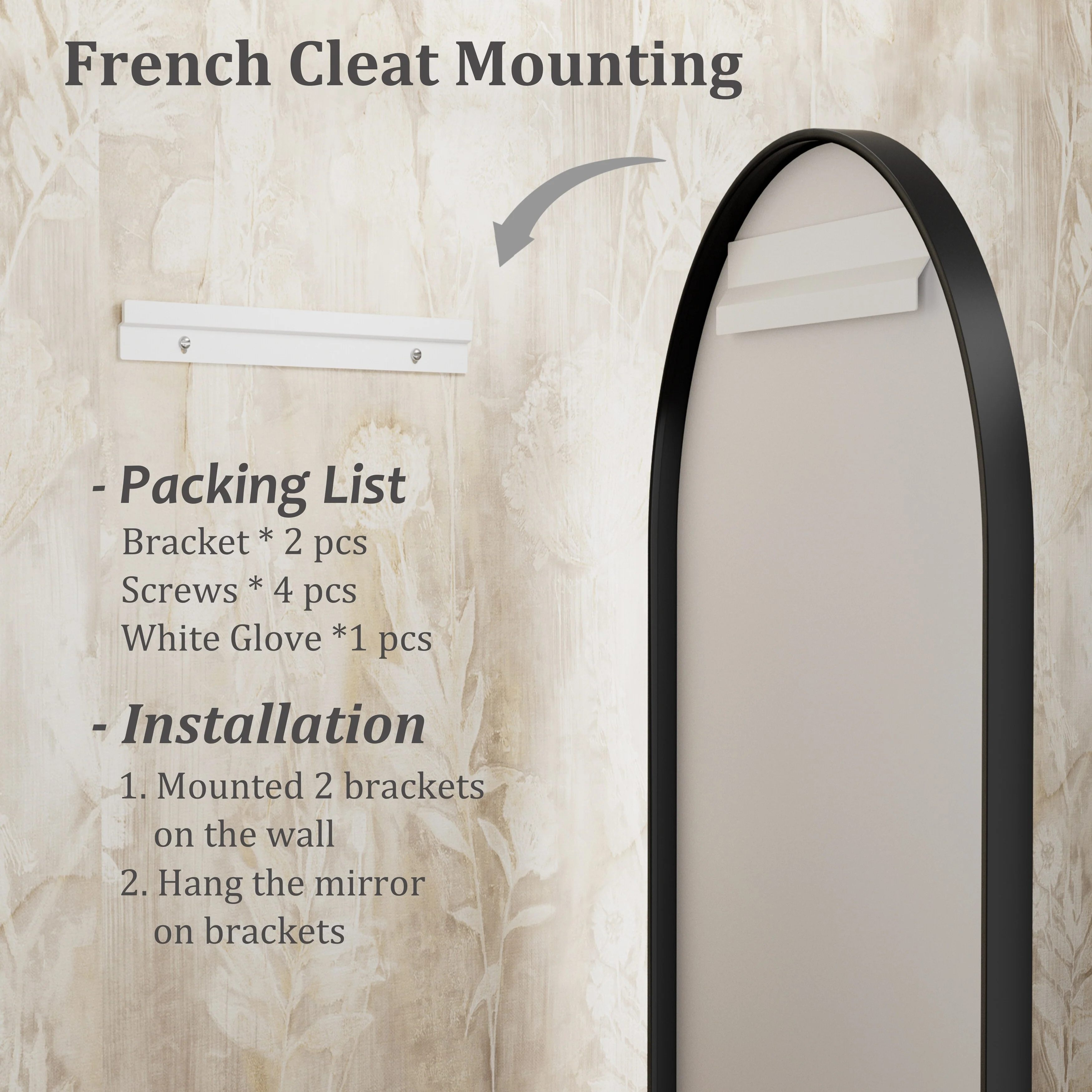 • Easy French Cleat Mounting:Install the bracket to the wall using the included screws and anchors and then just hang the mirror on. (The mirror can be removed from the bracket and leaned against the wall as ornaments.)