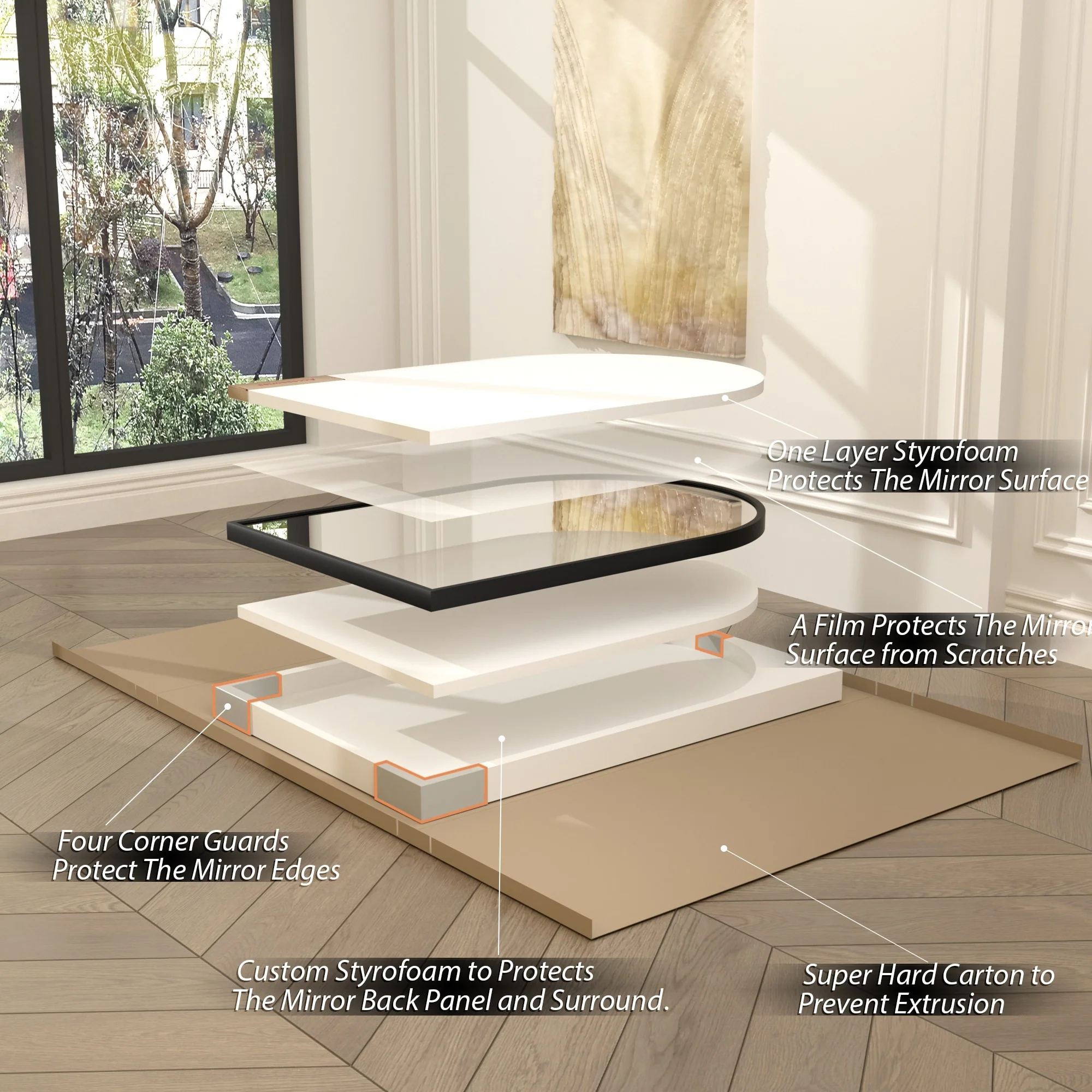 • Professional Packaging: Each mirror is made to a secret standard and secured with customized thick foam and sturdy corner guards in a carton box. Before delivered, it passed all rigorous tests including dropping, impact test, etc. Only for you to provide the perfect mirror.