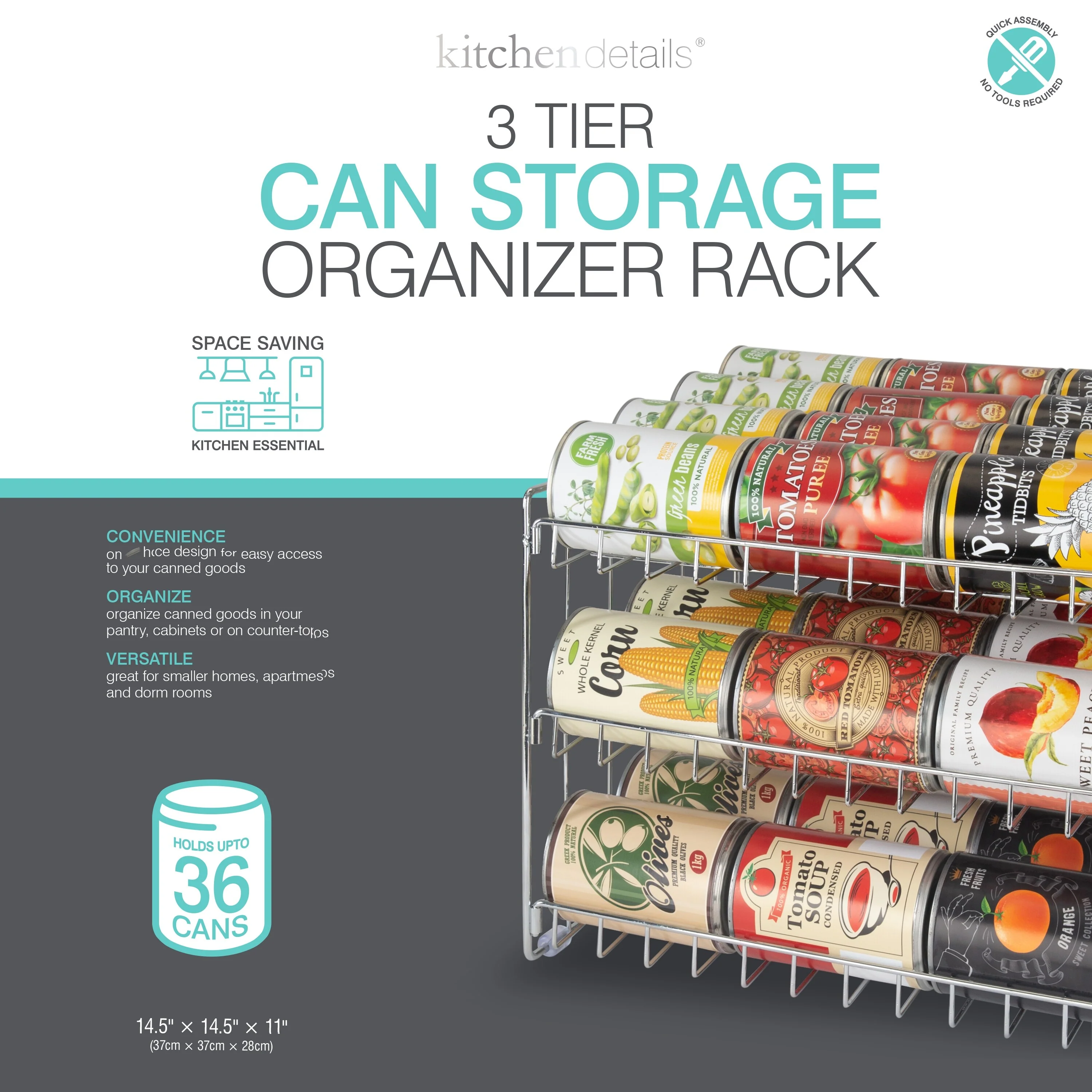 Maximize your space in your cabinets or pantry with the Kitchen Details can organizer storage rack. A smart and convenient design of 3 tier steel rack with open face design that allows you to easily see all your canned goods and safely remove when needed. Holding up to 36 standard size cans the space saving design automatically frees up wasted space.