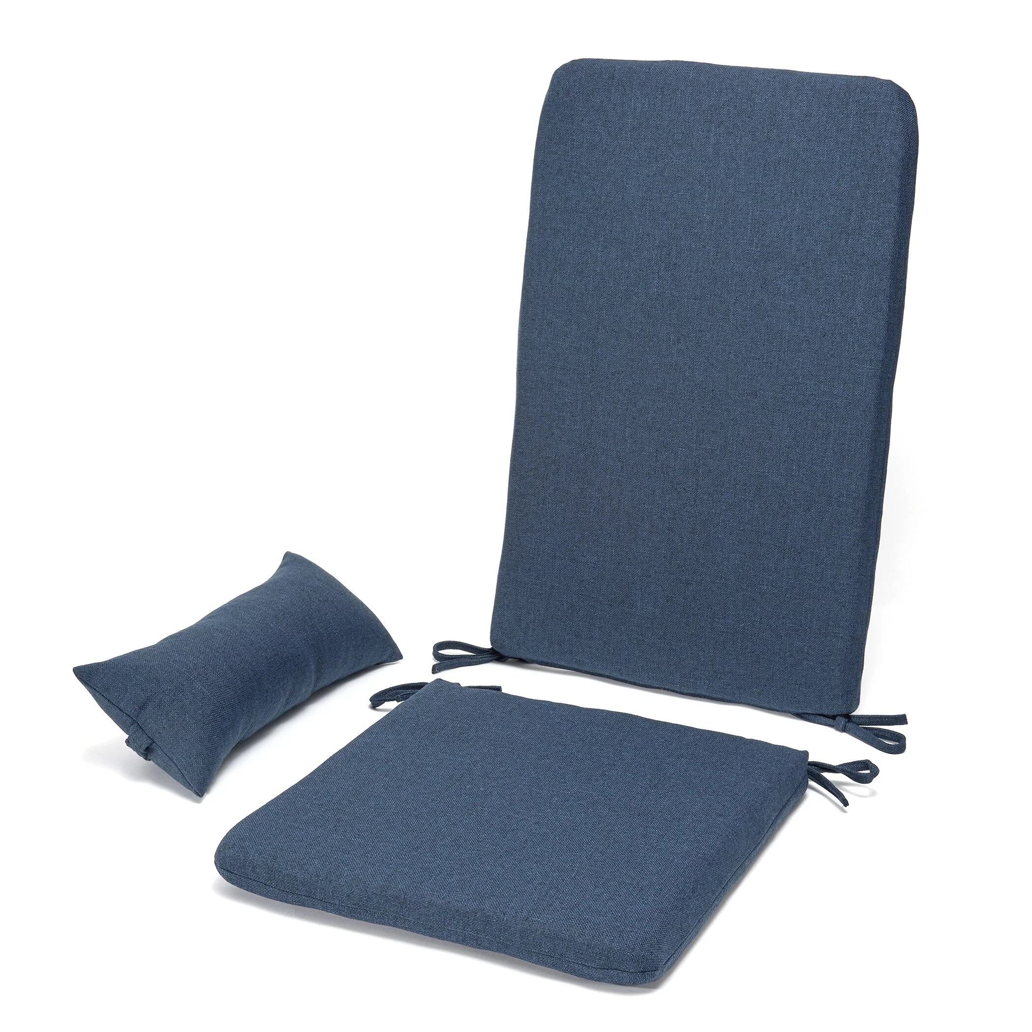 Elevate your outdoor seating with The Wellfleet Bay Set by Klear Vu. This 3-piece set includes a seat cushion, back cushion, and headrest/lumbar pillow, all secured with ties for added convenience. Covered in a woven performance fabric with a water-repellent wax-based finish, these cushions are highly resistant to UV rays and stains, making them perfect for outdoor use. With a modern design and available in natural, grey, tan, and indigo blue, this USA-made set will enhance any space.