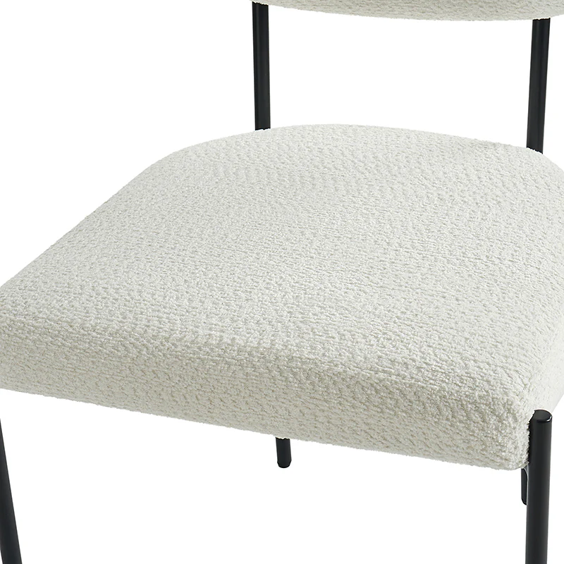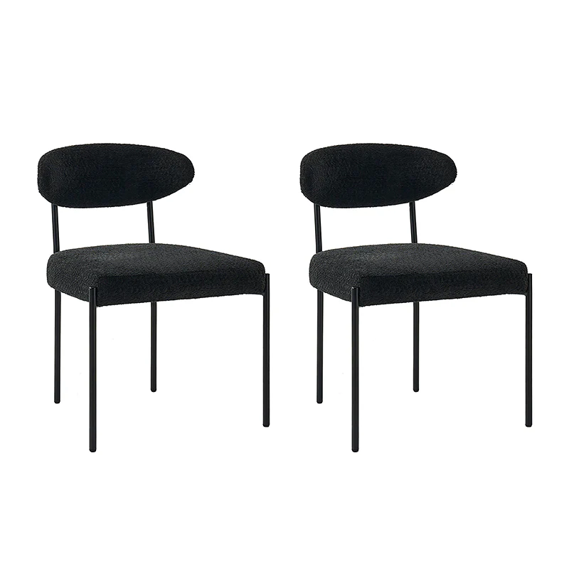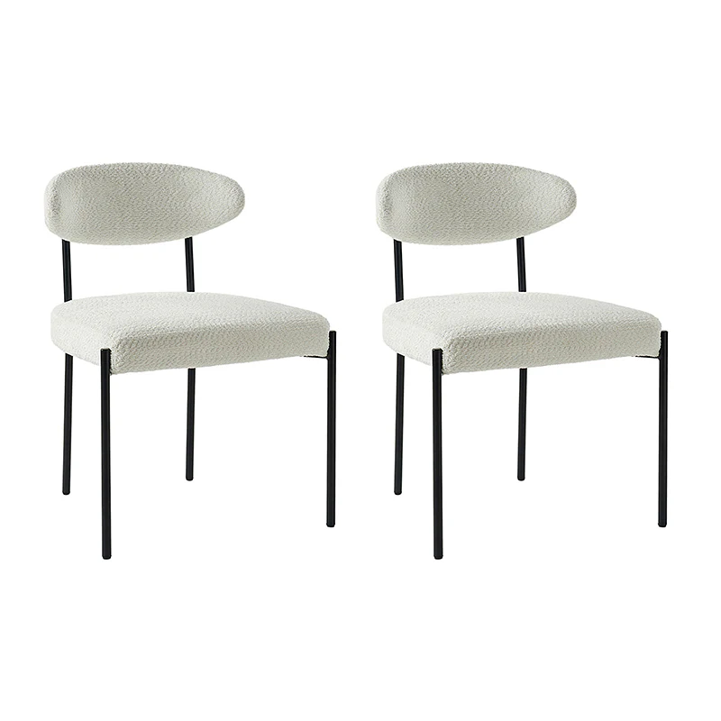 Indulge in modern elegance with this Scandinavian-inspired dining chair set of 2. Crafted with contemporary flair, its sleek metal legs with adjustable feet provide stability and a touch of sophistication. The chair set of 2 features a distinctive curved backrest for added comfort and style. Embrace luxury with the plush lamb wool upholstery, ensuring a cozy and inviting atmosphere in your dining room, kitchen, or living room. The armless design promotes a minimalist aesthetic, while the removable and washable short plush boucle fabric seat cover adds practicality to your lifestyle. If you need to remove and wash the seat cushion, please remove the chair legs first. Elevate your dining experience with this modern design and comfort fusion, where form seamlessly meets function.
