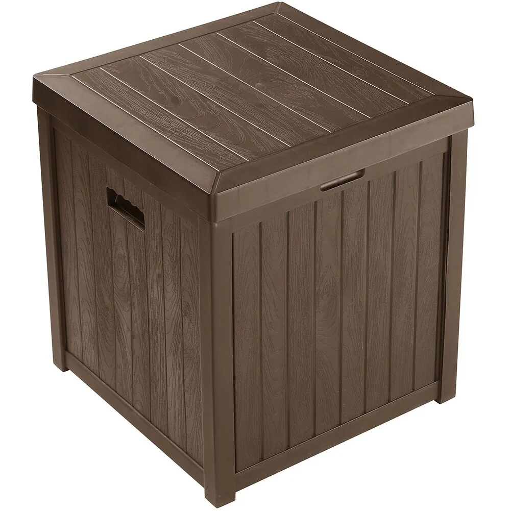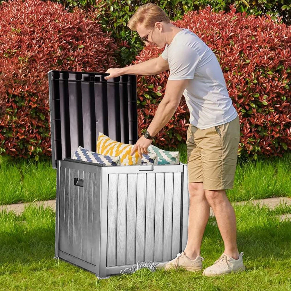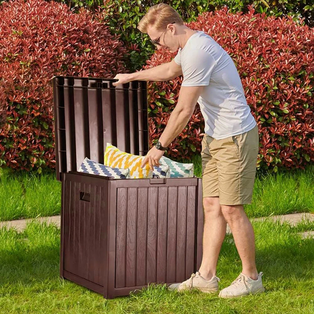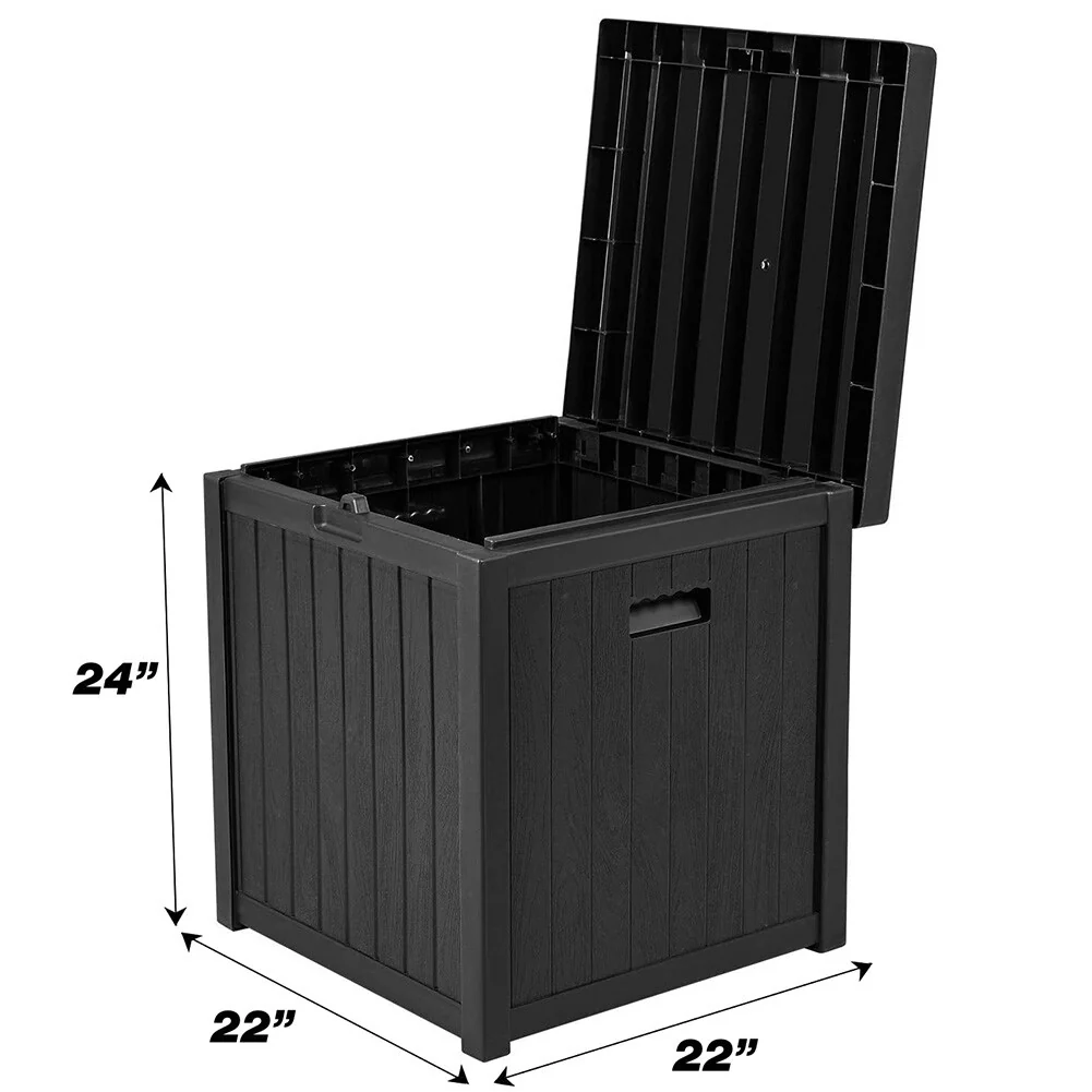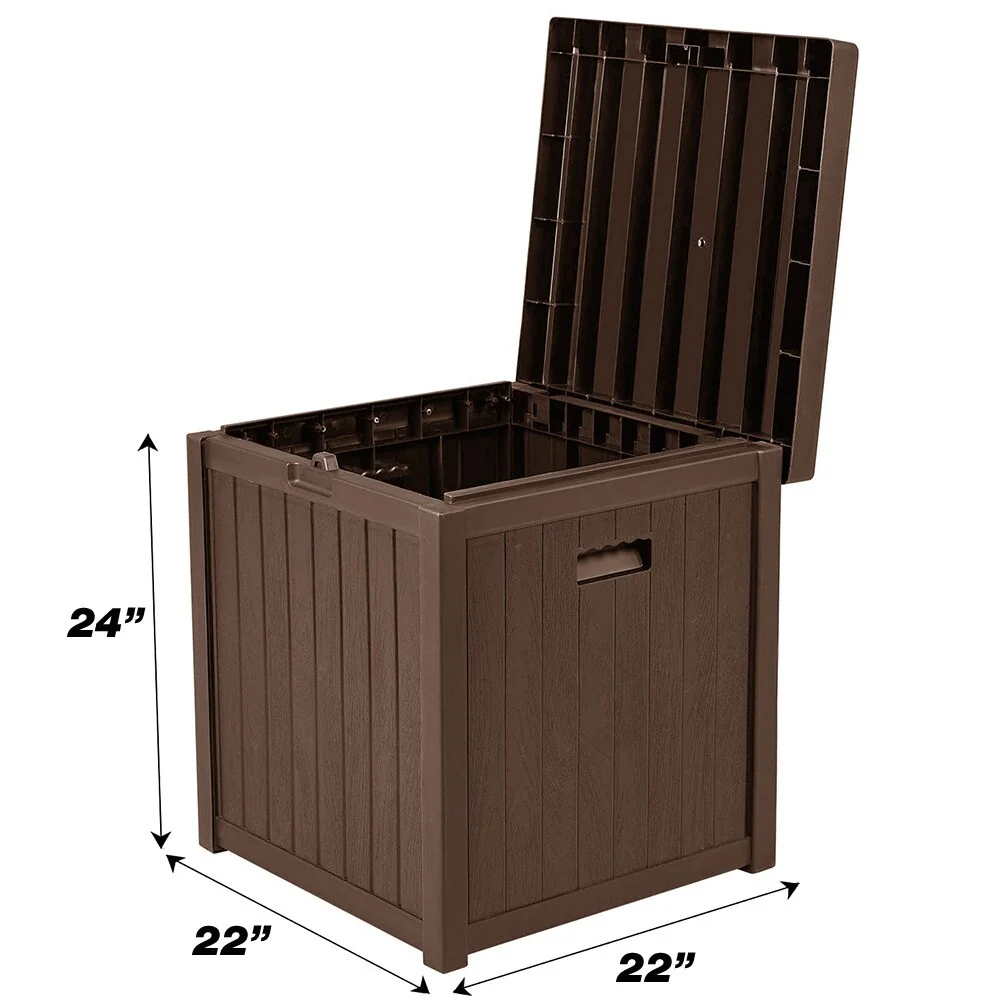 The Modern Home La Jolla Weatherproof Outdoor 51 Gallon Storage Deck Box w/Lid provides a generous amount of space to neatly store your outdoor pillow, furniture cushions, garden accessories, pool toys and more. Constructed of durable, weatherproof resin, each deck bin features a hinged lid that keeps the rain out and the contents protected year-round. Our deck box features a wood grain finish that is resistant to fading, and peeling and is durable to last for many years. also serves as a perfect outdoor ottoman as it is easily movable with built-in handles for easy lifting. Use it as a simple storage ottoman anywhere you need it. No tools are required for easy assembly in only a few minutes. Measures 22" x 22" x 24".